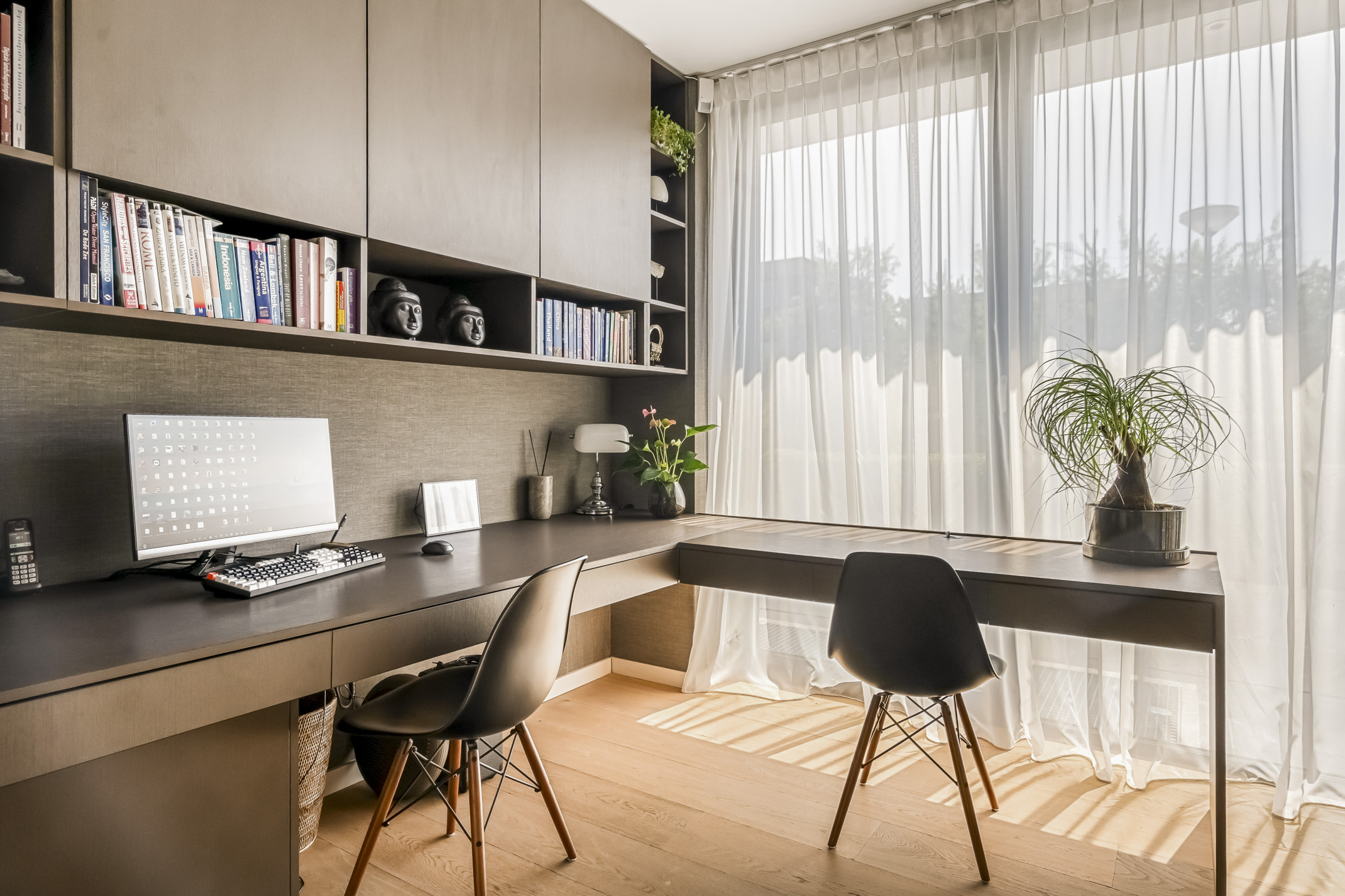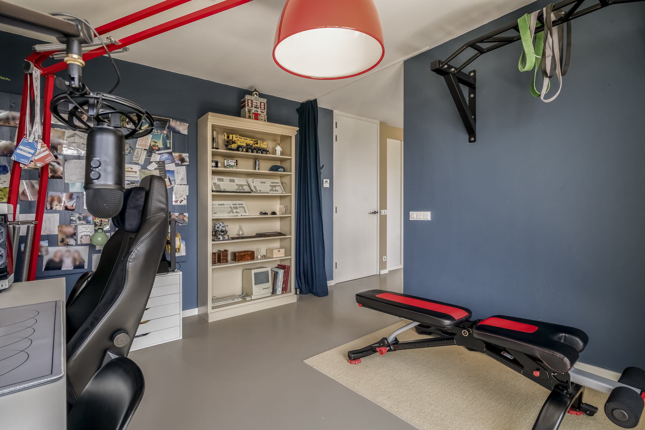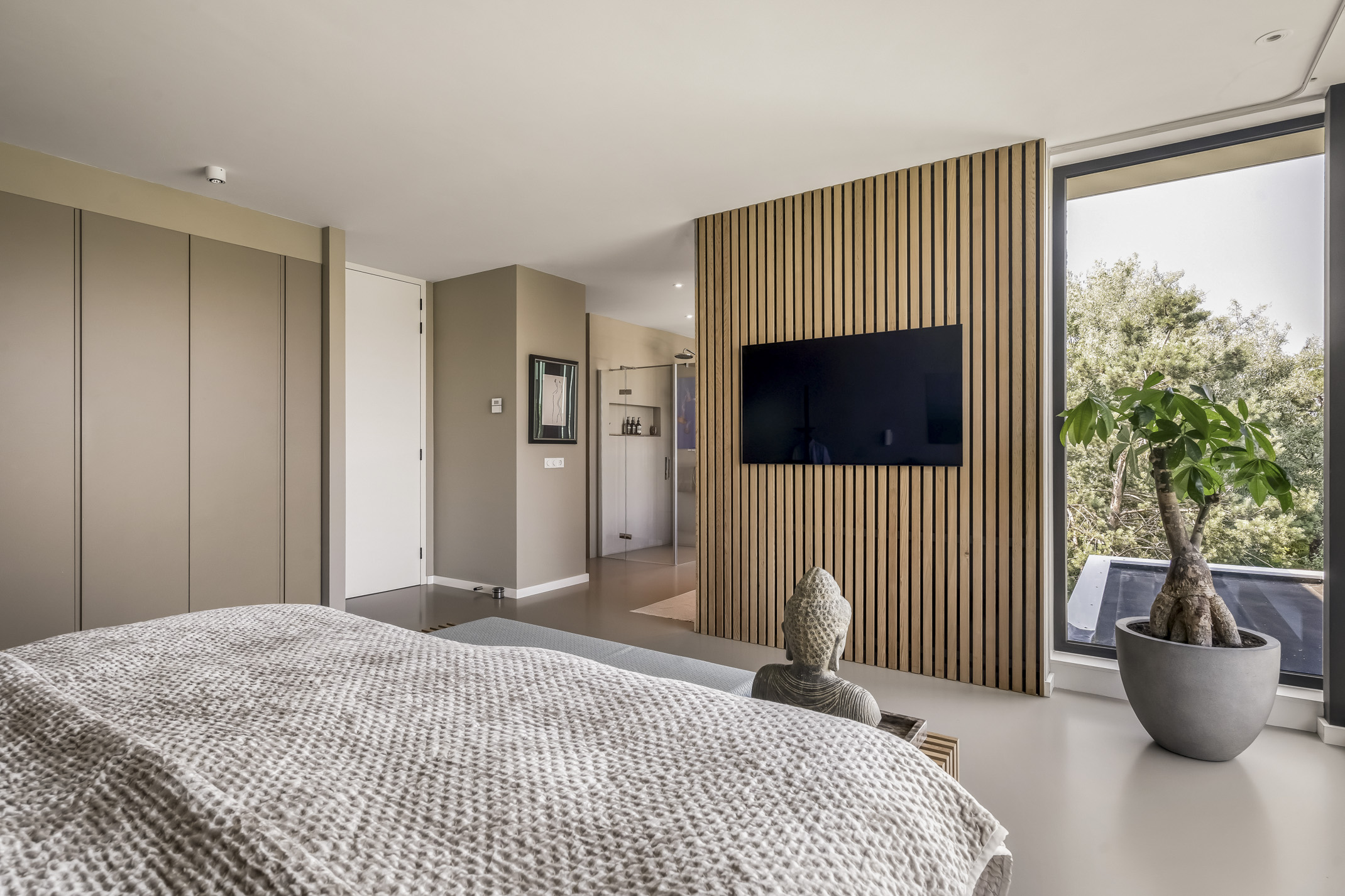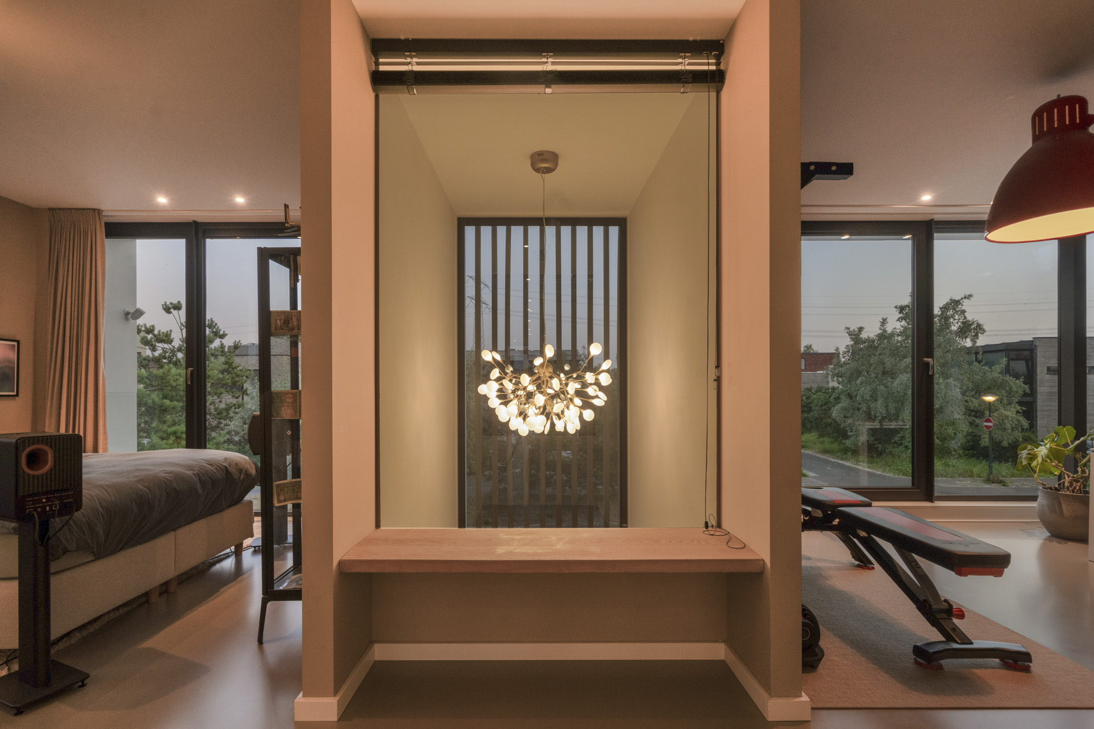 The spacious bedroom at the front can easily be divided into two bedrooms and offers a nice view of the entrance. This room is equipped with electric screens.