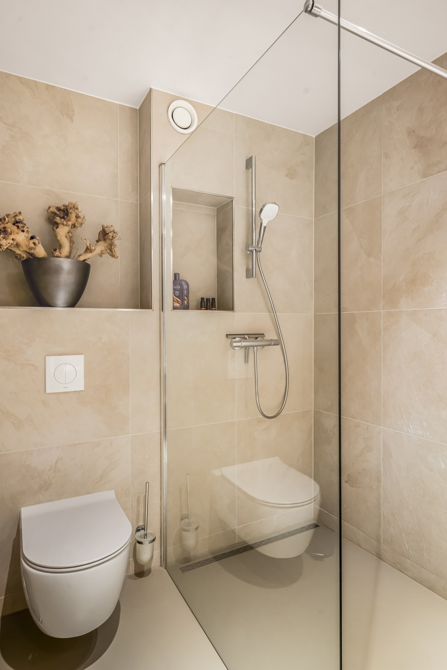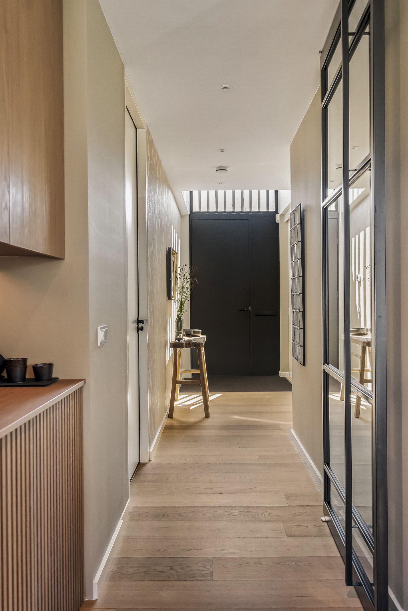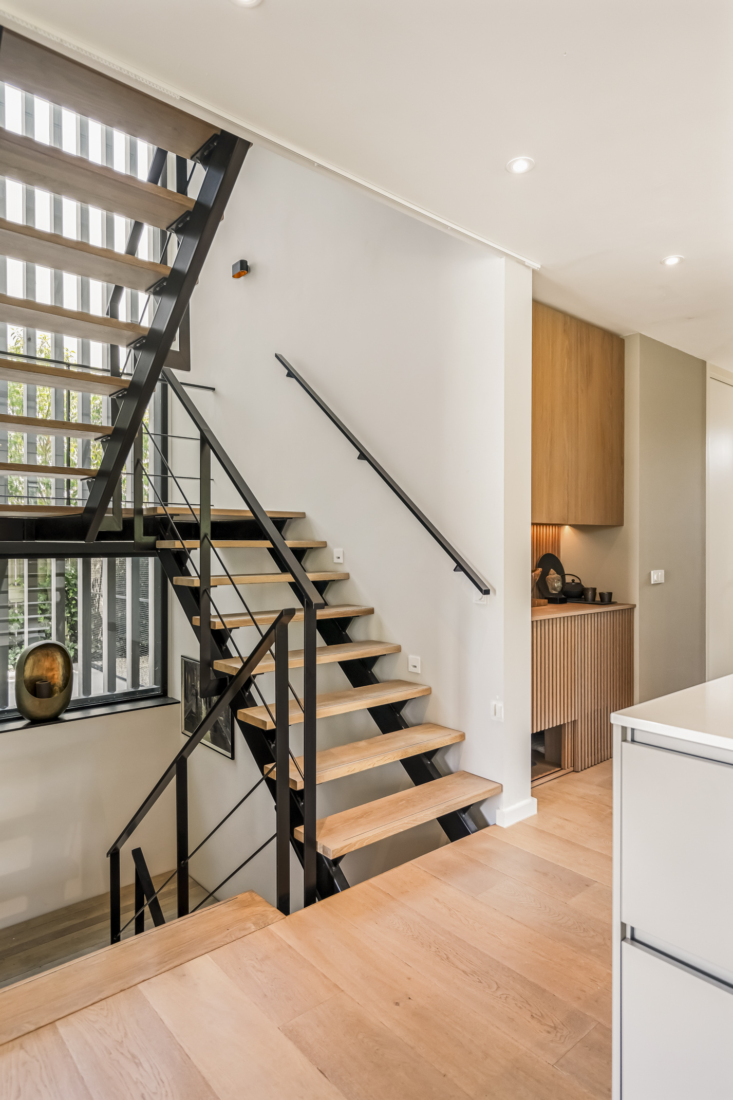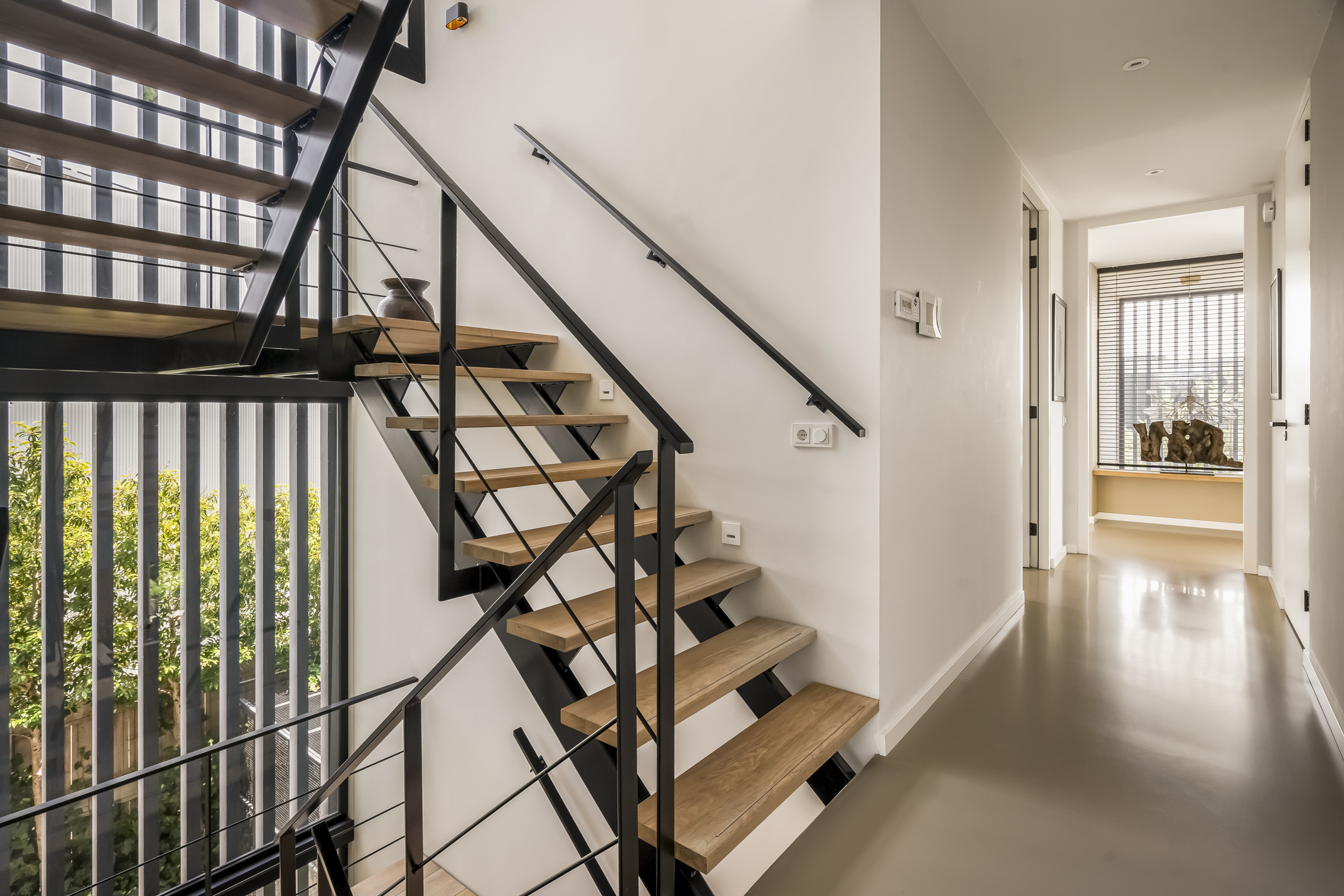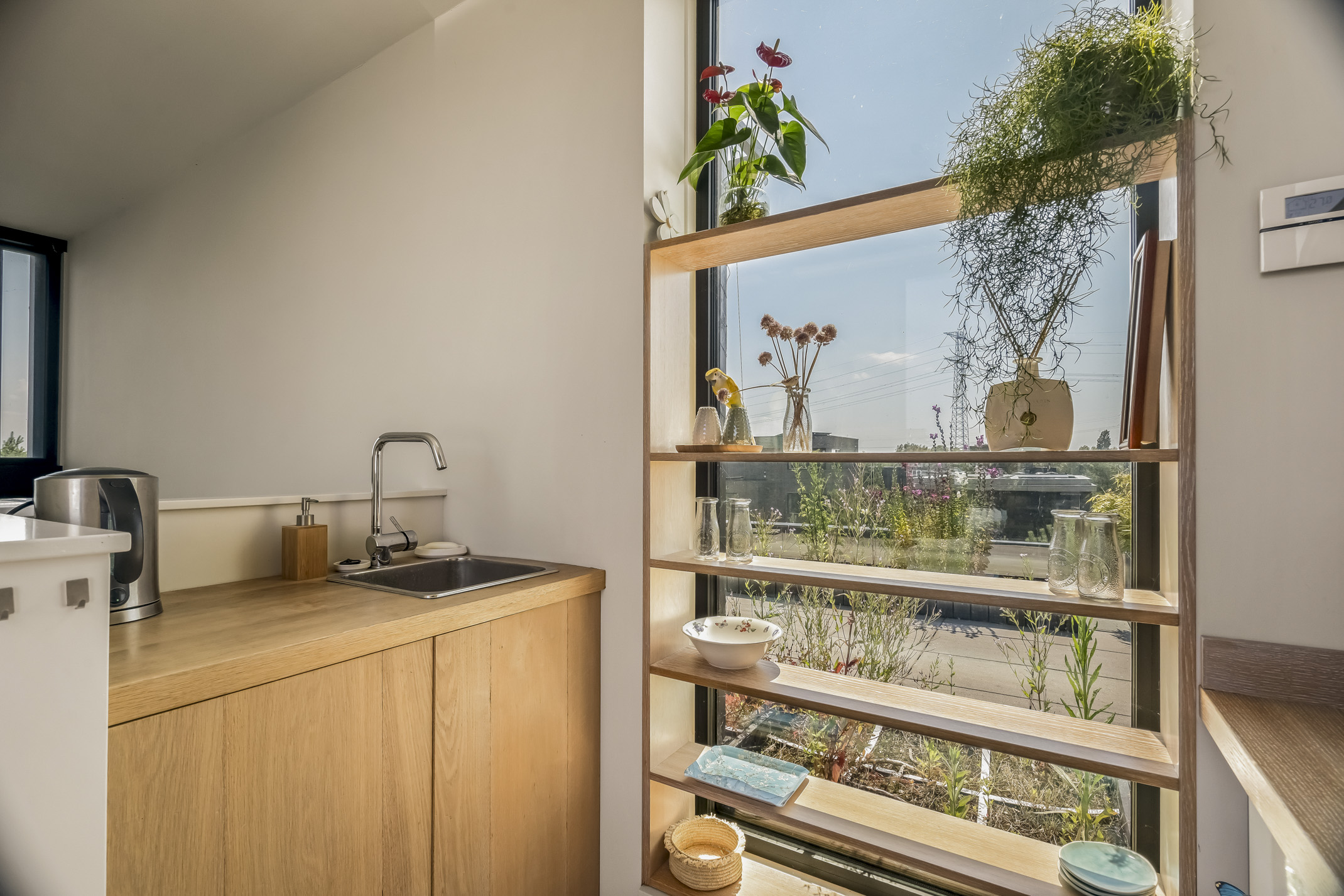 The second floor provides access to the sunny rooftop terrace with unparalleled privacy. On the landing, there is a kitchenette with a fridge and sink.
