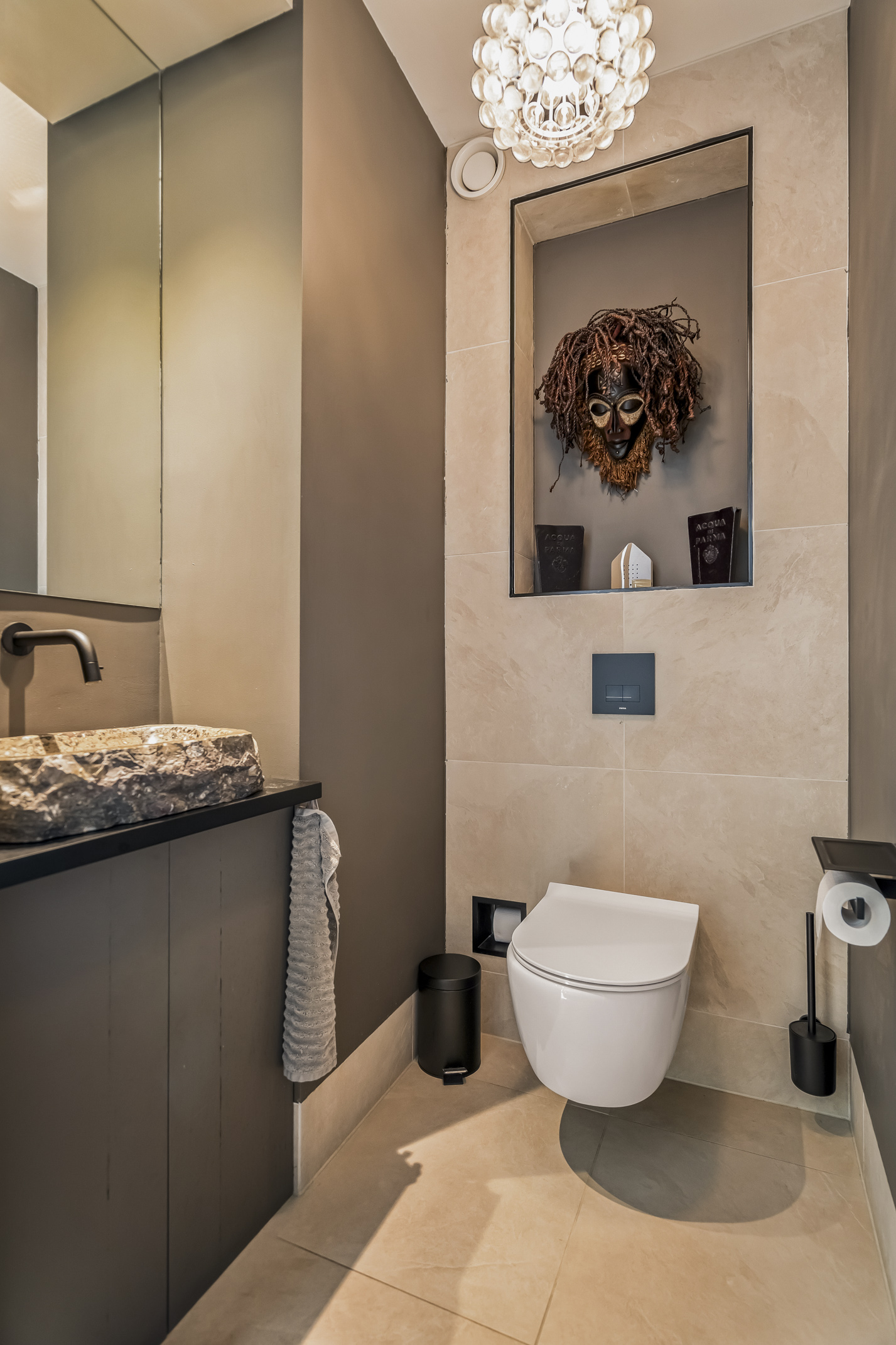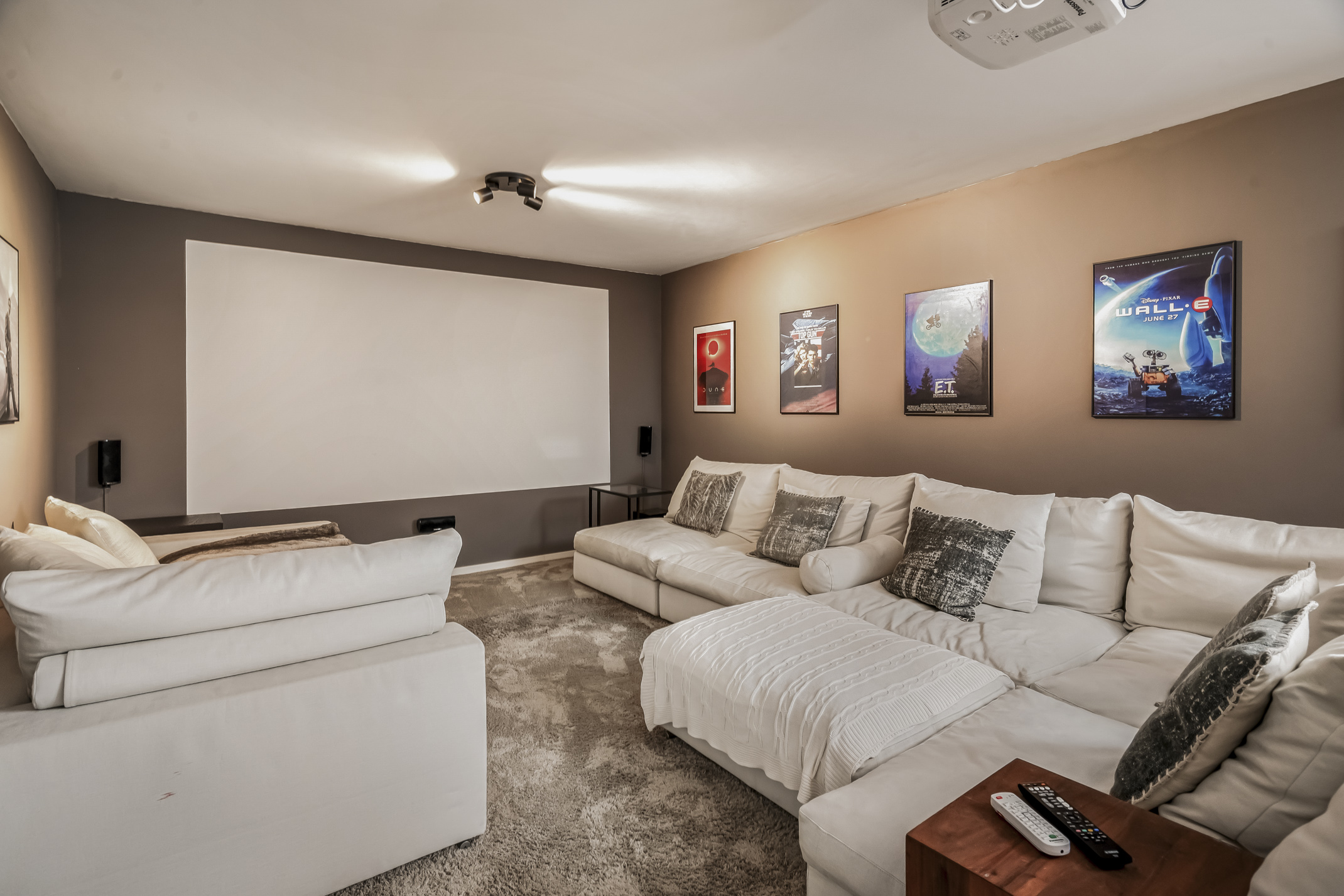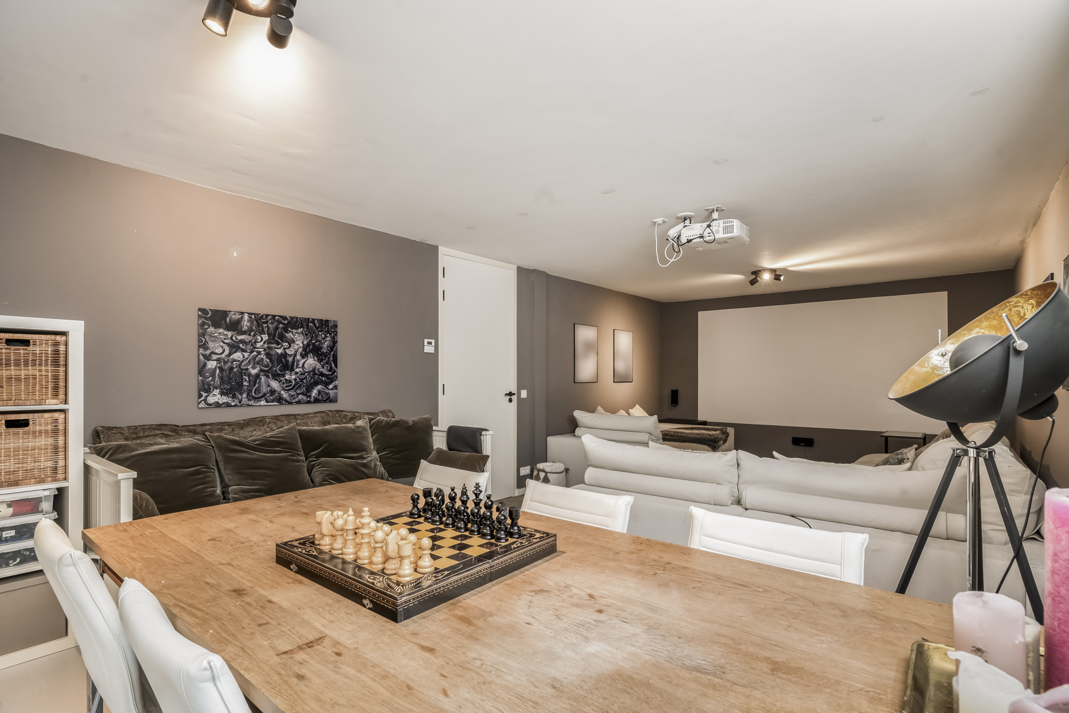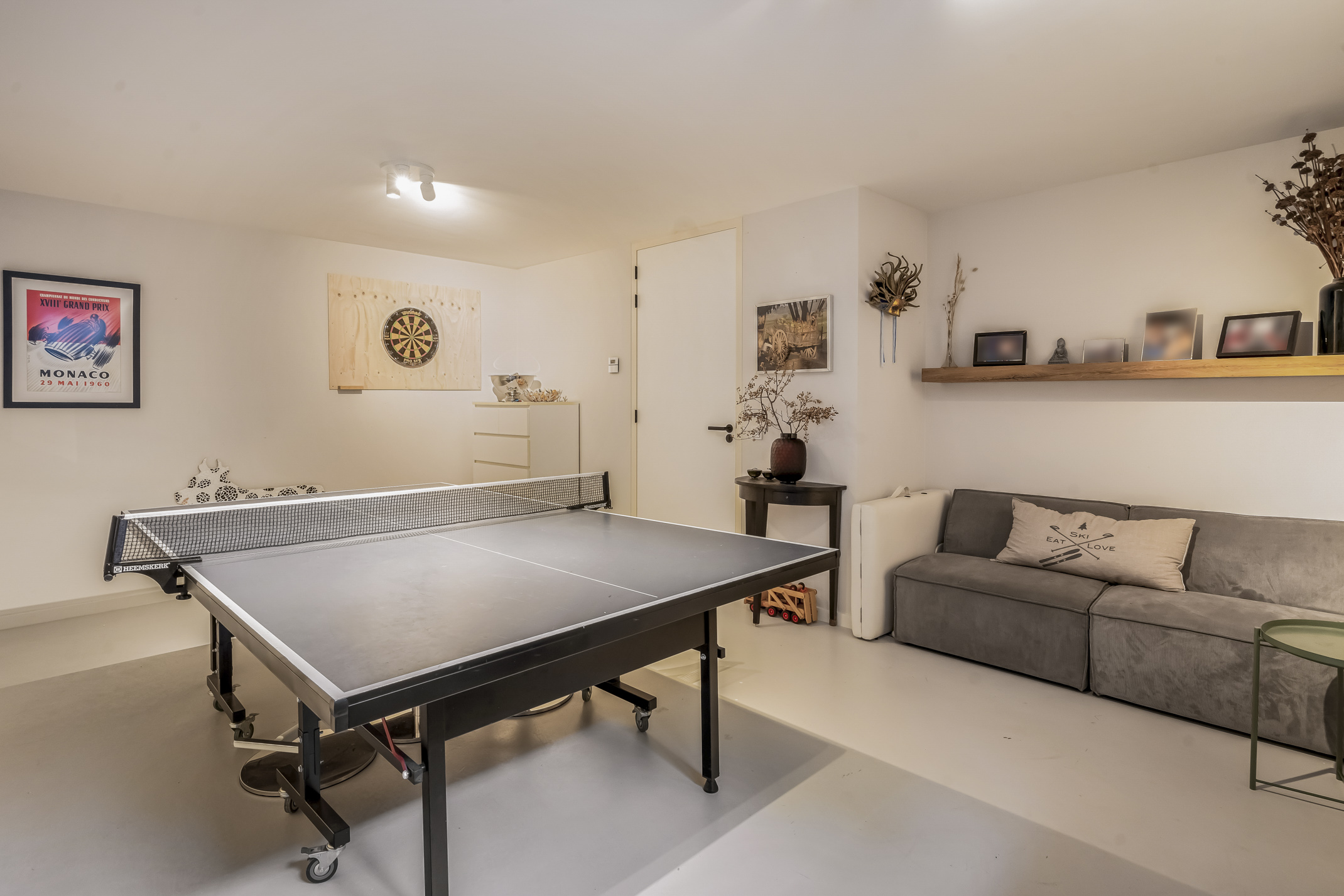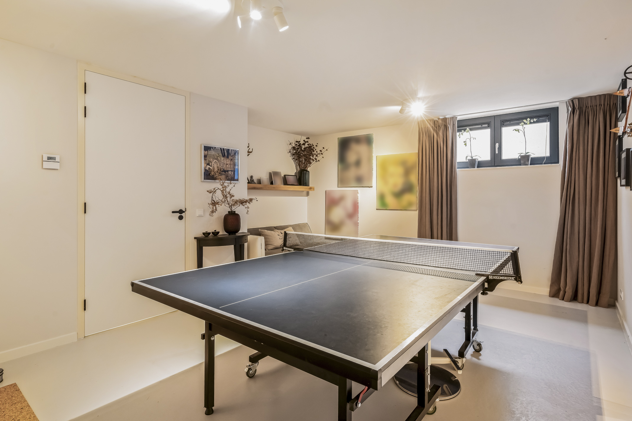 This full-fledged floor with daylight houses a home cinema, guest room, room with a ping pong table, the technical room, storage space and the third bathroom. The bathroom features a toilet, sink and walk-in shower.