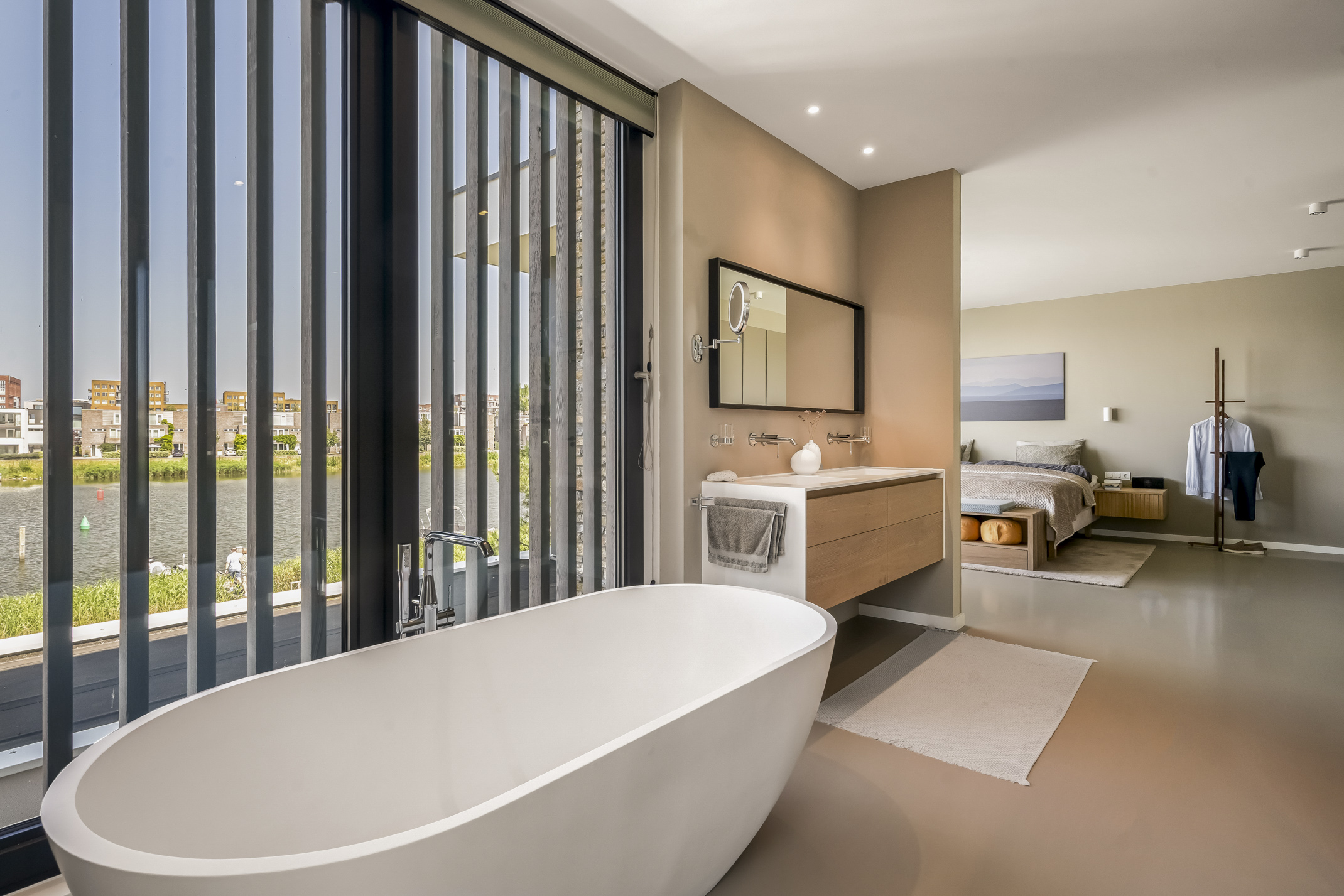 All rooms are accessible from the landing. This floor features a modern poured floor. The master suite at the rear offers a breathtaking view over the water, a walk-in closet and an en-suite bathroom. The bathroom is equipped with a shower, an Aquaclean Geberit toilet, double sink vanity and a freestanding bathtub with the same view. From the bathroom, there is direct access to the spacious walk-in closet.