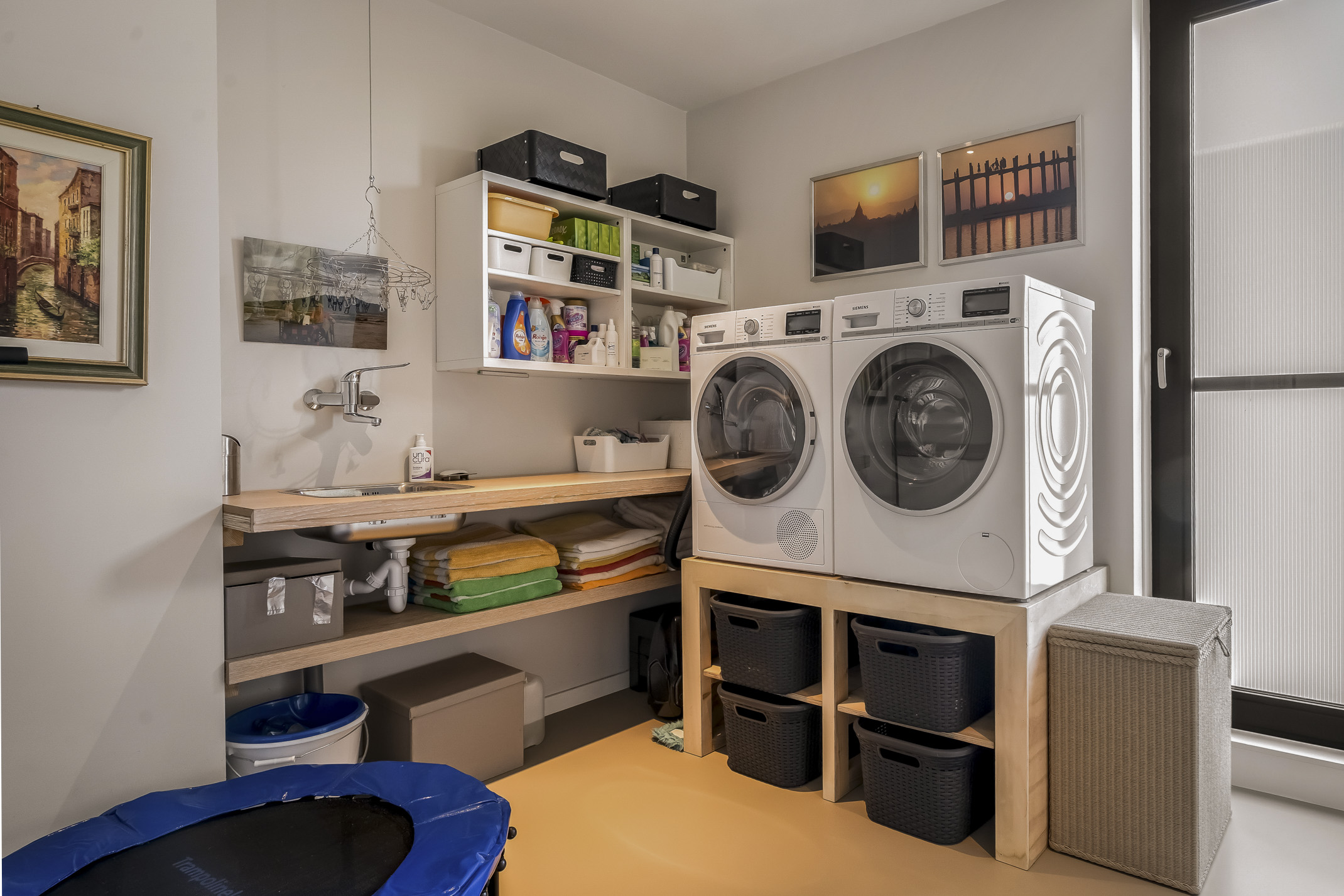 The intermediate bedroom is currently set up as a laundry room but is also very suitable as a bedroom. The second bathroom on this floor features a walk-in shower, toilet and vanity unit.