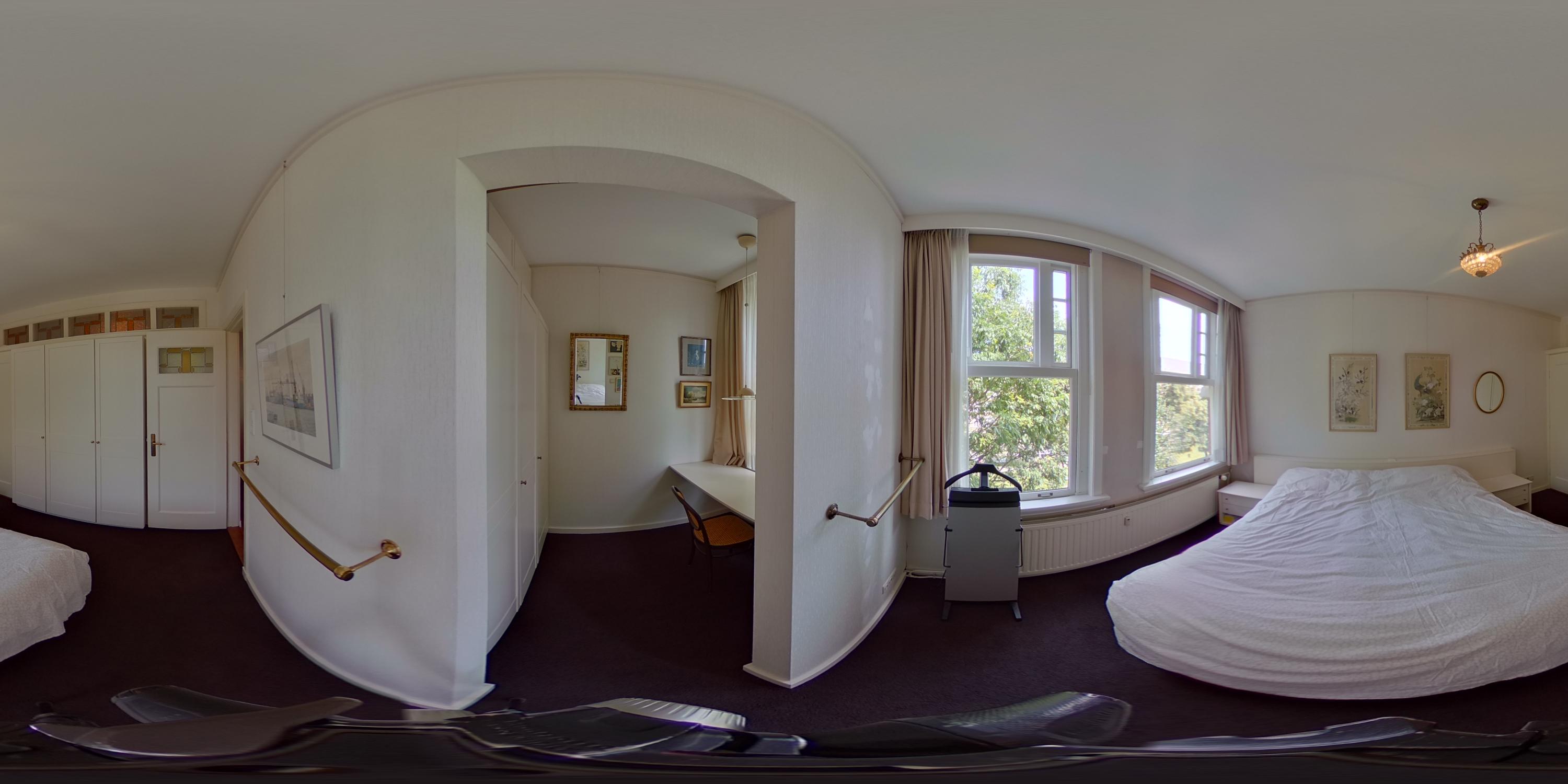 Spacious entrance hall providing access to all rooms. There is a coat closet in the hall, along with the meter cupboard and a separate toilet with a small sink. At the front, a generously sized bedroom features a walk-in closet and several built-in wardrobes. At the rear, the large main bedroom opens through French doors onto the west-facing balcony, offering views of the beautifully landscaped and well-maintained inner gardens of Minervalaan and Michelangelostraat.