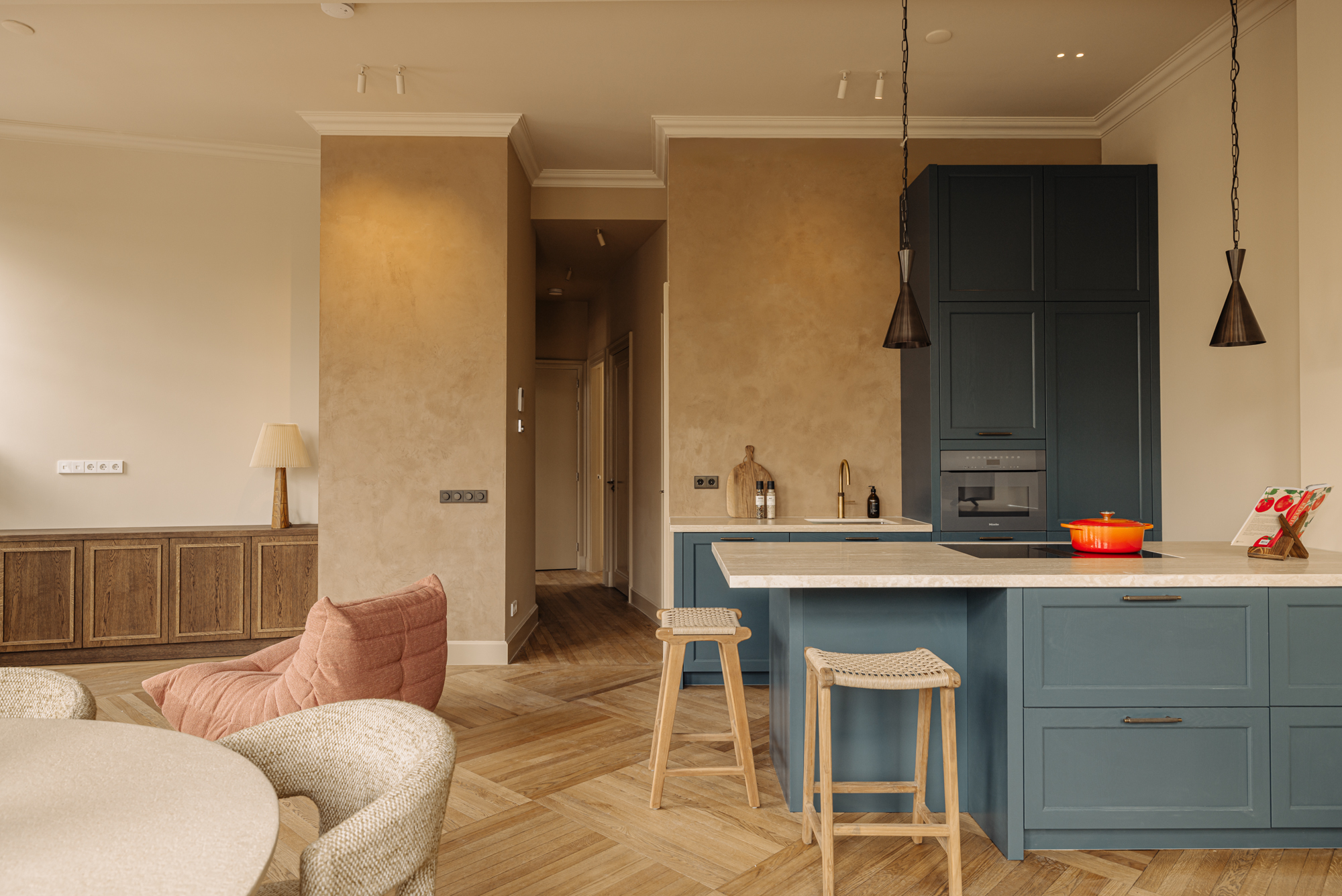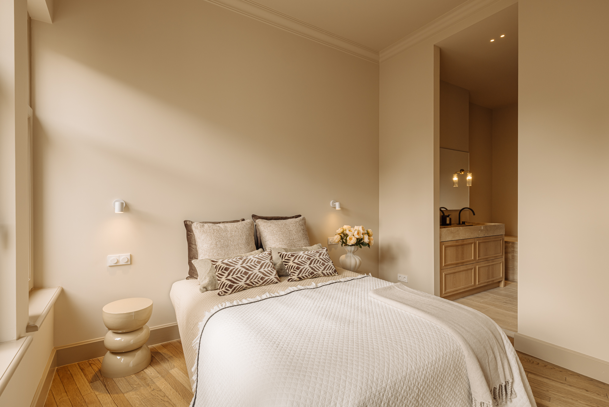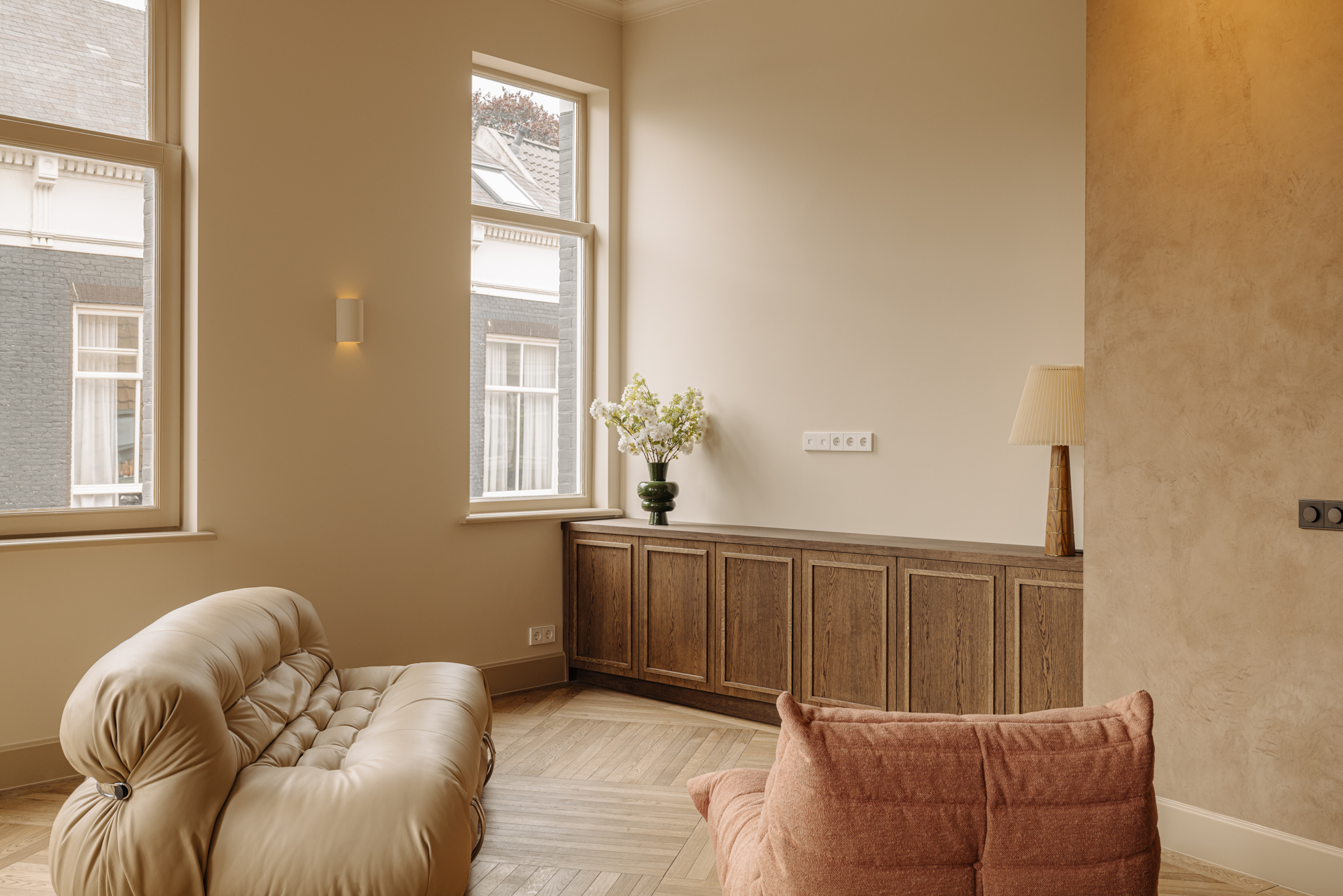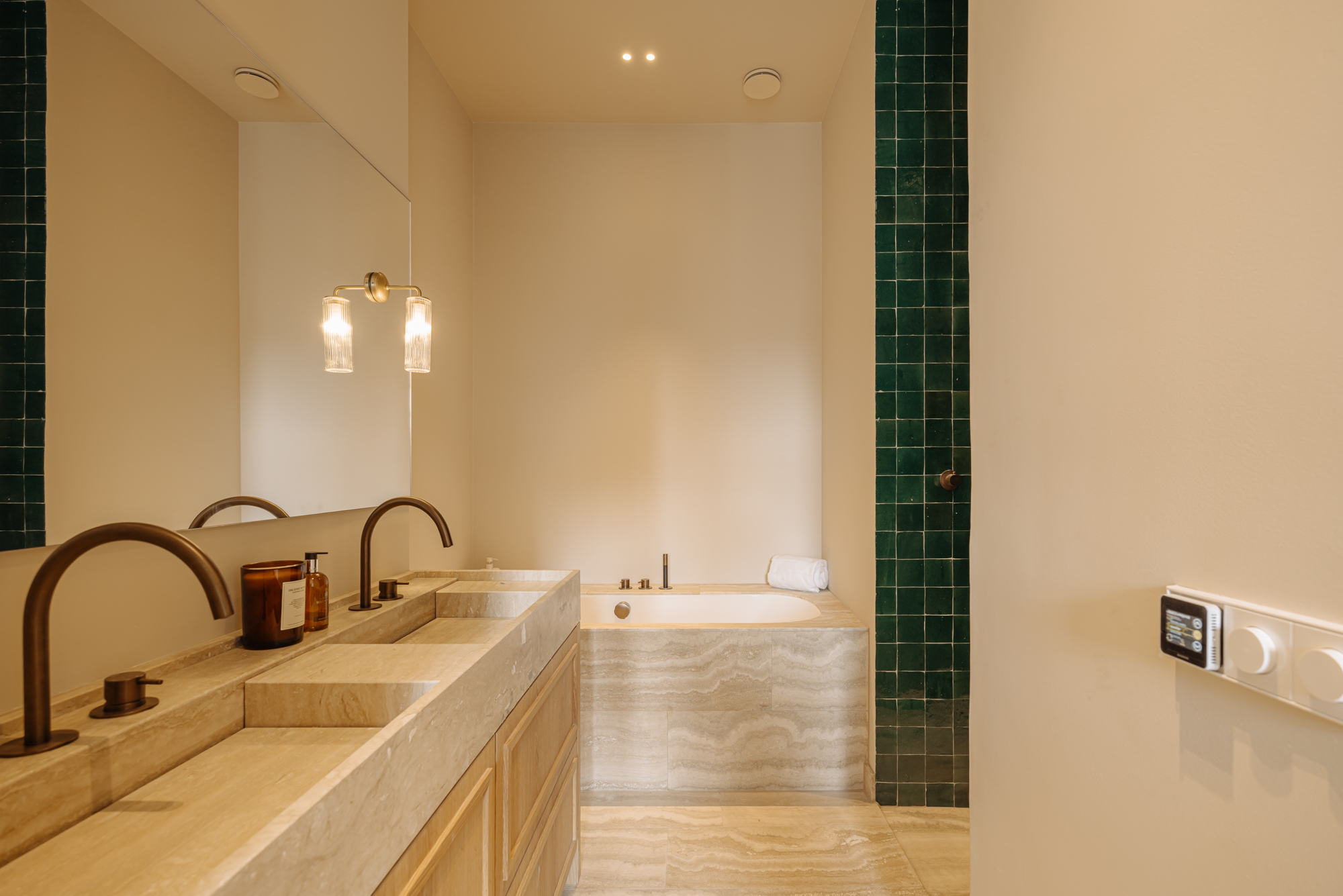 Upon entering the flat on the second floor, you immediately step into the spacious and bright living room. This stands out because of its impressive ceiling height and the large windows that extend over the full width of the front facade - on both the Nieuwe Spiegelstraat and Keizersgracht sides. The modern open kitchen is equipped with high-quality built-in appliances, including an induction hob with integrated extractor system, a fridge-freezer, combination oven, dishwasher and a Quooker. The stylish kitchen island with a travertine top forms the central element of the room.