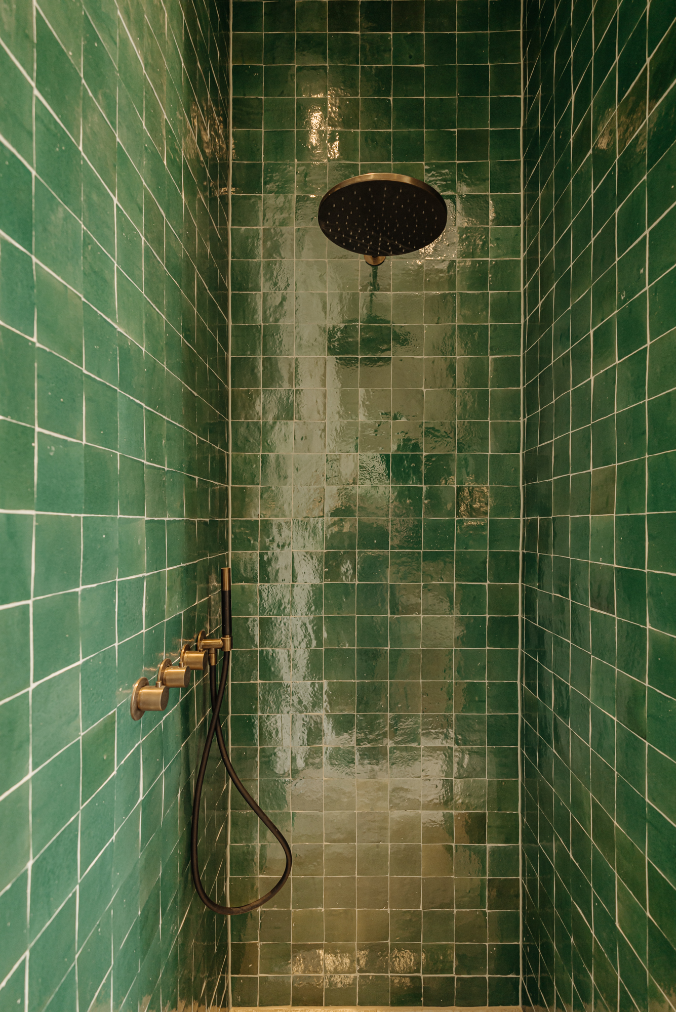 The two generously sized bedrooms both have their own air-conditioning system. The master bedroom has a built-in wardrobe and has an en-suite bathroom with a spacious bathtub, a washbasin and a walk-in shower, finished with an antique brass shower head and zellige wall tiles. The second bedroom also has an en-suite bathroom, fitted with a walk-in shower and a vanity unit. Central to the house are another wardrobe and a separate toilet with hand basin, beautifully finished with Moroccan tiles.