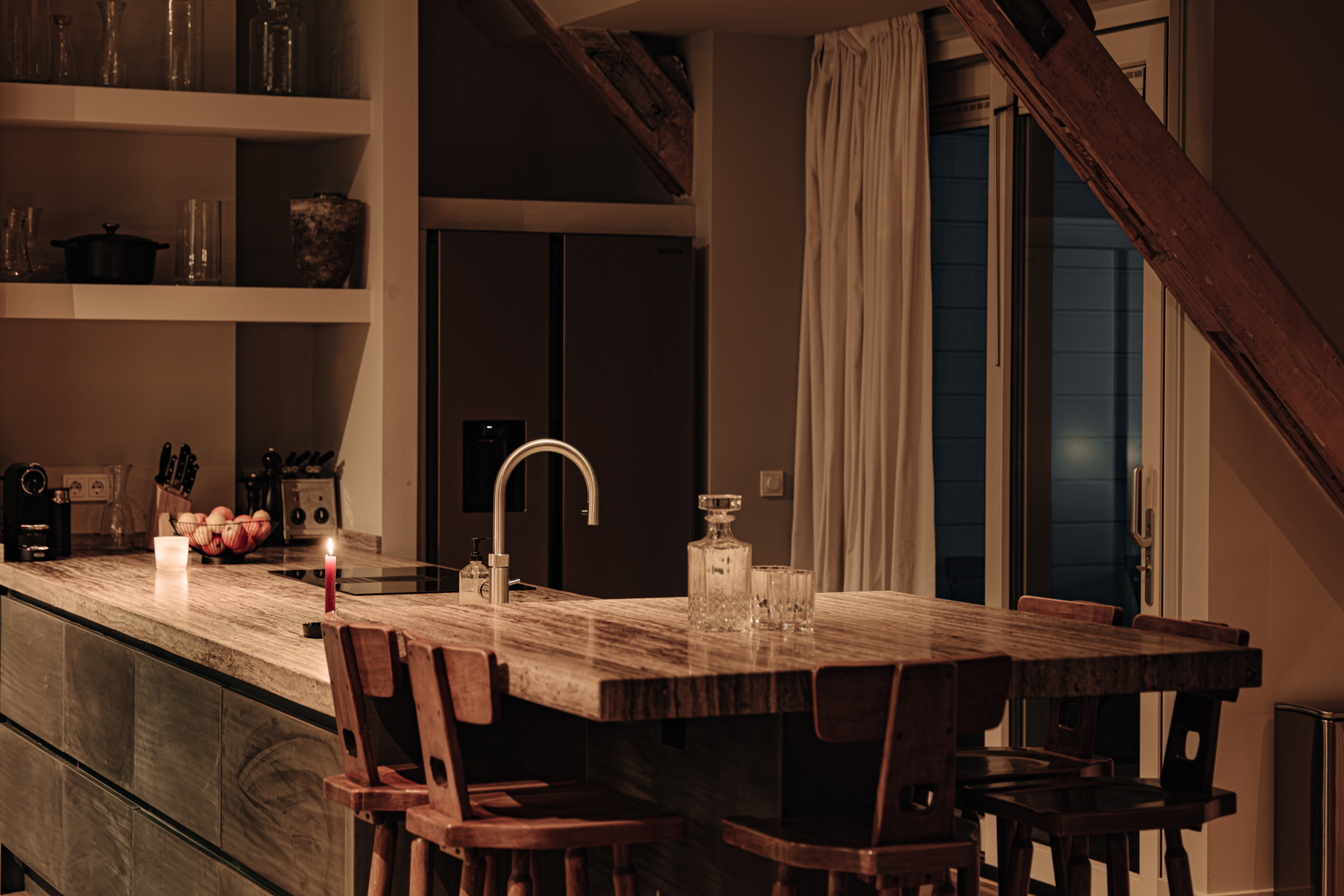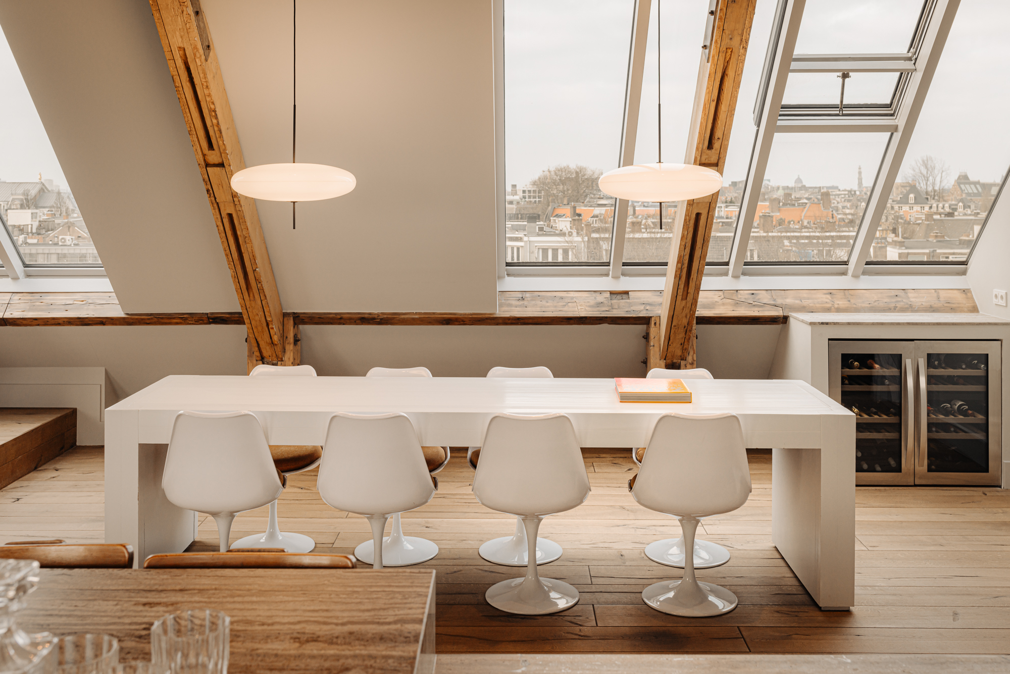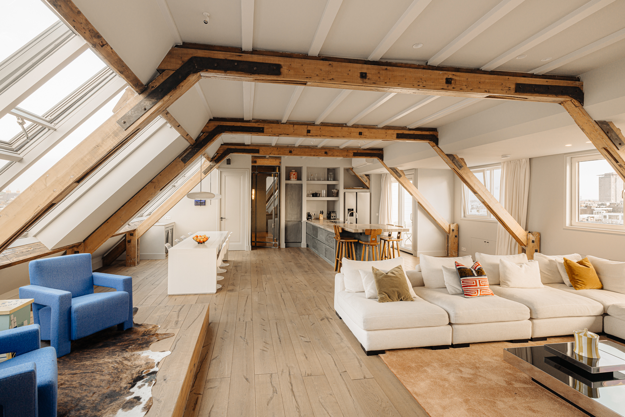 Upon entering, you immediately notice the spacious and light-filled design of the apartment. The living room features a charming south-facing balcony and large windows on both sides, allowing plenty of natural light and offering a panoramic view of the city. The visible wooden beams add character, while the elevated seating area creates a cosy space to relax. An air conditioning unit is installed above the kitchen, which boasts a large cooking island with a natural stone worktop and high-end built-in appliances, including a four-burner induction hob with extractor, a dishwasher, a fridge-freezer combination, a Quooker, and a built-in wine climate cabinet. A stylish raised bar area is integrated into the kitchen island. The dining area comfortably accommodates a large table, benefiting from ample natural daylight through the expansive windows.