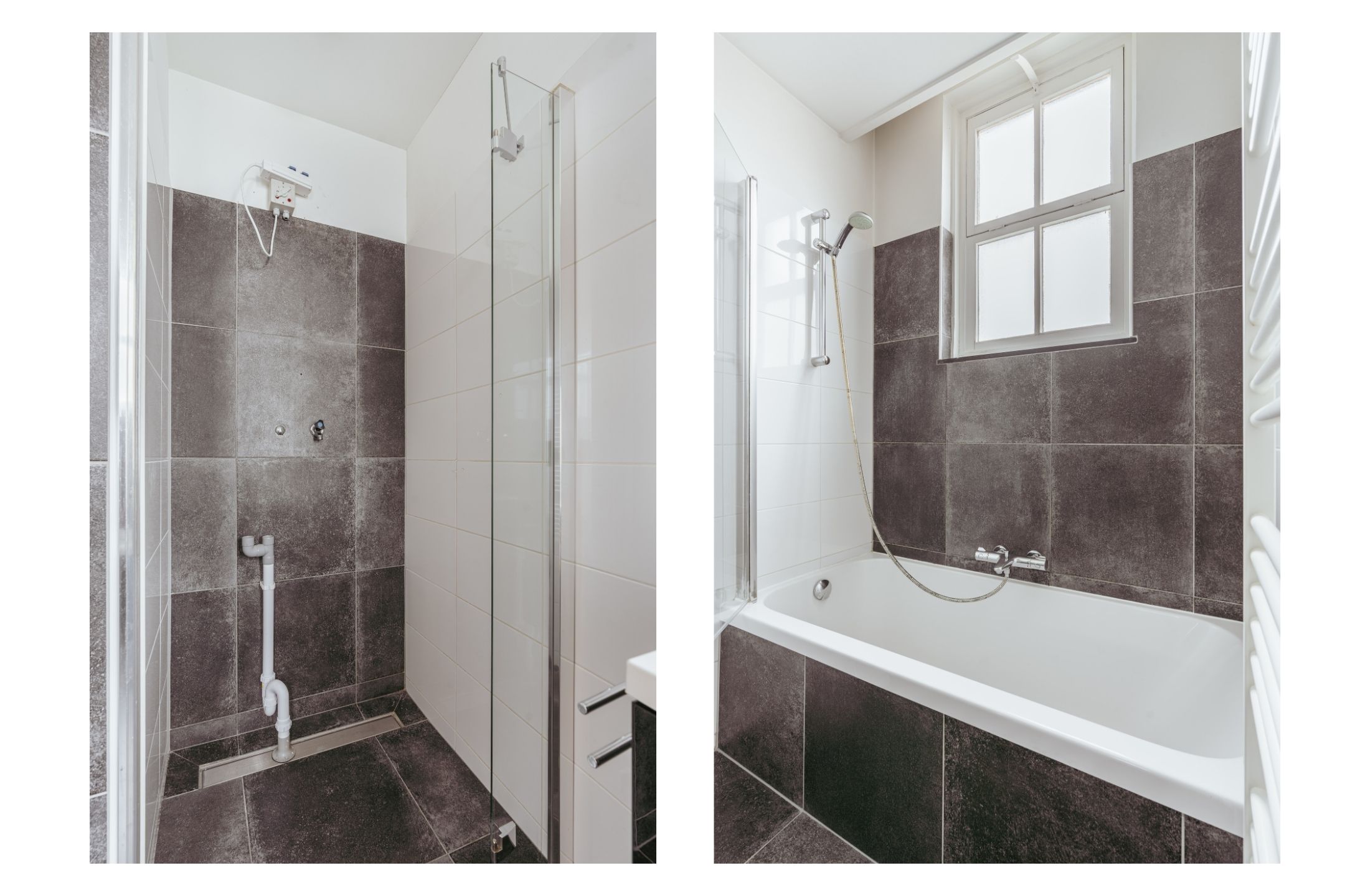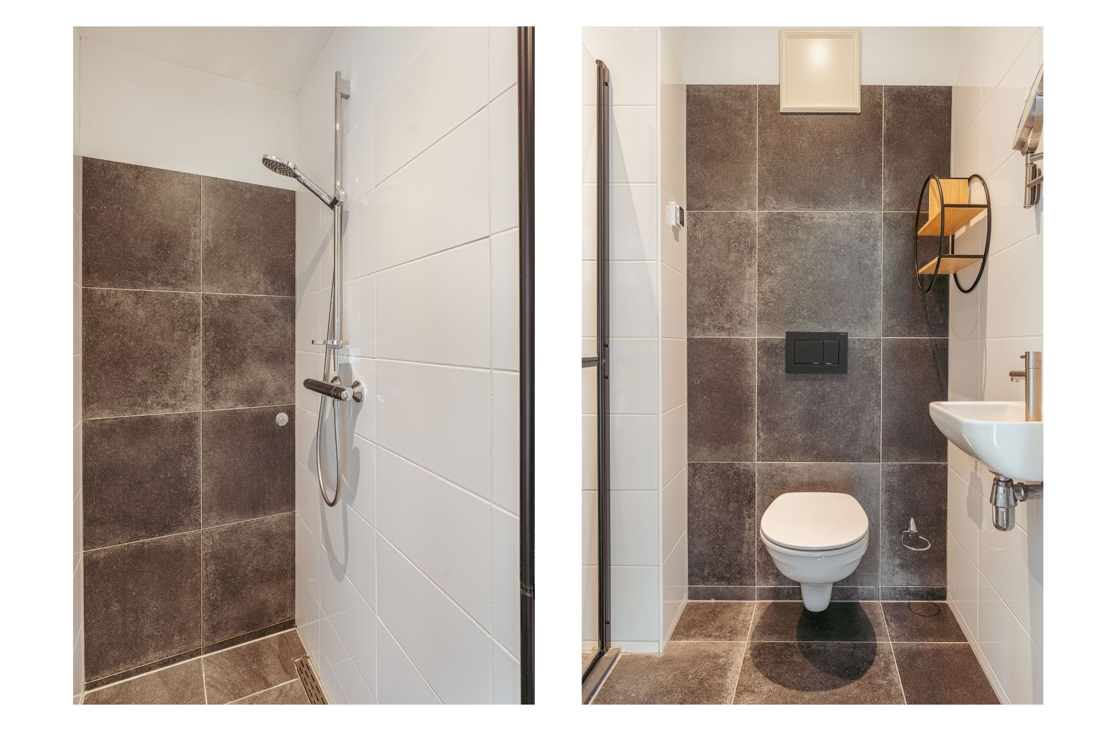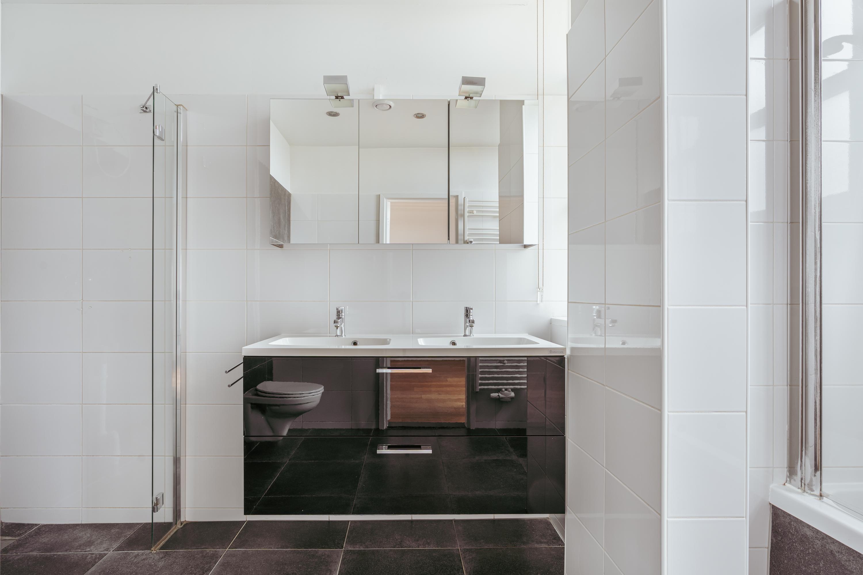 A second bathroom with toilet, sink, and shower is centrally located and accessible from the hall. There is also additional storage space in the form of two built-in cupboards next to the meter cupboard.