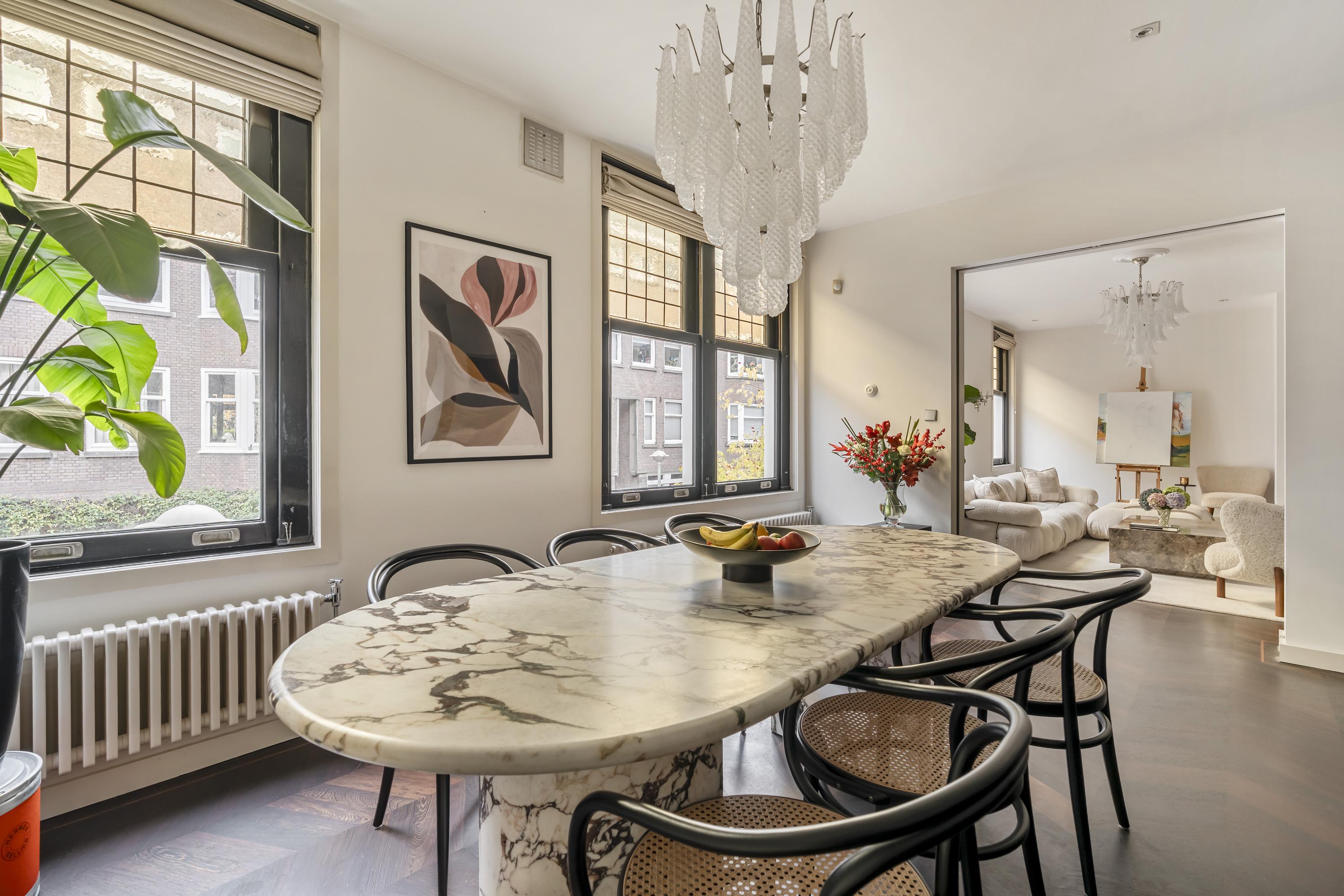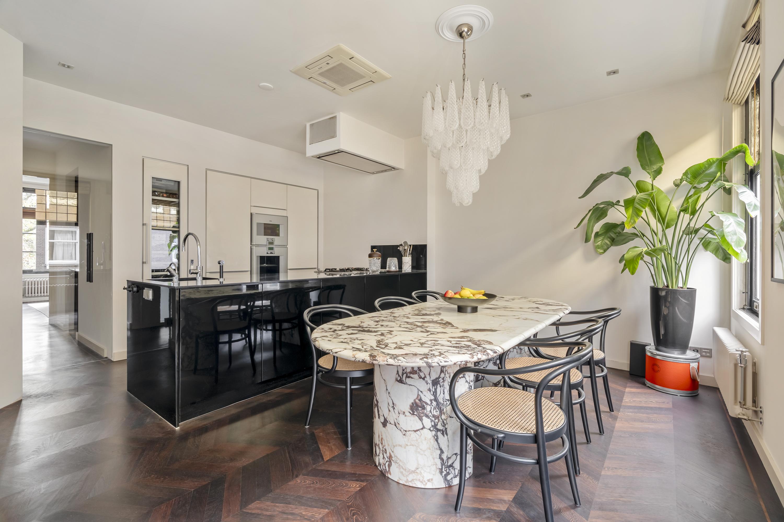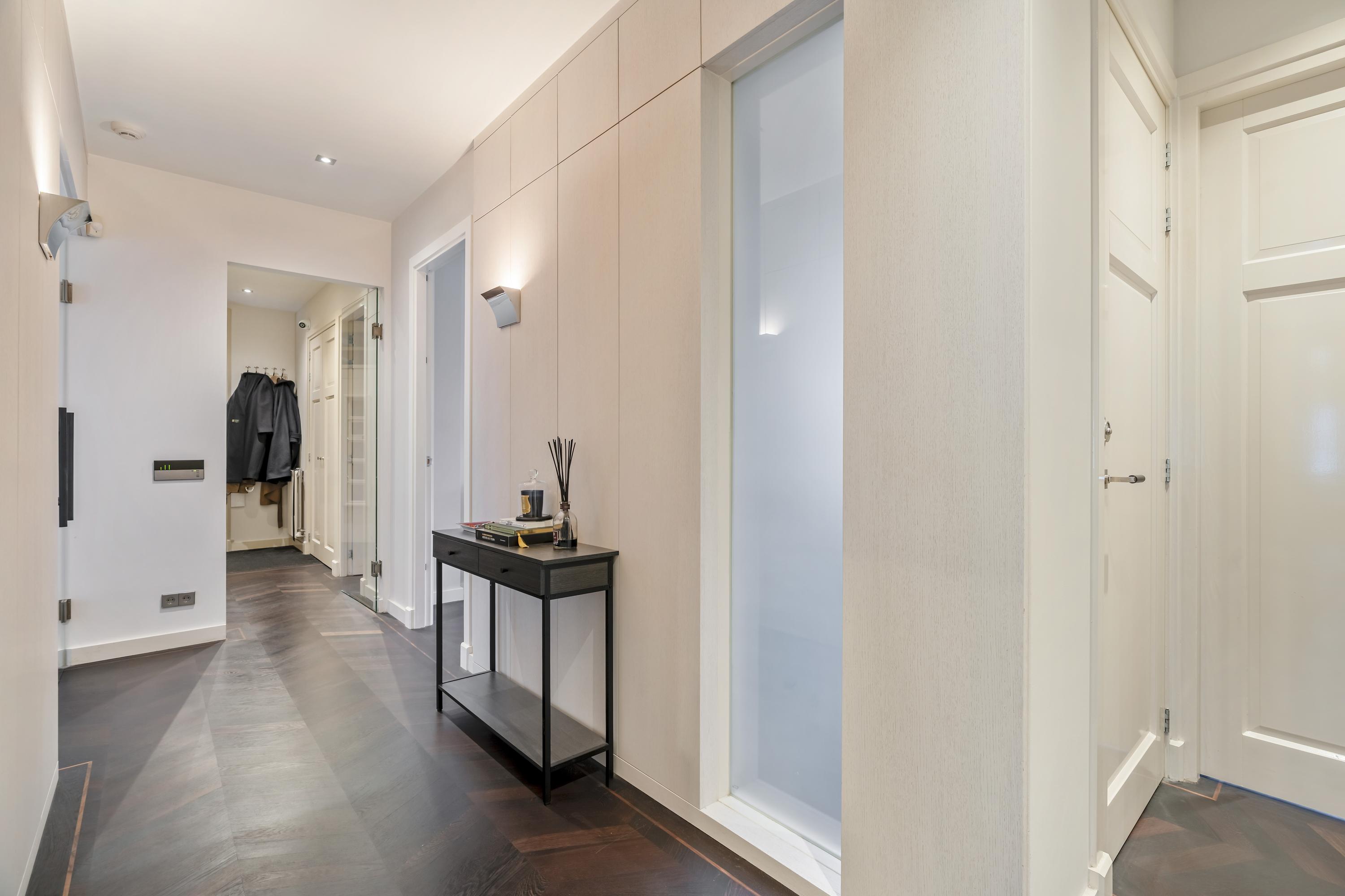 The apartment is accessed via an open entrance hall that leads directly into the home. The hallway features custom-made hardwood built-in cabinets, both practical and elegant, with space for the washing machine and dryer. A separate toilet with a washbasin is also located here. At the front of the apartment lies the spacious living room, an inviting area featuring a charming gas fireplace and characteristic stained-glass windows. The electric French doors and sliding doors leading to the kitchen, both equipped with subtle designer lighting, create a seamless transition between the living and cooking areas. The kitchen, designed by Poggenpohl, forms the true heart of the home. It is equipped with top-of-the-line Gaggenau appliances, including a plate warmer, steam oven, oven, two refrigerators, a wine climate cabinet, a 3-burner gas cooktop with Teppanyaki plate, dishwasher, and a Quooker tap. The kitchen also includes an integrated air-conditioning unit. A second gas fireplace and built-in television make this not only a highly functional but also a warm and inviting space to cook and gather.