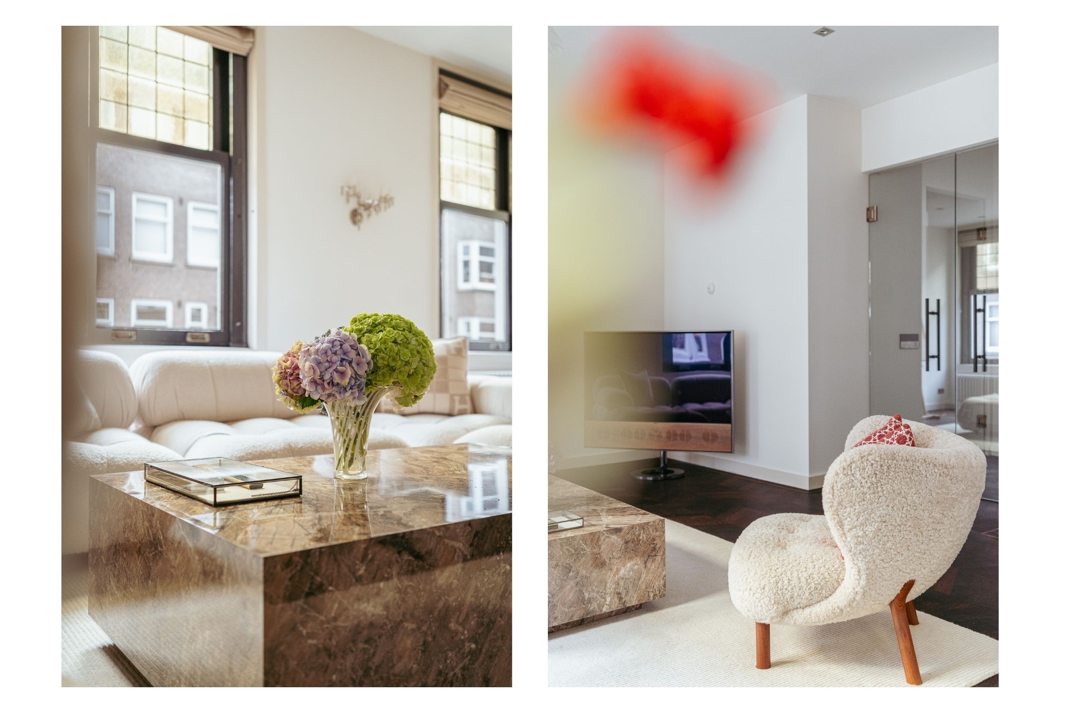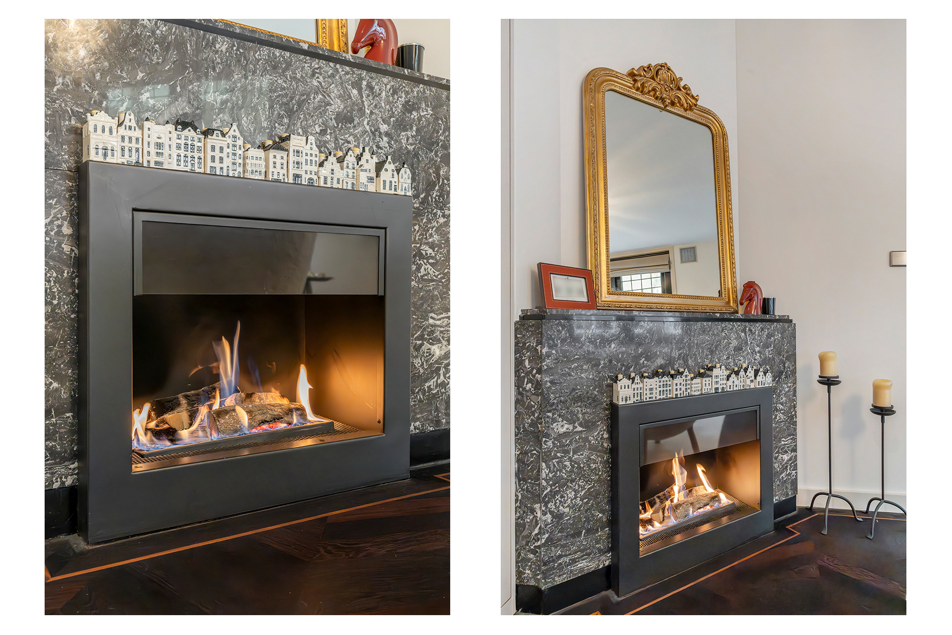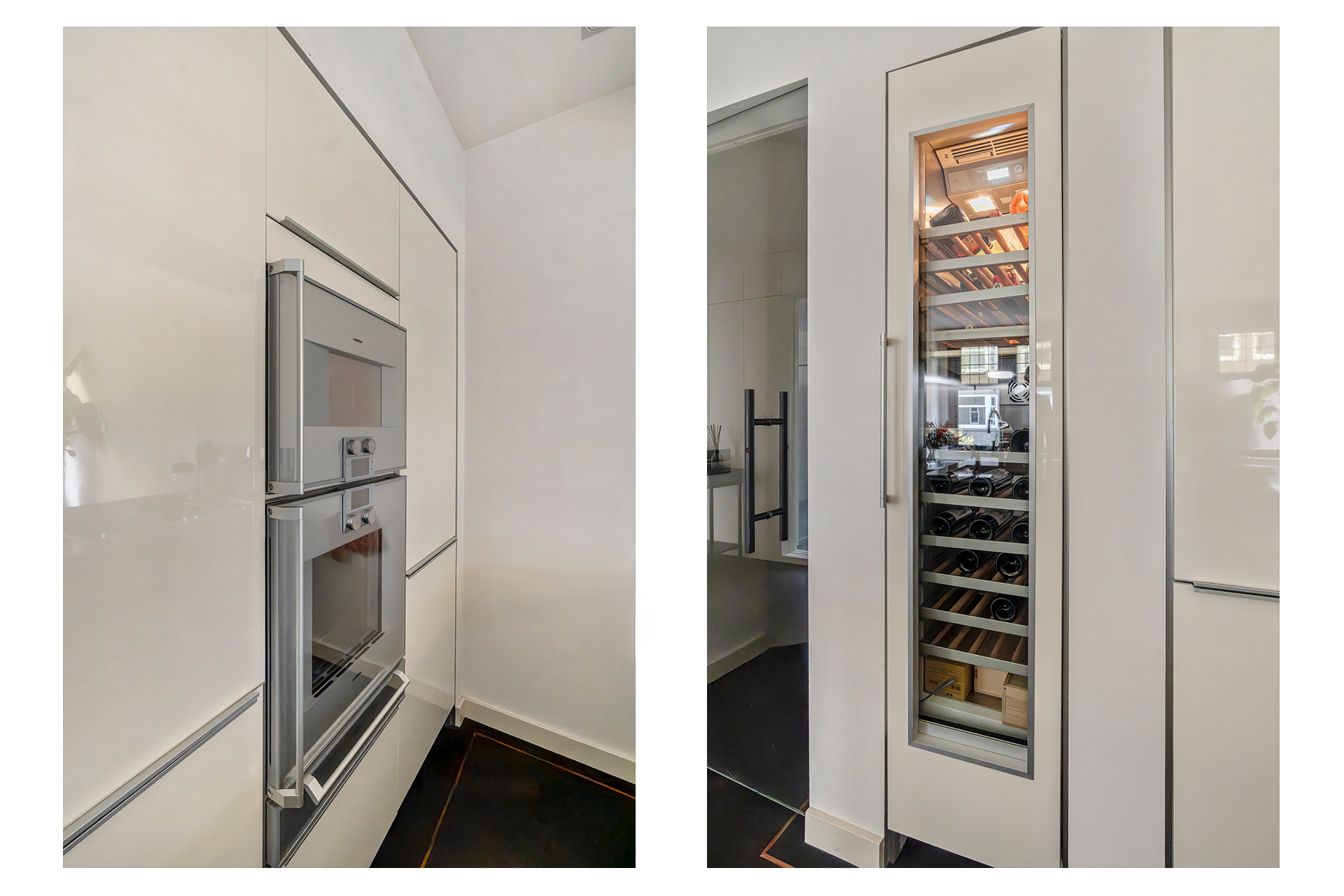 The apartment is accessed via an open entrance hall that leads directly into the home. The hallway features custom-made hardwood built-in cabinets, both practical and elegant, with space for the washing machine and dryer. A separate toilet with a washbasin is also located here. At the front of the apartment lies the spacious living room, an inviting area featuring a charming gas fireplace and characteristic stained-glass windows. The electric French doors and sliding doors leading to the kitchen, both equipped with subtle designer lighting, create a seamless transition between the living and cooking areas. The kitchen, designed by Poggenpohl, forms the true heart of the home. It is equipped with top-of-the-line Gaggenau appliances, including a plate warmer, steam oven, oven, two refrigerators, a wine climate cabinet, a 3-burner gas cooktop with Teppanyaki plate, dishwasher, and a Quooker tap. The kitchen also includes an integrated air-conditioning unit. A second gas fireplace and built-in television make this not only a highly functional but also a warm and inviting space to cook and gather.
