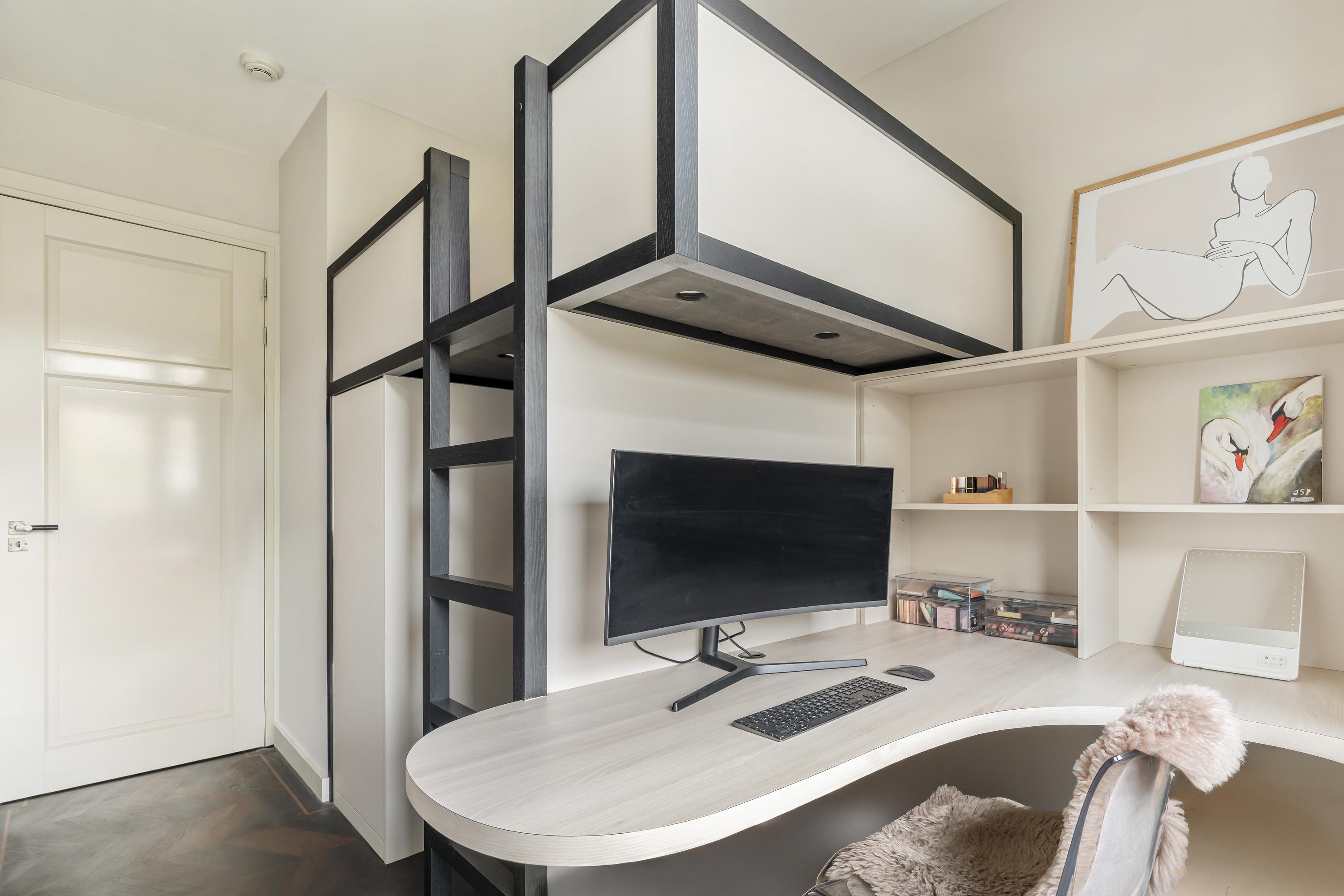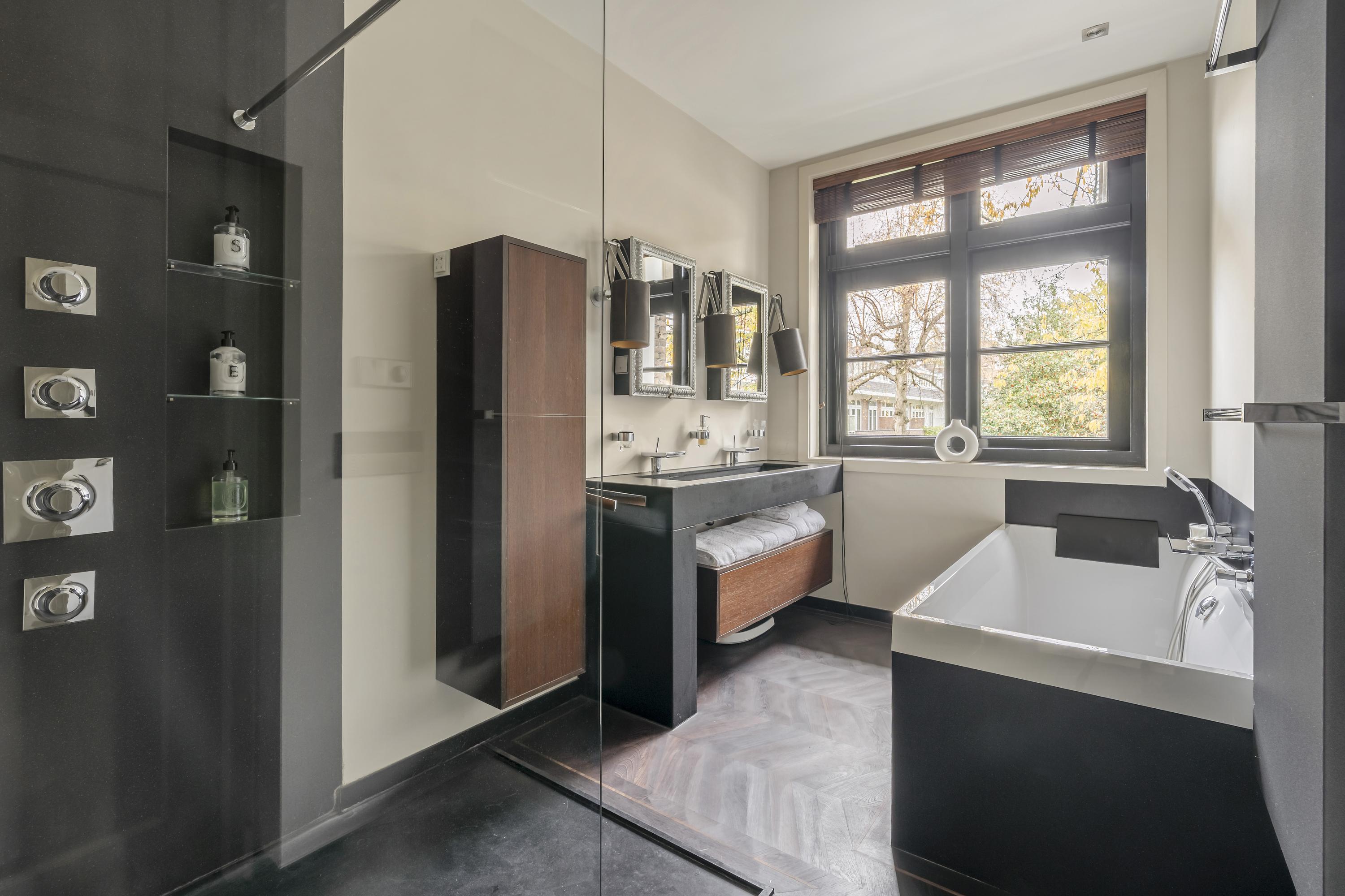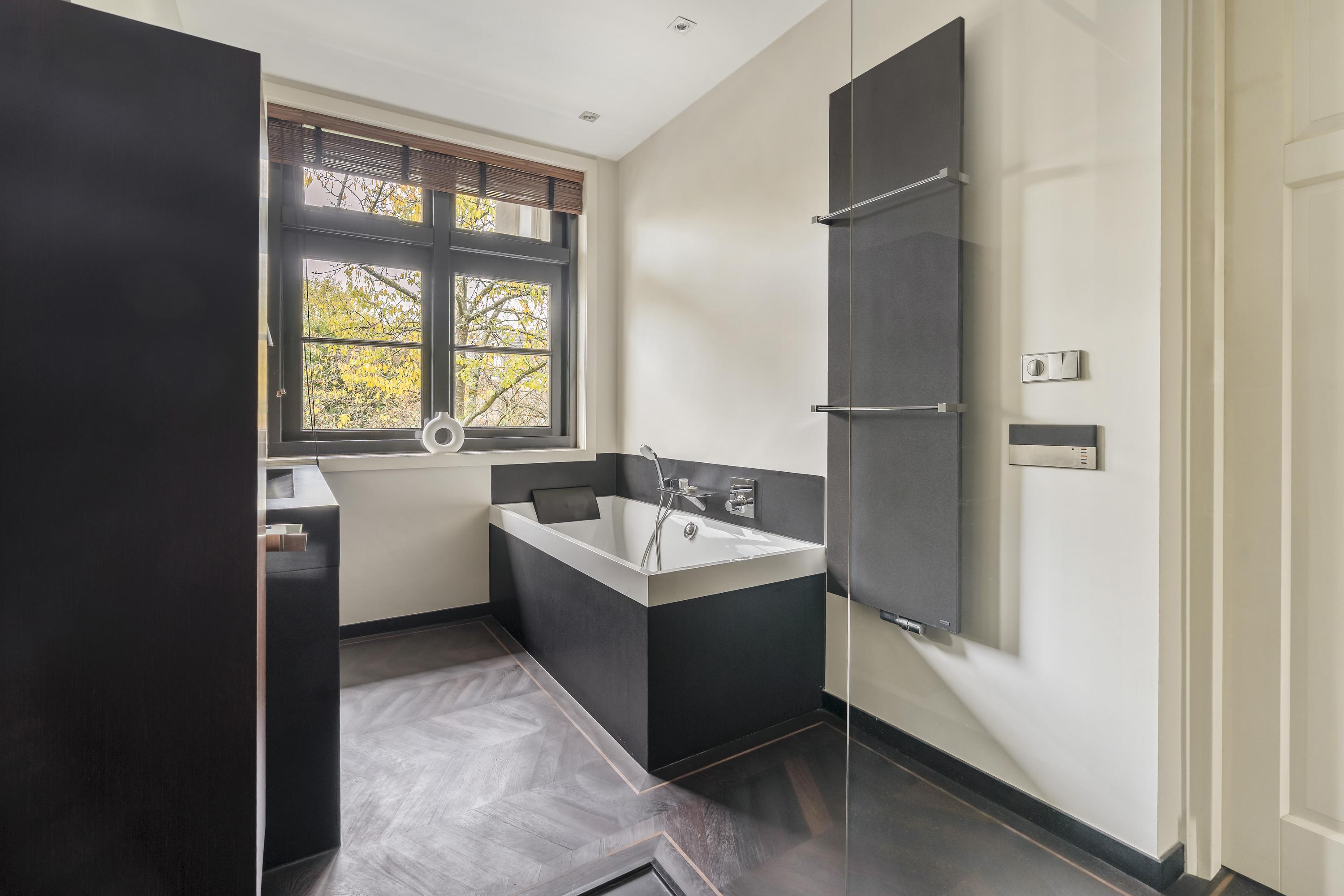 At the quiet rear of the apartment are three well-proportioned bedrooms and the modern bathroom. The master bedroom features built-in wardrobes, air conditioning, and electrically operated windows that allow natural light to fill the room. The second bedroom, also equipped with air conditioning, includes a custom-designed loft bed with integrated storage and a matching built-in desk. The third bedroom is ideal as a children’s room, guest room, or home office. All bedrooms offer access to the exceptionally wide balcony. A true eye-catcher is the generous walk-in closet, accessible via automatically controlled glass doors and executed in a luxurious, tailored design. Centrally located is the modern bathroom, equipped with a spacious bathtub, double washbasin with cabinet, and a large rain shower fitted with Axor taps. The designer radiator by Thermic adds both comfort and elegance. The lighting throughout the home is controlled via a Lutron system, developed in collaboration with Bang & Olufsen. The entire apartment features a beautiful and solid Wenge hardwood floor.