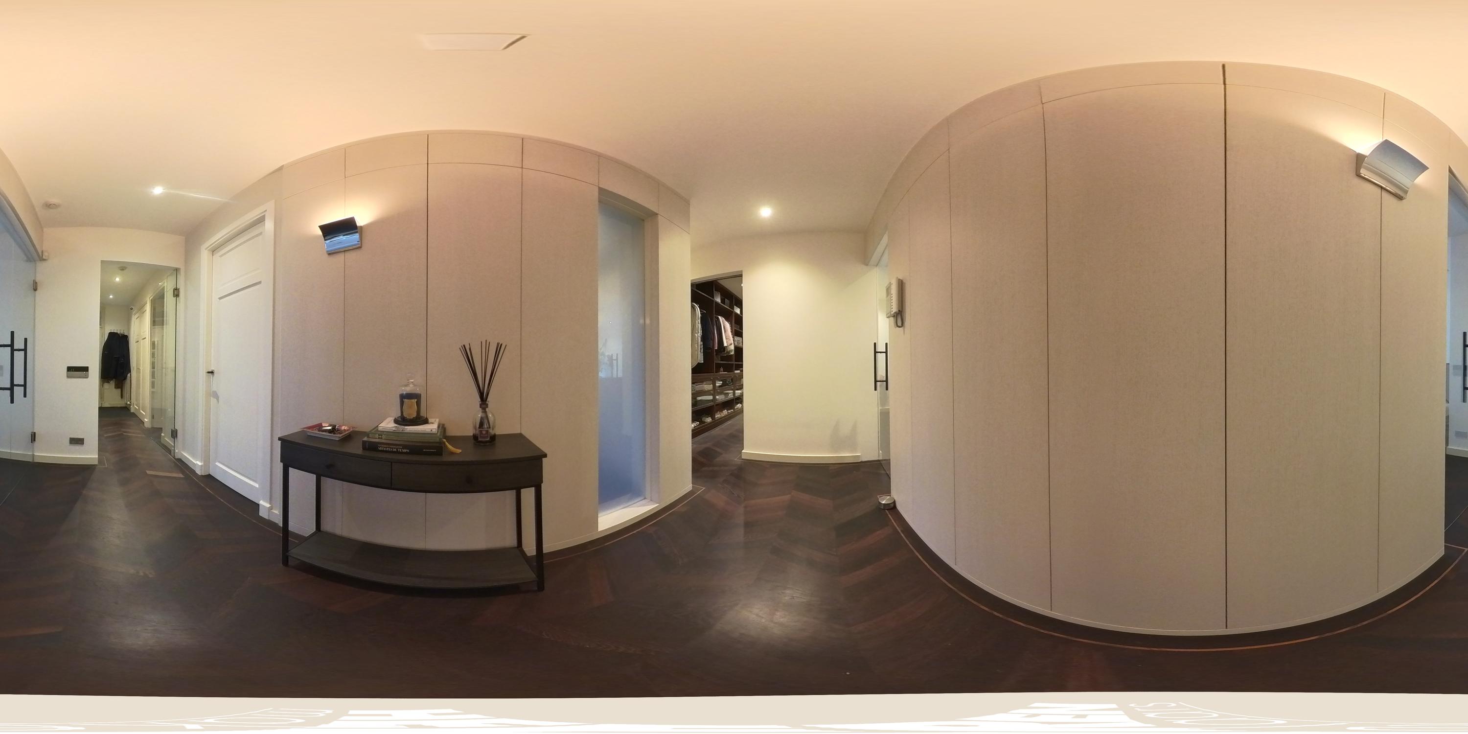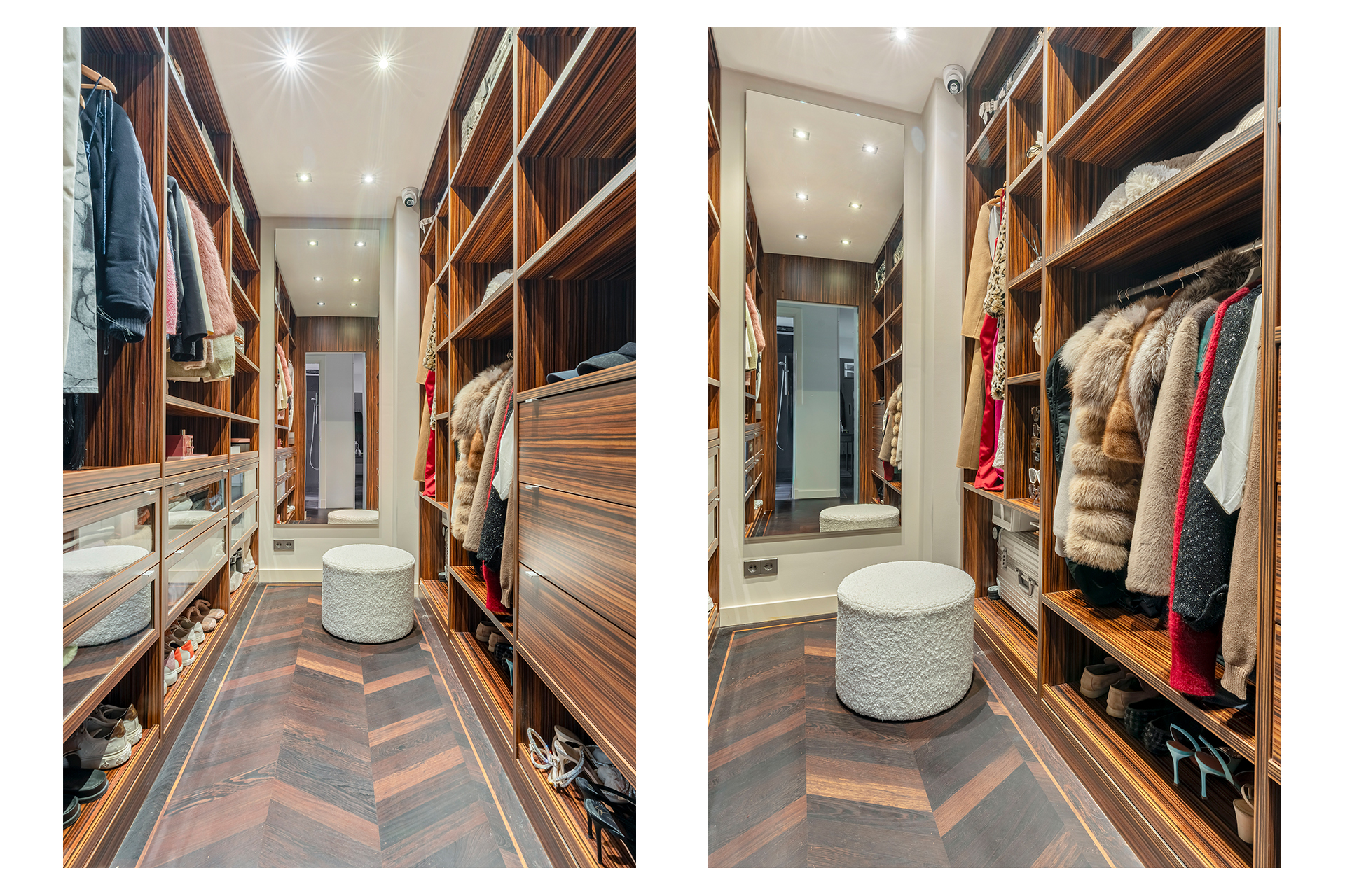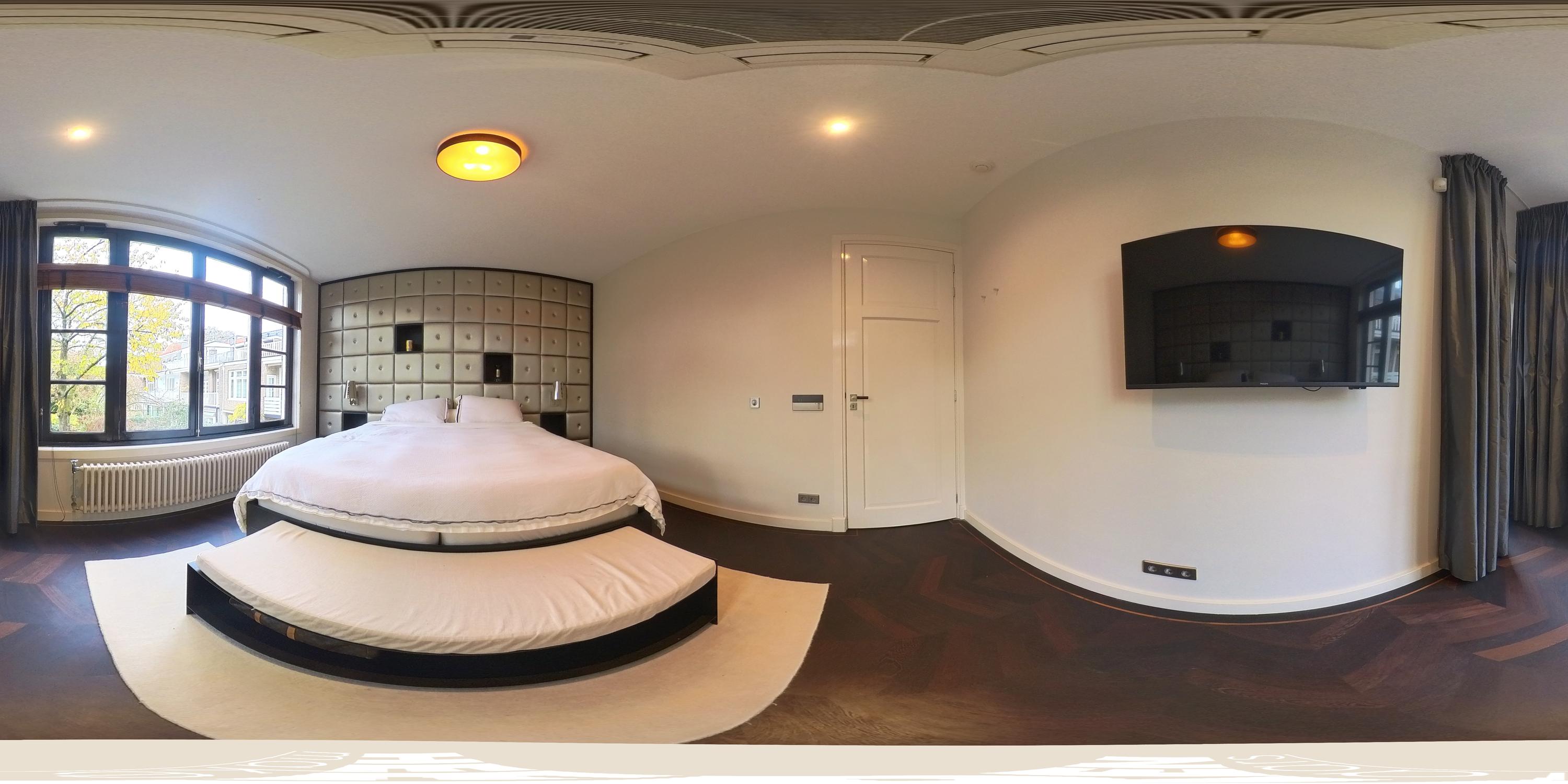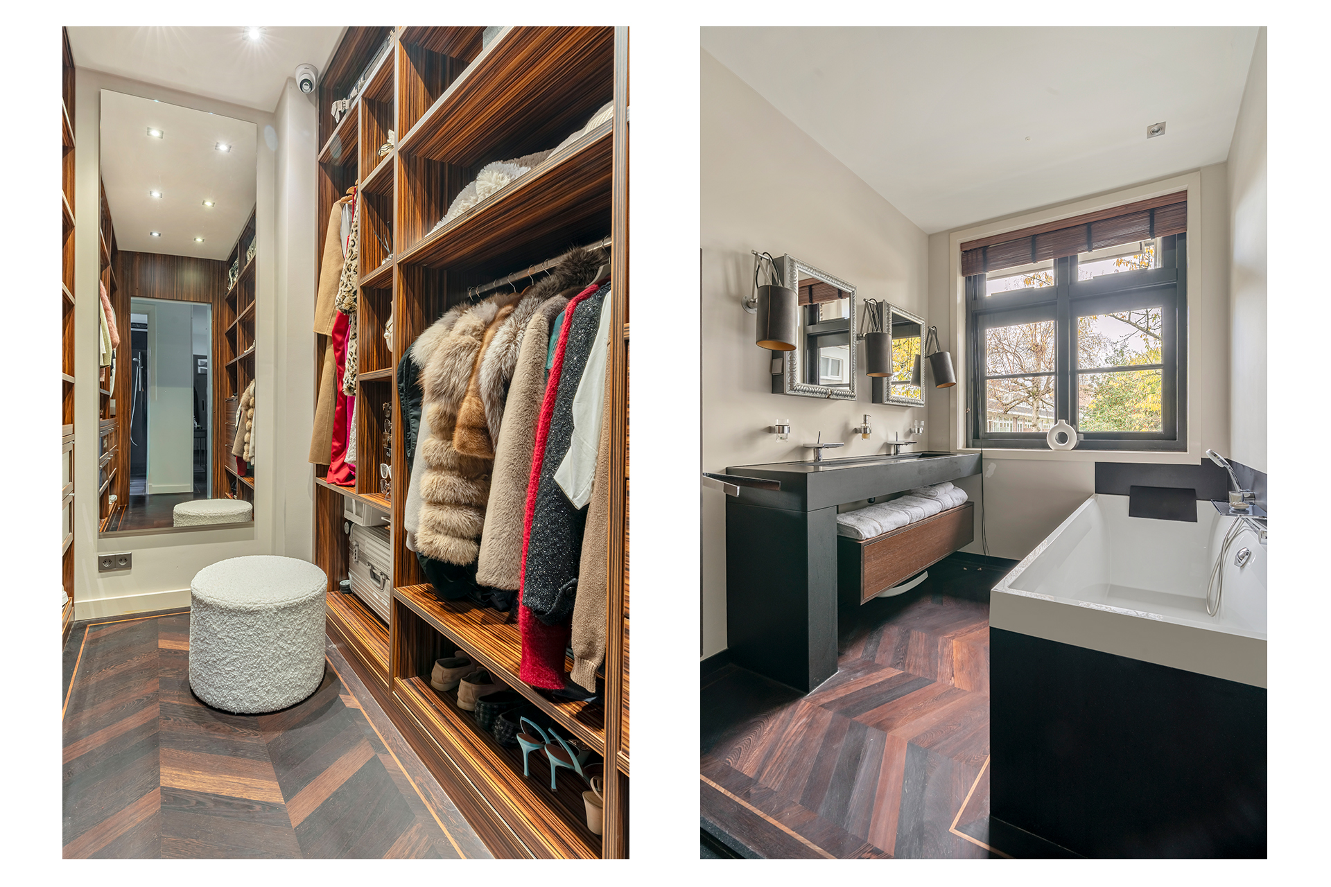At the quiet rear of the apartment are three well-proportioned bedrooms and the modern bathroom. The master bedroom features built-in wardrobes, air conditioning, and electrically operated windows that allow natural light to fill the room. The second bedroom, also equipped with air conditioning, includes a custom-designed loft bed with integrated storage and a matching built-in desk. The third bedroom is ideal as a children’s room, guest room, or home office. All bedrooms offer access to the exceptionally wide balcony. A true eye-catcher is the generous walk-in closet, accessible via automatically controlled glass doors and executed in a luxurious, tailored design. Centrally located is the modern bathroom, equipped with a spacious bathtub, double washbasin with cabinet, and a large rain shower fitted with Axor taps. The designer radiator by Thermic adds both comfort and elegance. The lighting throughout the home is controlled via a Lutron system, developed in collaboration with Bang & Olufsen. The entire apartment features a beautiful and solid Wenge hardwood floor.