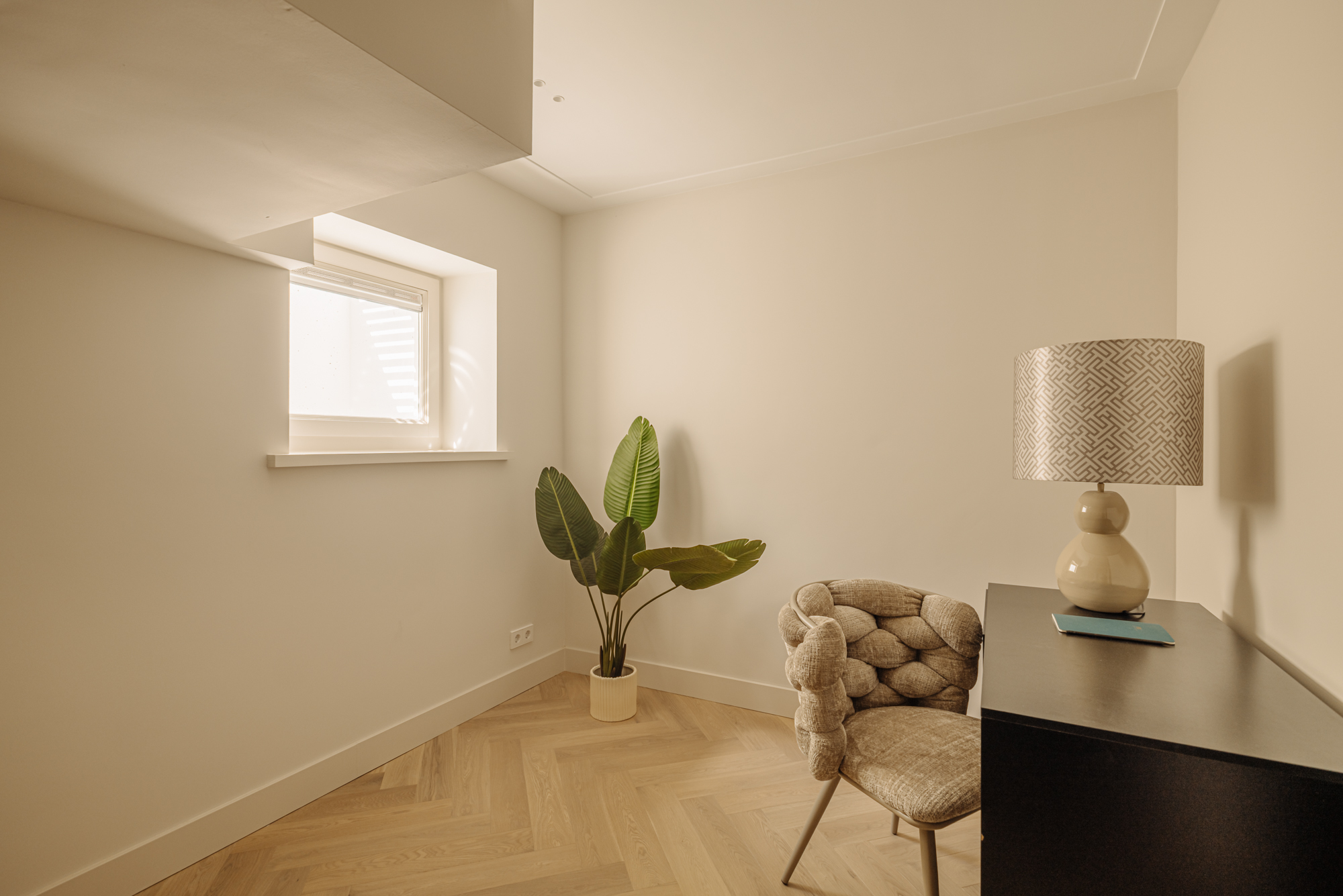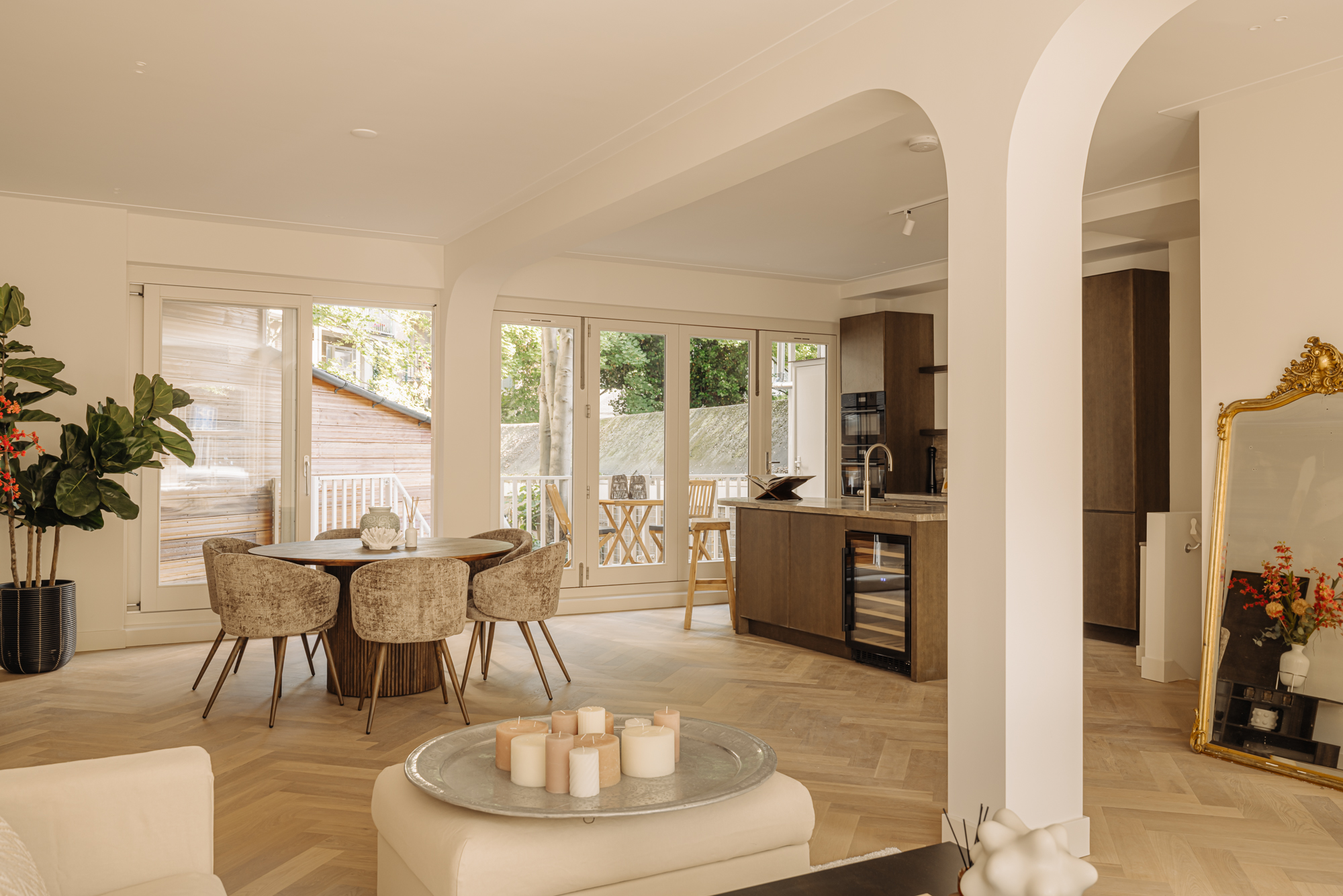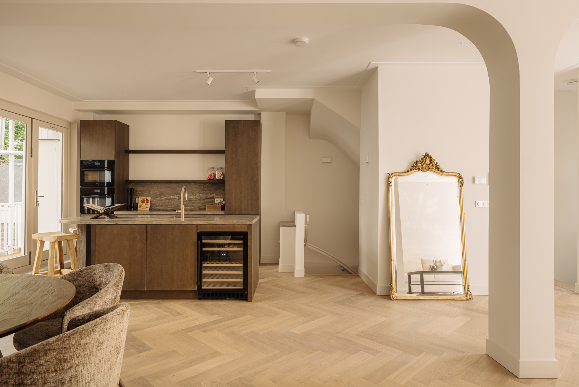 Upon entering, you'll step directly into the spacious living room located at the front. At the rear, you'll find a modern open kitchen with a central island and access to a wide west-facing balcony (approx. 9 m²), overlooking the beautifully landscaped garden of approx. 34 m², accessible via stairs from the balcony. The kitchen is finished with high-end materials and includes a 4-zone induction hob with integrated extractor, two combi ovens, a dishwasher, a fridge-freezer, a wine climate cabinet, and a Quooker. The island also features a cozy breakfast bar. Centrally located is a separate toilet with washbasin and the staircase leading down to the lower level.