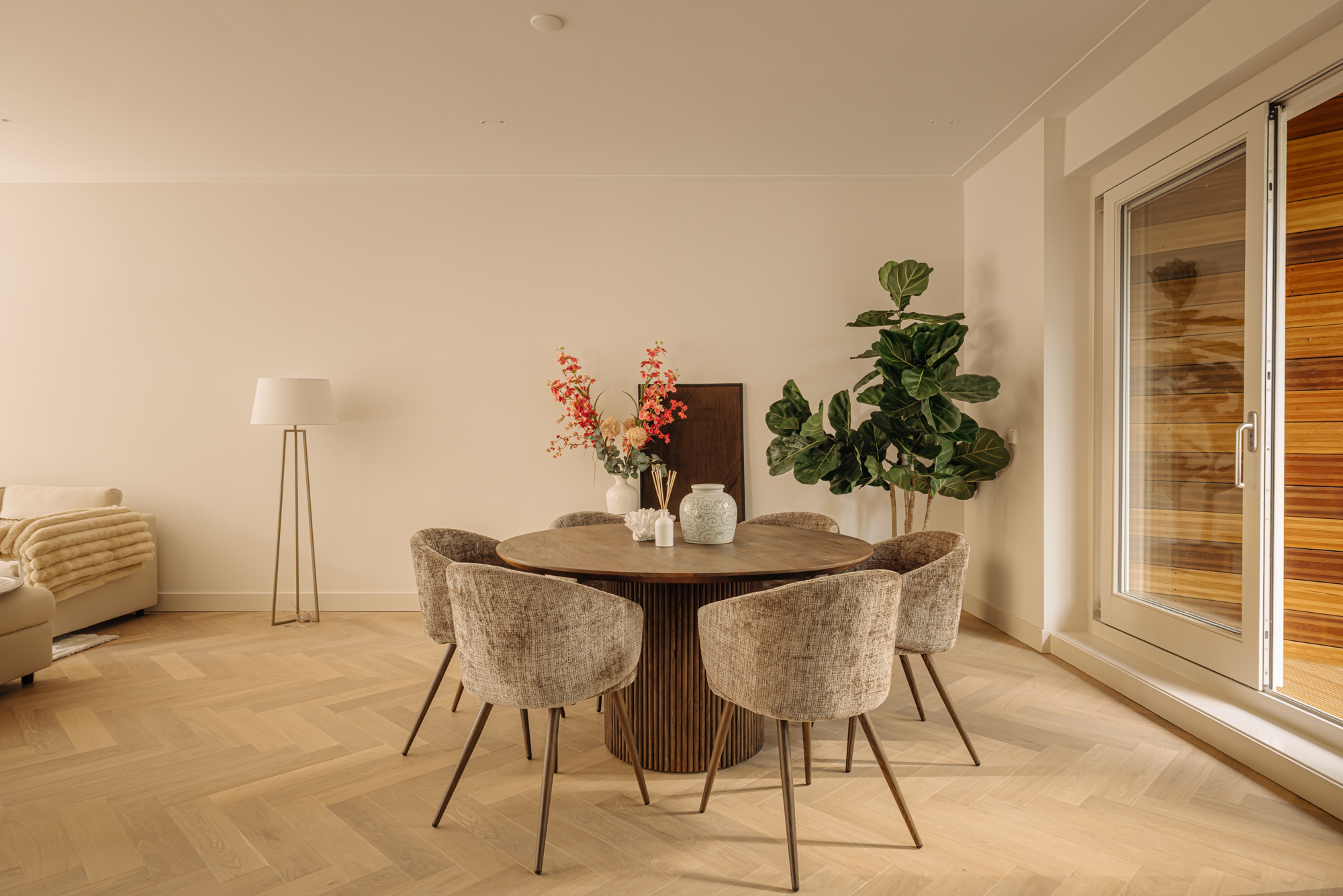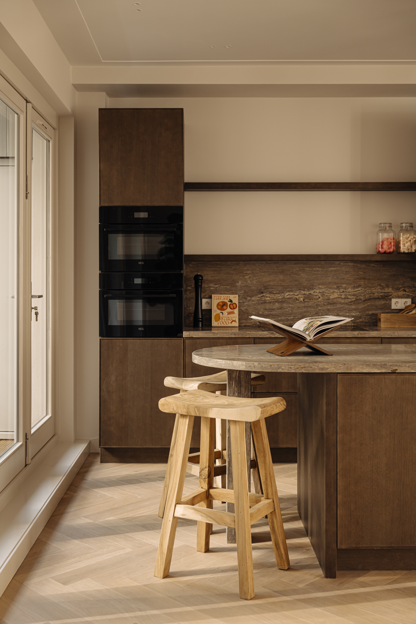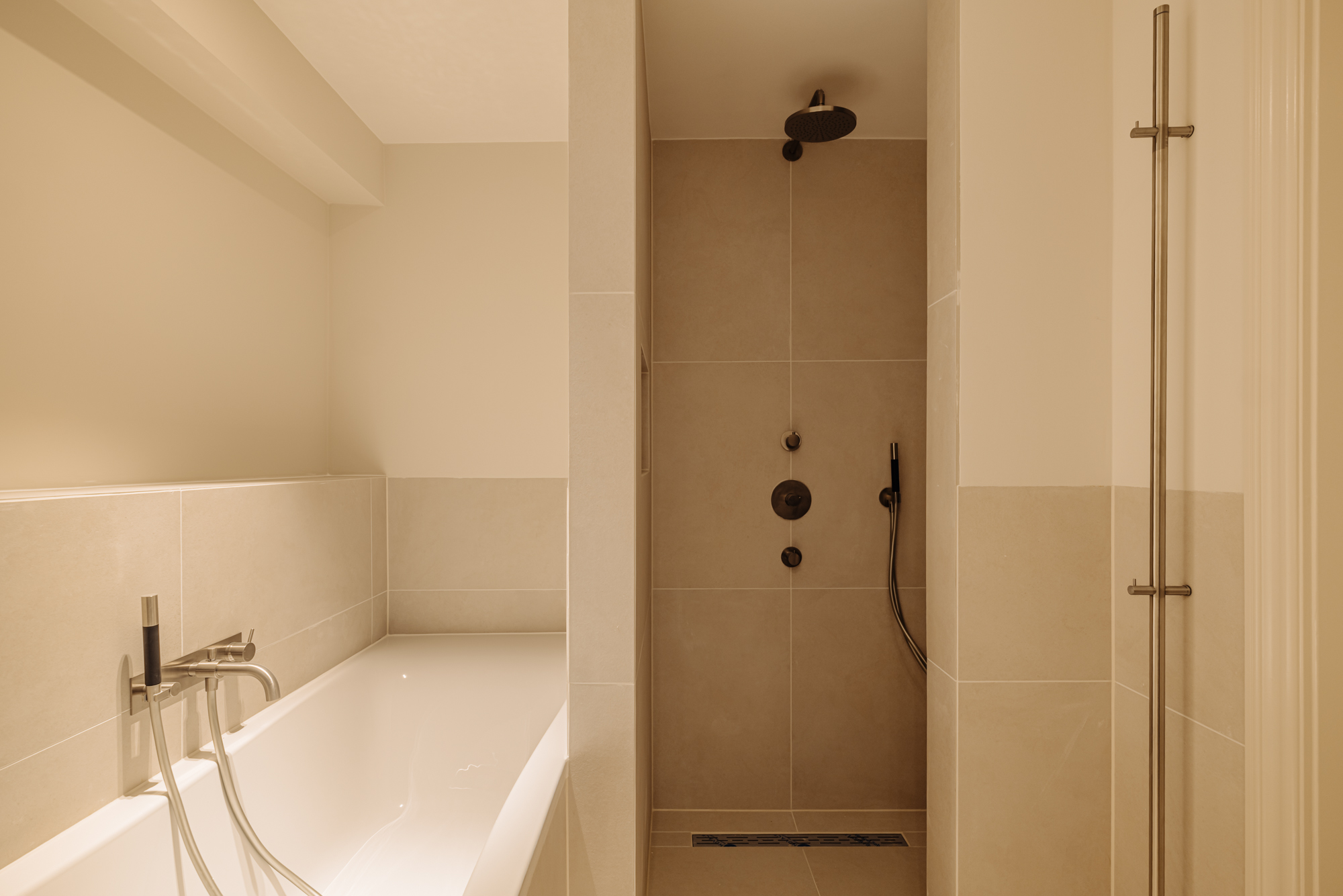 Upon entering, you'll step directly into the spacious living room located at the front. At the rear, you'll find a modern open kitchen with a central island and access to a wide west-facing balcony (approx. 9 m²), overlooking the beautifully landscaped garden of approx. 34 m², accessible via stairs from the balcony. The kitchen is finished with high-end materials and includes a 4-zone induction hob with integrated extractor, two combi ovens, a dishwasher, a fridge-freezer, a wine climate cabinet, and a Quooker. The island also features a cozy breakfast bar. Centrally located is a separate toilet with washbasin and the staircase leading down to the lower level.