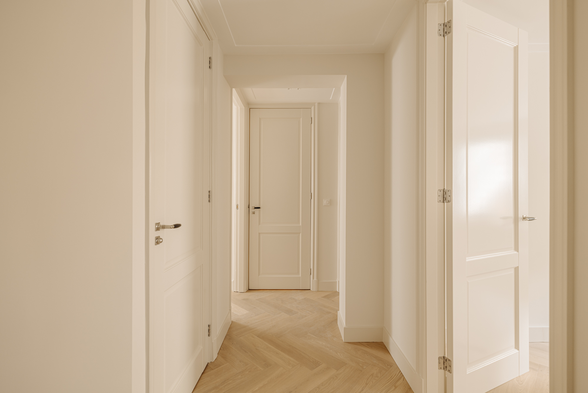Private entrance on the ground floor. An open hallway with stairs leads up to the main living level (bel-etage).