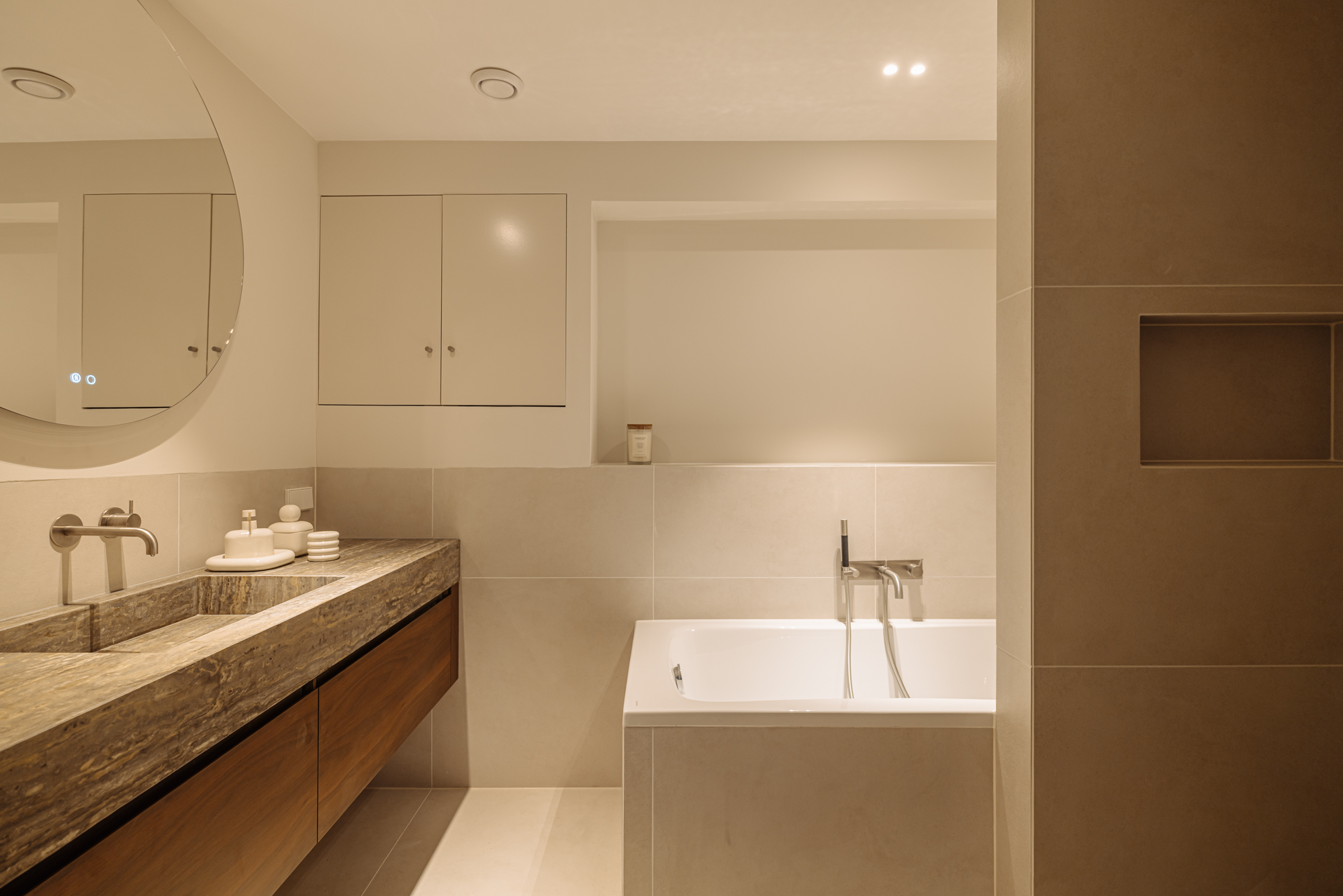 A spacious hallway provides access to all rooms on this level. At the front are two bedrooms, both with frosted windows for added privacy. At the rear are the third and fourth bedrooms, featuring large windows and views of the garden. Centrally located is a second toilet and the modern bathroom, complete with a large bathtub, walk-in shower, and a washbasin with a marble vanity unit.