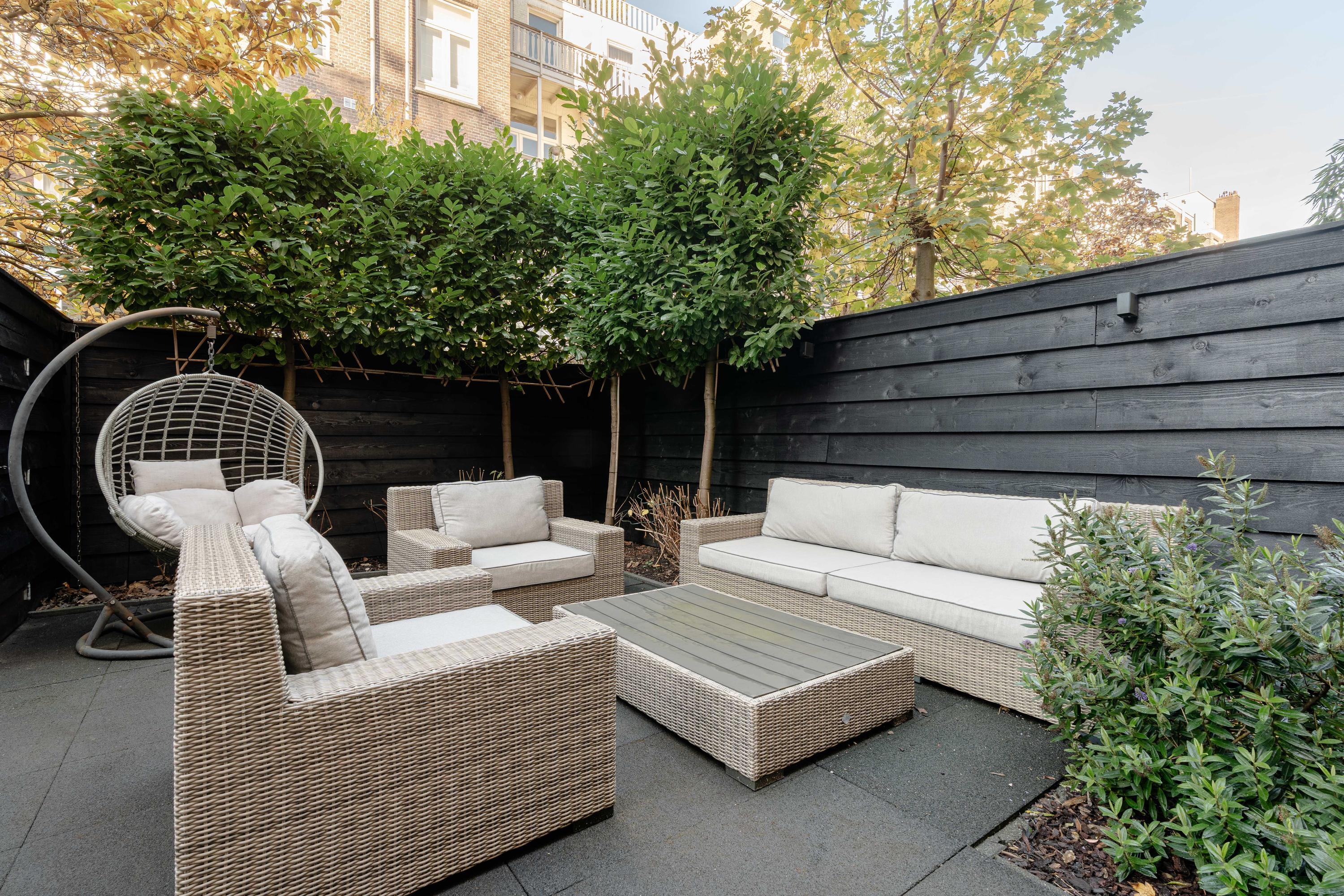 The modern kitchen is situated at the back and is equipped with an induction hob with integrated extraction, refrigerator, freezer, oven, combi-oven, dishwasher and a sink with Quooker tap. Both the kitchen and dining area provide access to the terrace through French doors. From the terrace, a staircase leads down to the spacious rear garden, a delightful outdoor area with plenty of room for lounge seating, a dining table and a safe play space for children.