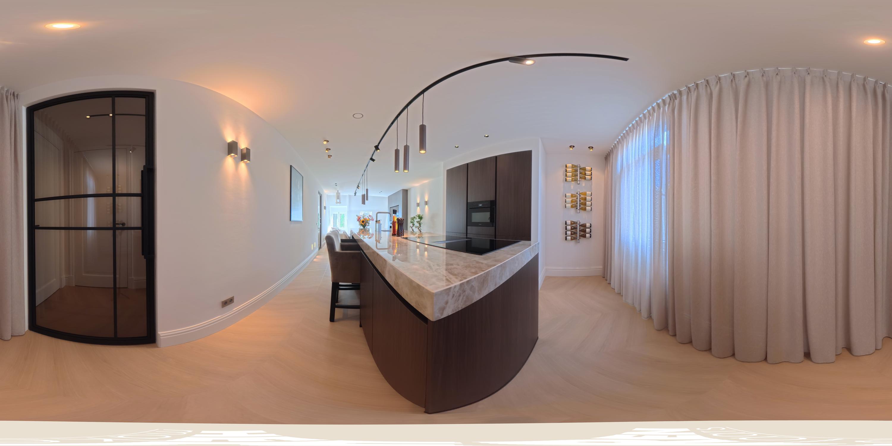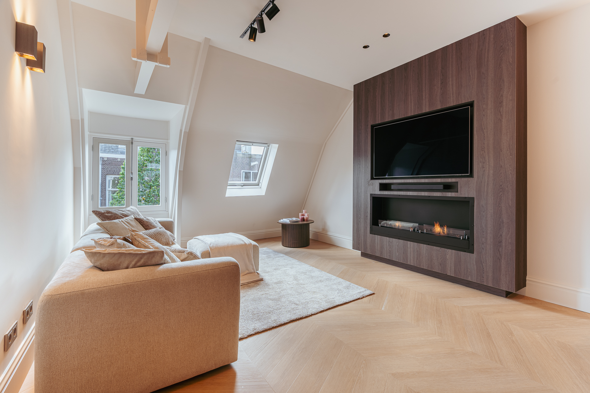 On the top floor, you enter through a sleek integrated sliding door into a beautiful, spacious hallway that provides access to all rooms. The heart of the home is the open-plan living and dining area, which spans the entire length of the apartment. With windows on both sides, the space is flooded with natural light. At the front is the sitting area, complete with a cozy bio-ethanol fireplace stylishly integrated into a built-in cabinet with TV. At the rear lies the modern open kitchen with a cooking island. Finished with a Dekton countertop, the kitchen is equipped with every luxury appliance imaginable, including a wine cooler, Quooker tap, dishwasher, fridge/freezer, Miele combi-oven, and a Miele induction hob with integrated extraction system. The bar section of the island also makes this a sociable spot to cook together or enjoy a glass of wine with family and friends.