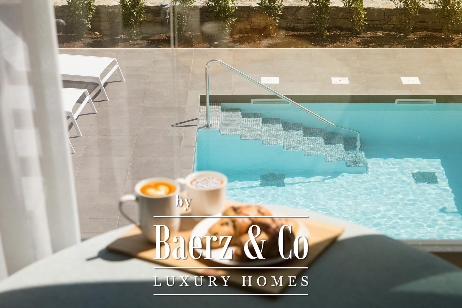 Each of the four bedrooms, ranging from 22 m² to 37 m², is paired with a private bathroom and king-size bed, while three rooms enjoy access to covered terraces. The wellness zone, measuring 61 m², includes an indoor heated pool with hydromassage, Finnish sauna, and panoramic views of Bale. Outdoors, residents benefit from a second pool, summer kitchen, barbecue area, and well-planned leisure spaces for private retreat or entertaining.