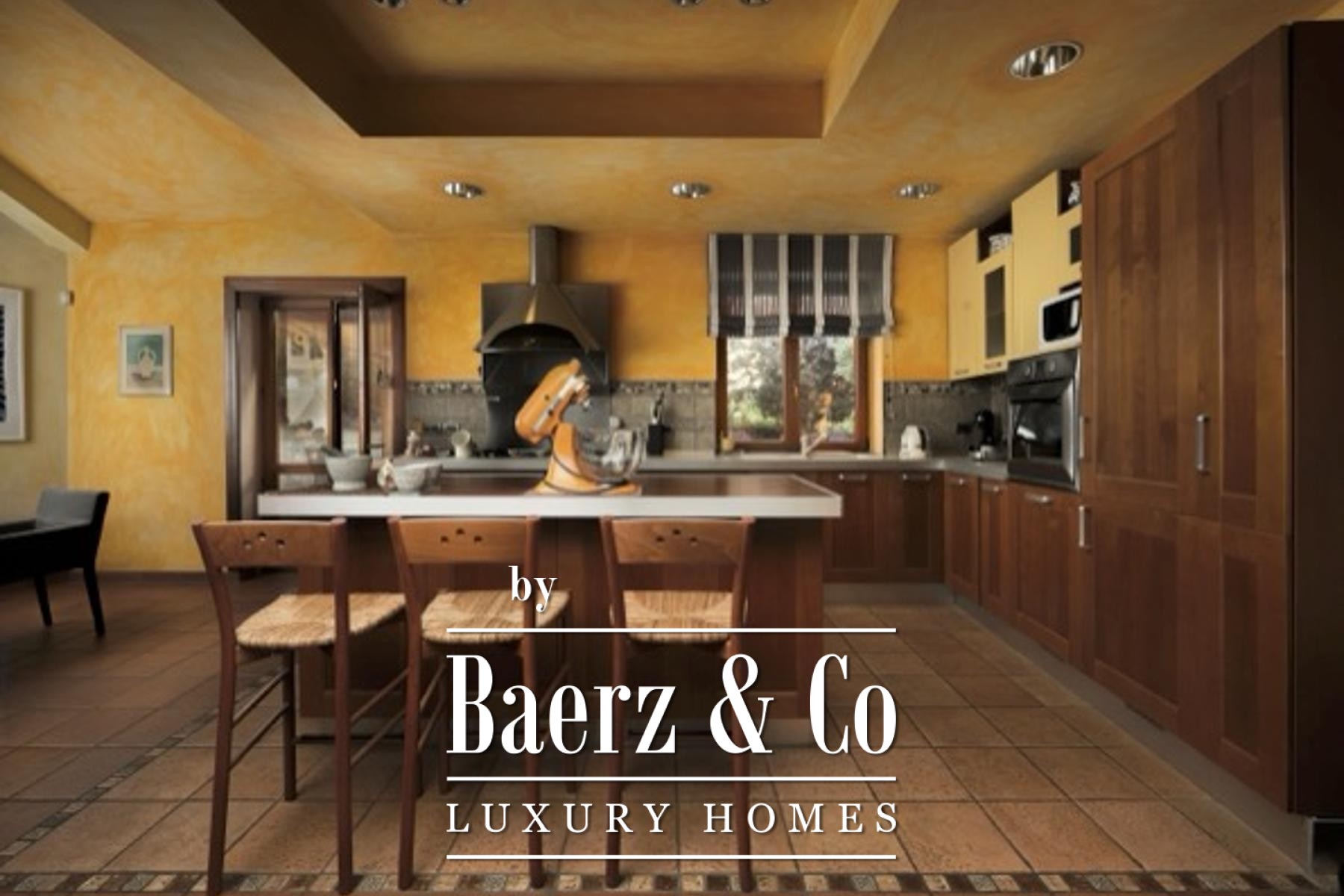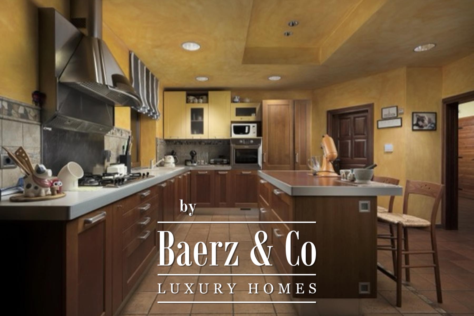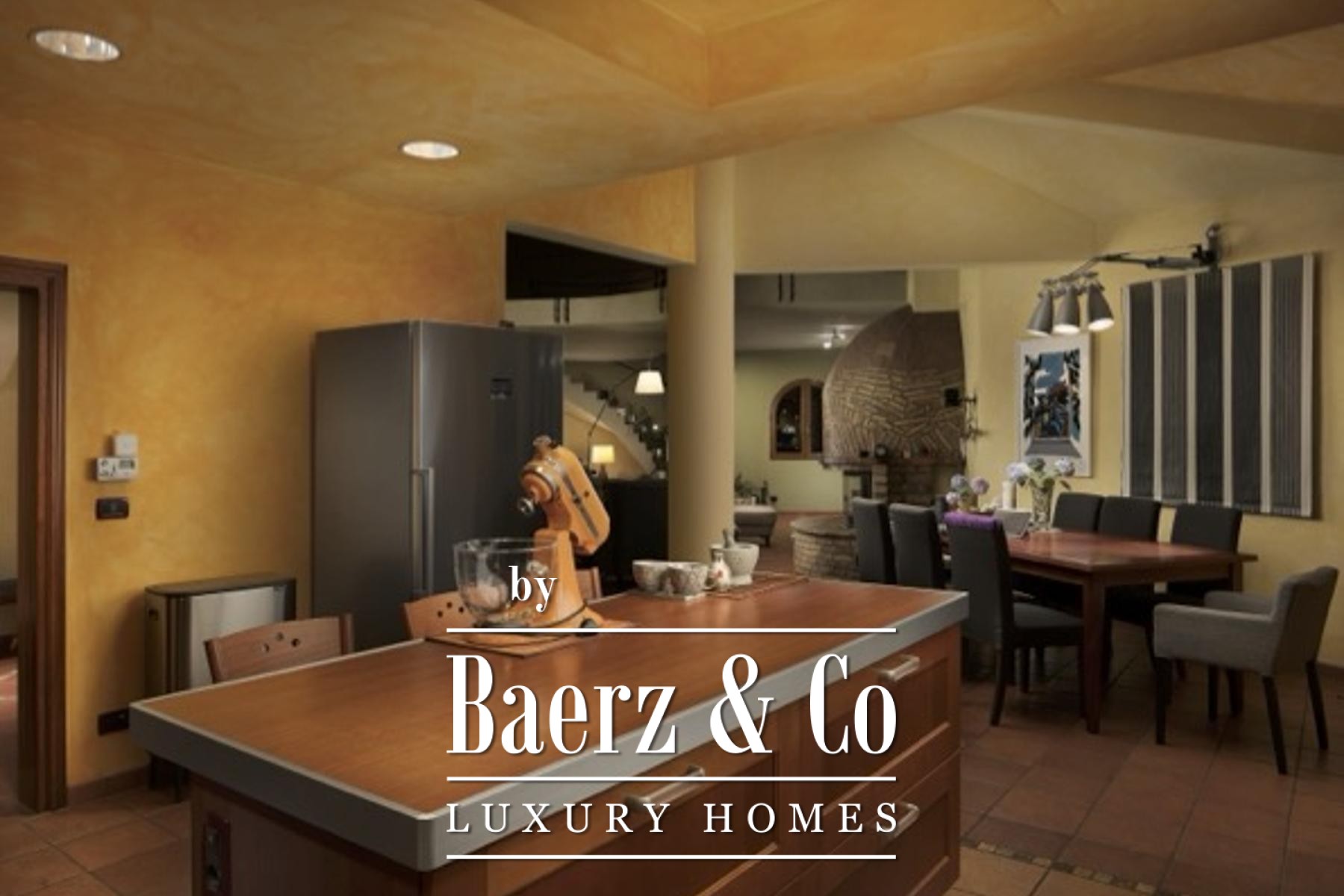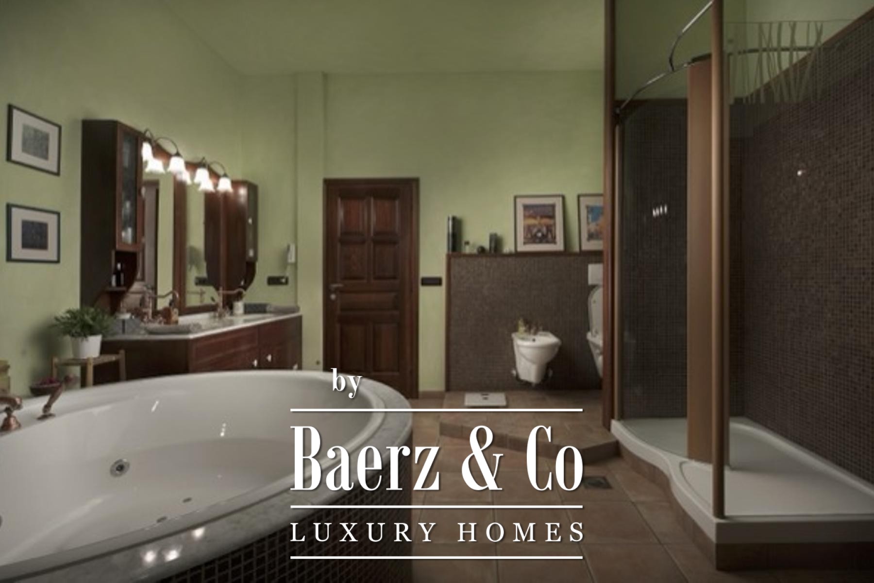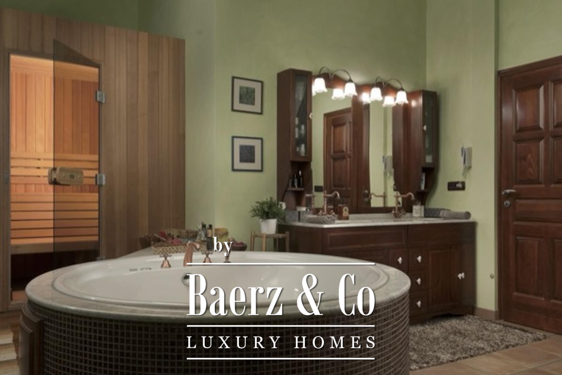 Inside, the 350 m² of living space is meticulously arranged for both comfort and quiet luxury. Five bedrooms provide flexibility for family and guests, with a master suite that includes a private bathroom, walk-in closet, and sauna. The main living area is anchored by a fireplace and flows toward a terrace overlooking the garden. Modern conveniences include a smart home system, fully equipped kitchen, and photo-solar panels delivering 11 kW of energy efficiency. A spacious storage room and five bathrooms further enhance everyday ease.