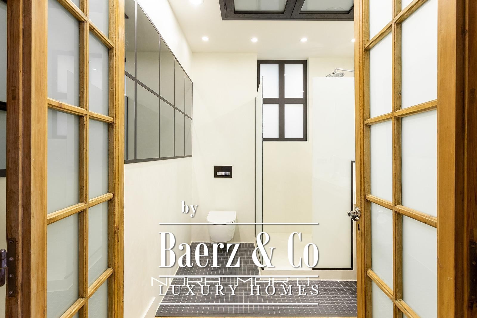 The duplex features five spacious and serene rooms for relaxation, three of them on the lower floor and two more on the upper floor, one of which is a suite with a dressing room, like an intimate retreat within the home. Three full bathrooms and an additional toilet complete this dwelling designed for well-being.