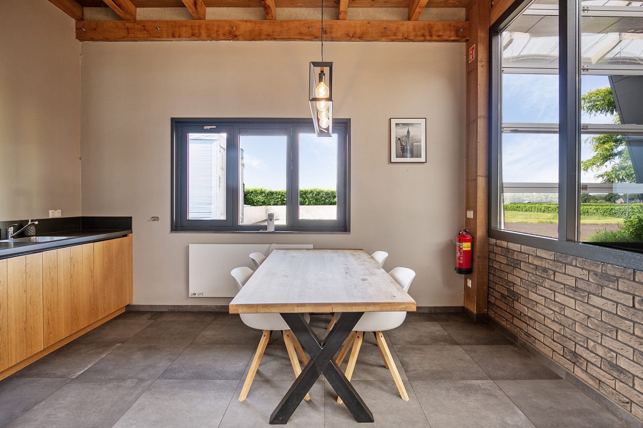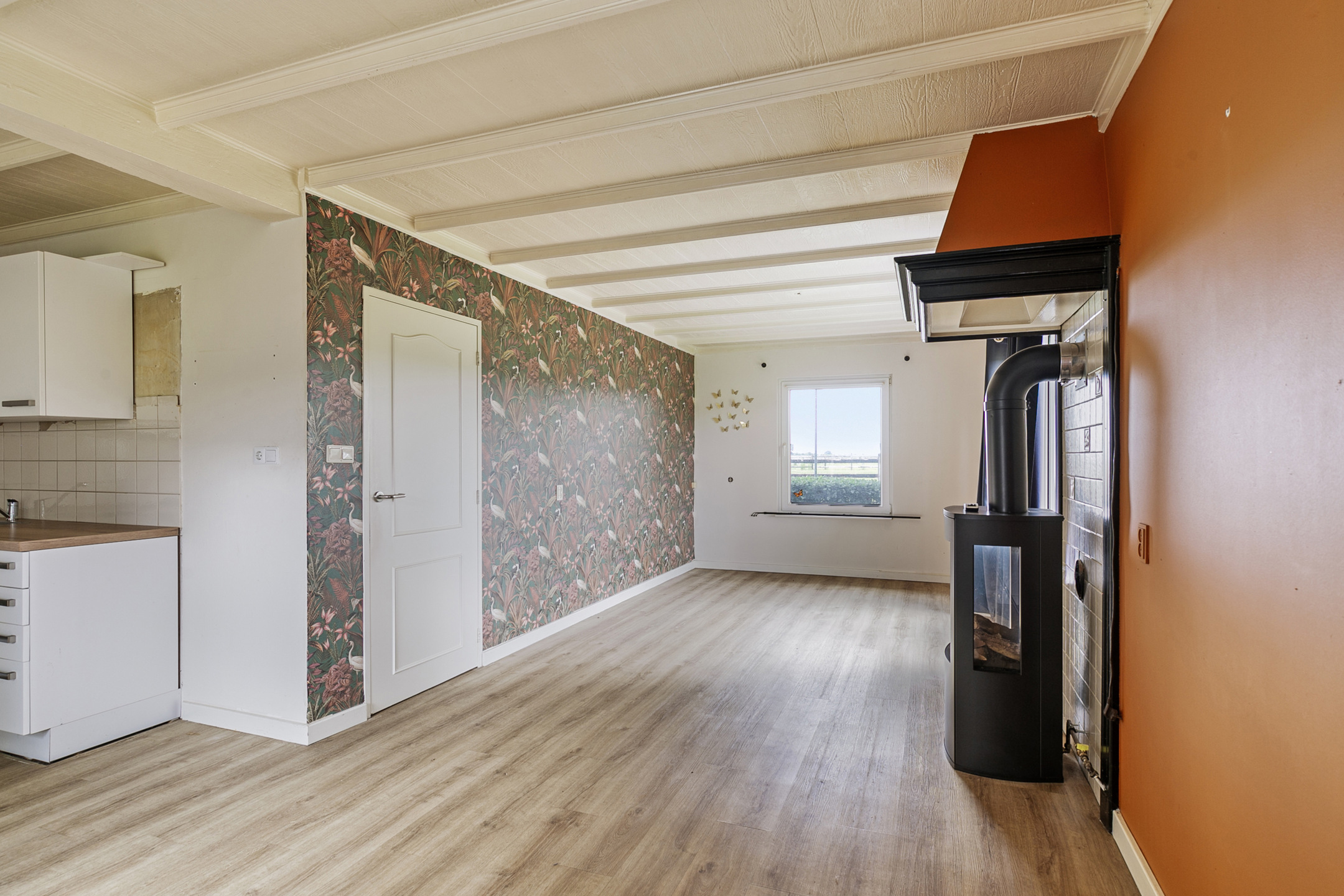 The living room with open kitchen is finished with a laminate floor, partly stucco and partly papered walls and a wooden beamed ceiling, in a light colour scheme. Here, too, several windows provide plenty of light. There is also a fireplace with a gas stove. The corner kitchen unit is equipped with a sink, gas hob, oven, dishwasher and fridge. The practical utility room has vinyl flooring and fully tiled walls. A wicket door provides access to the rear garden and there is a simple kitchenette with a sink and storage space.