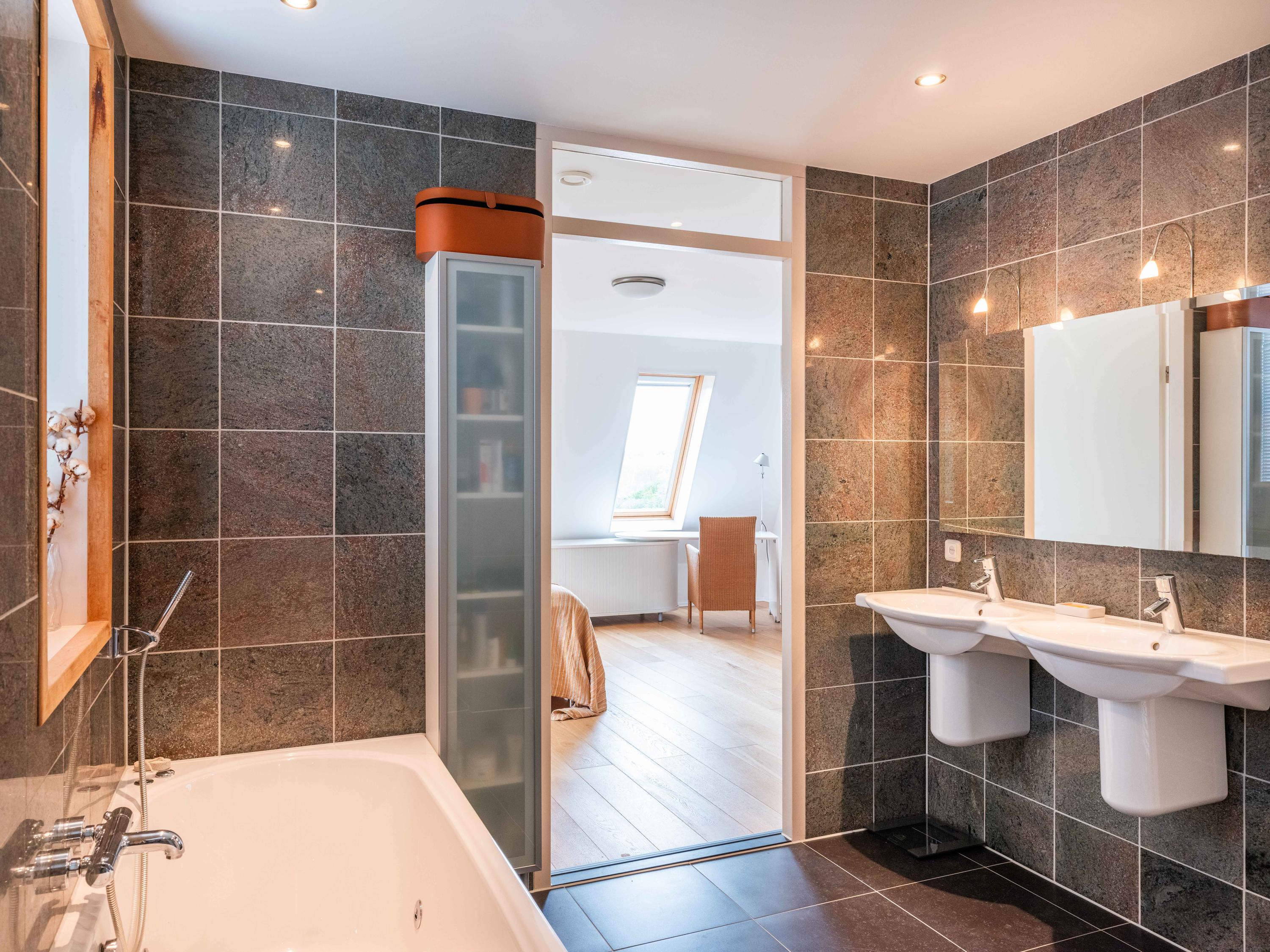 The living room also has two cosy seating areas. The room flows into the open kitchen, which is fully equipped with high-quality built-in appliances and plenty of storage space. On this floor there is also an office/bedroom and the first bathroom with shower, toilet and washbasin.