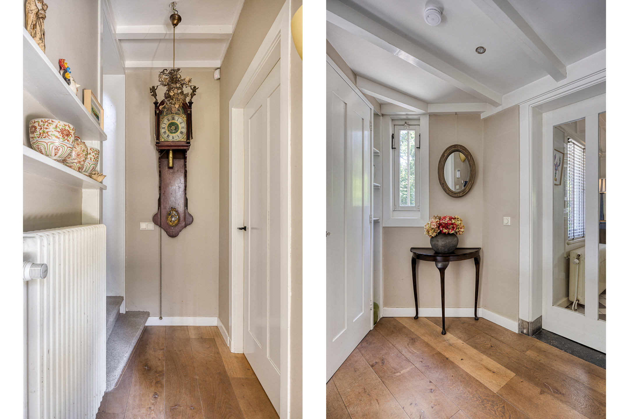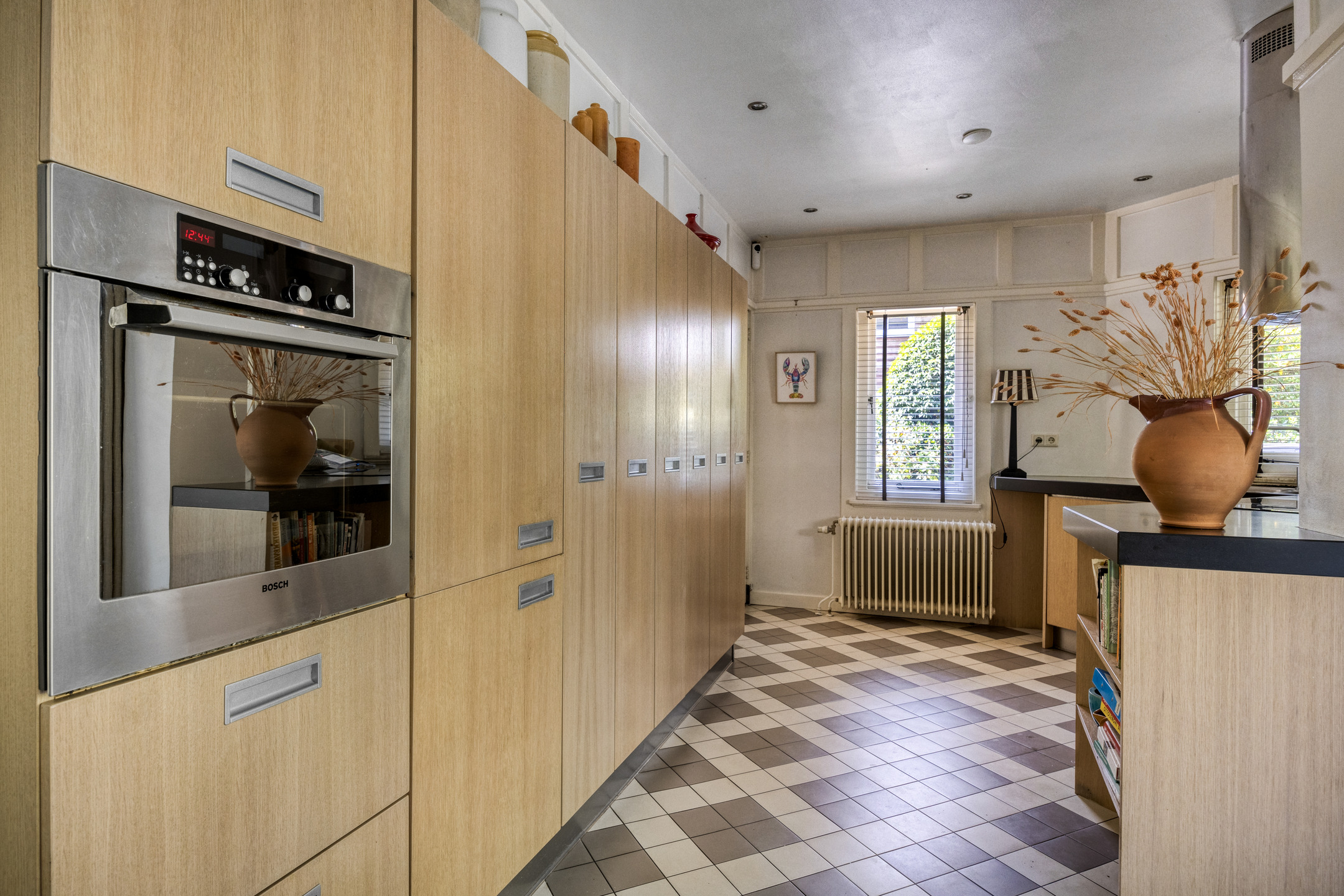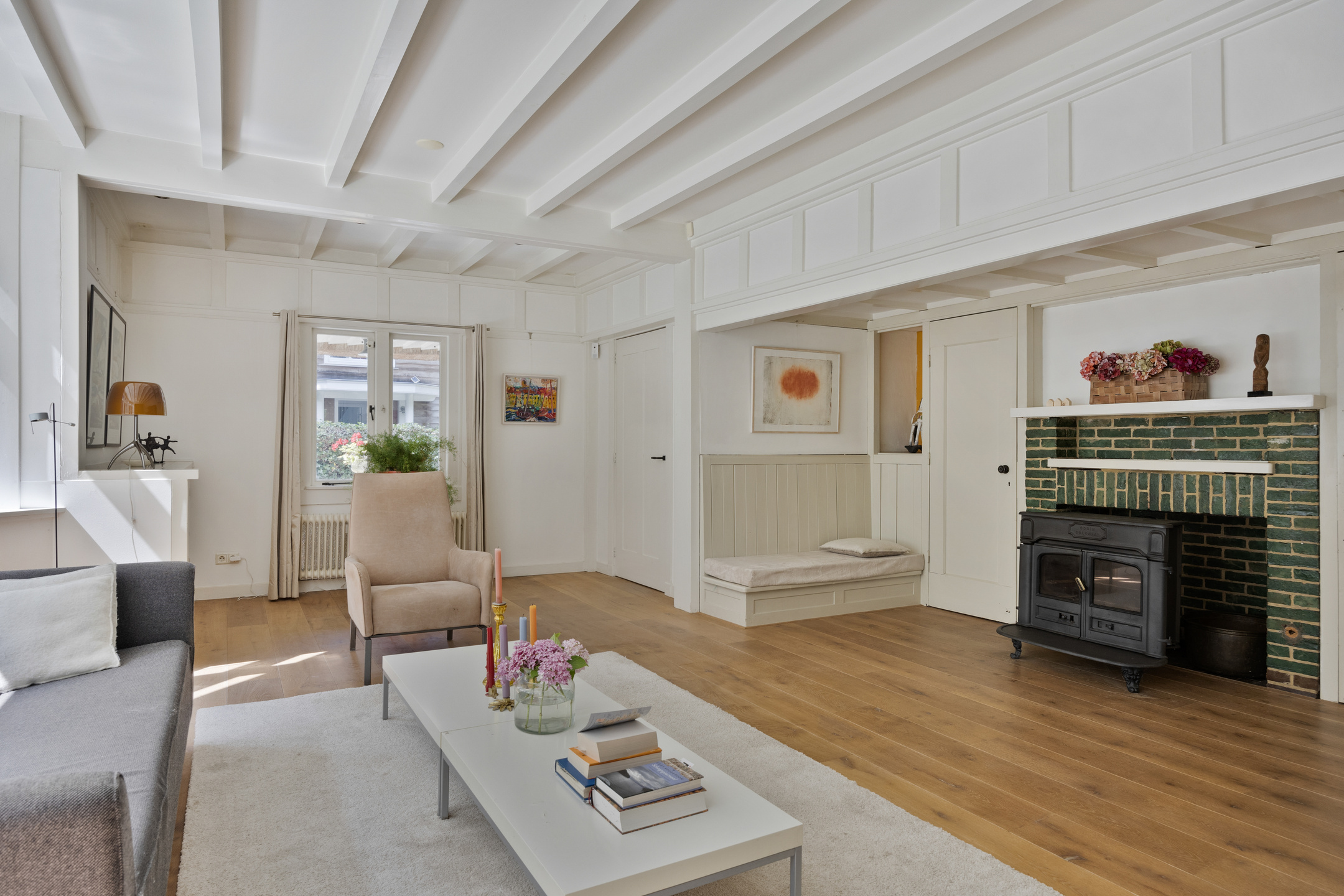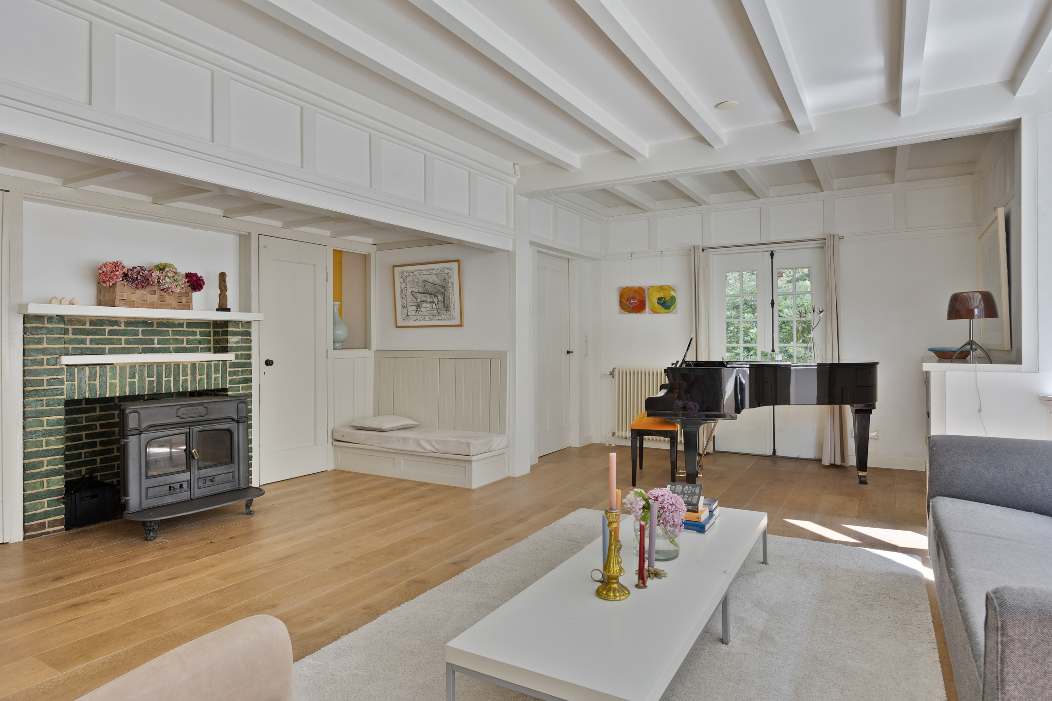 The generous living room with bay window, wood-burning stove, original built-in cabinets and characteristic beamed ceiling exudes atmosphere and authenticity. The living room, kitchen and TV room all feature an original fireplace. The deep cellar is also accessible from the hallway, ideal for wine storage.