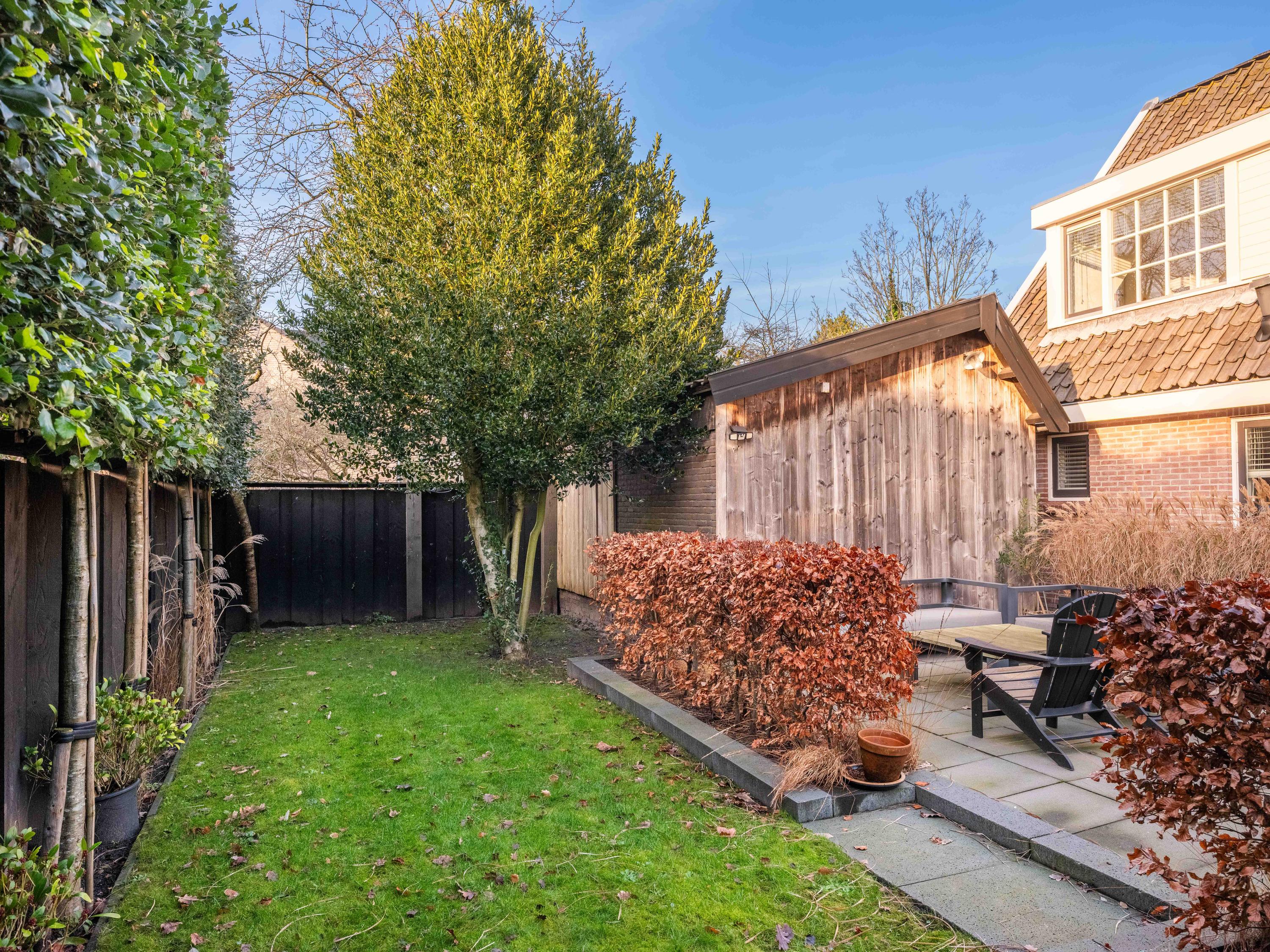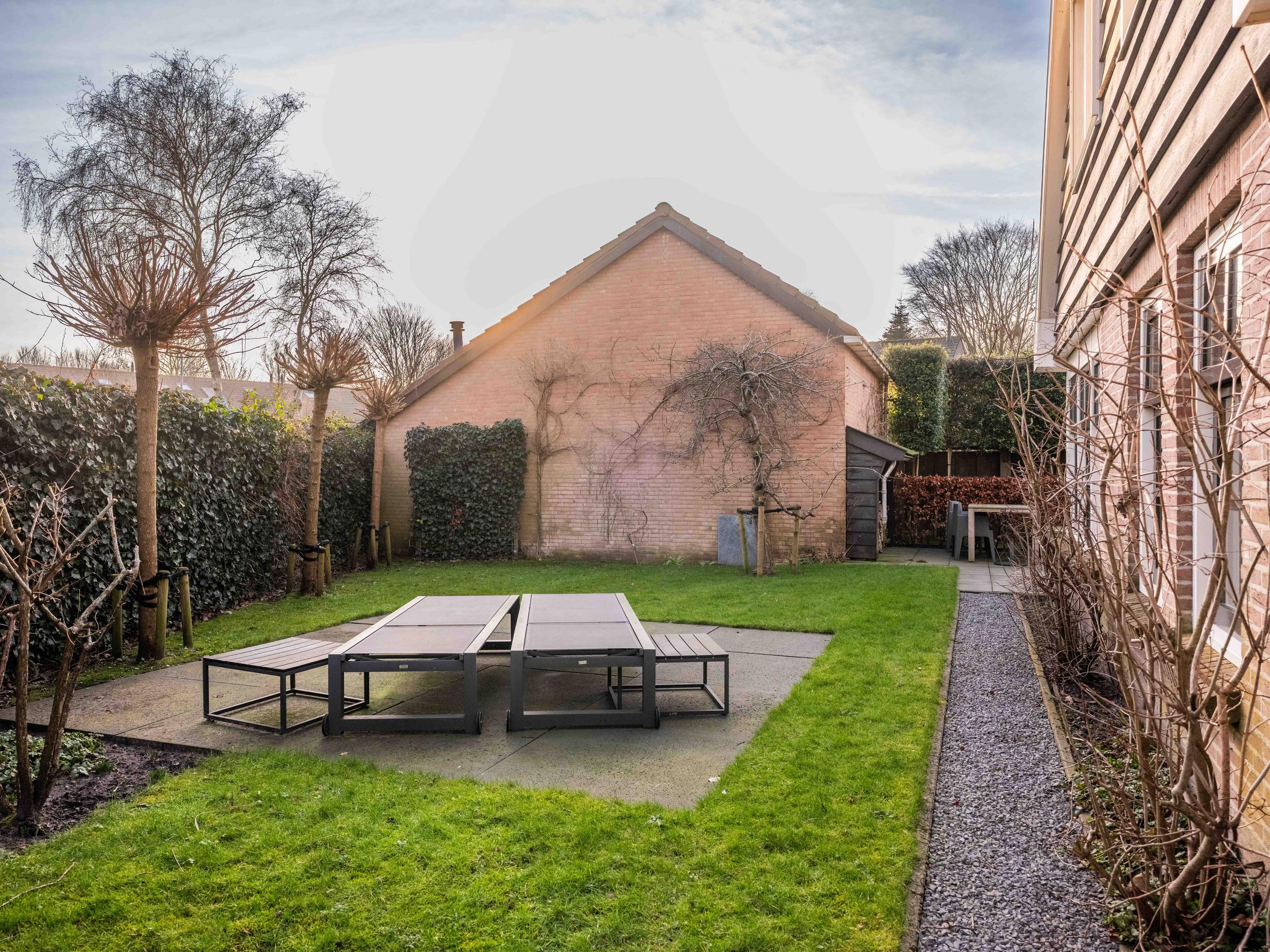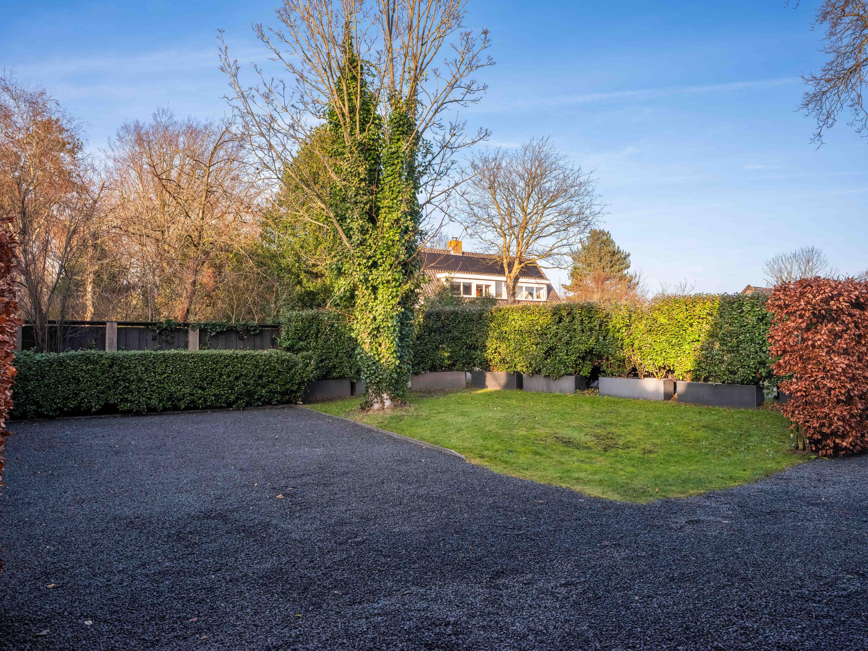 The house is surrounded by a beautifully landscaped garden with natural fencing, offering plenty of privacy. The total plot officially measures 537 m2. At the front is a spacious driveway with parking for several cars. A detached storage shed has a covered carport. The garden borders a municipal park – a location that gives a unique feeling of space and freedom, while the center of Bergen is only a few minutes away.