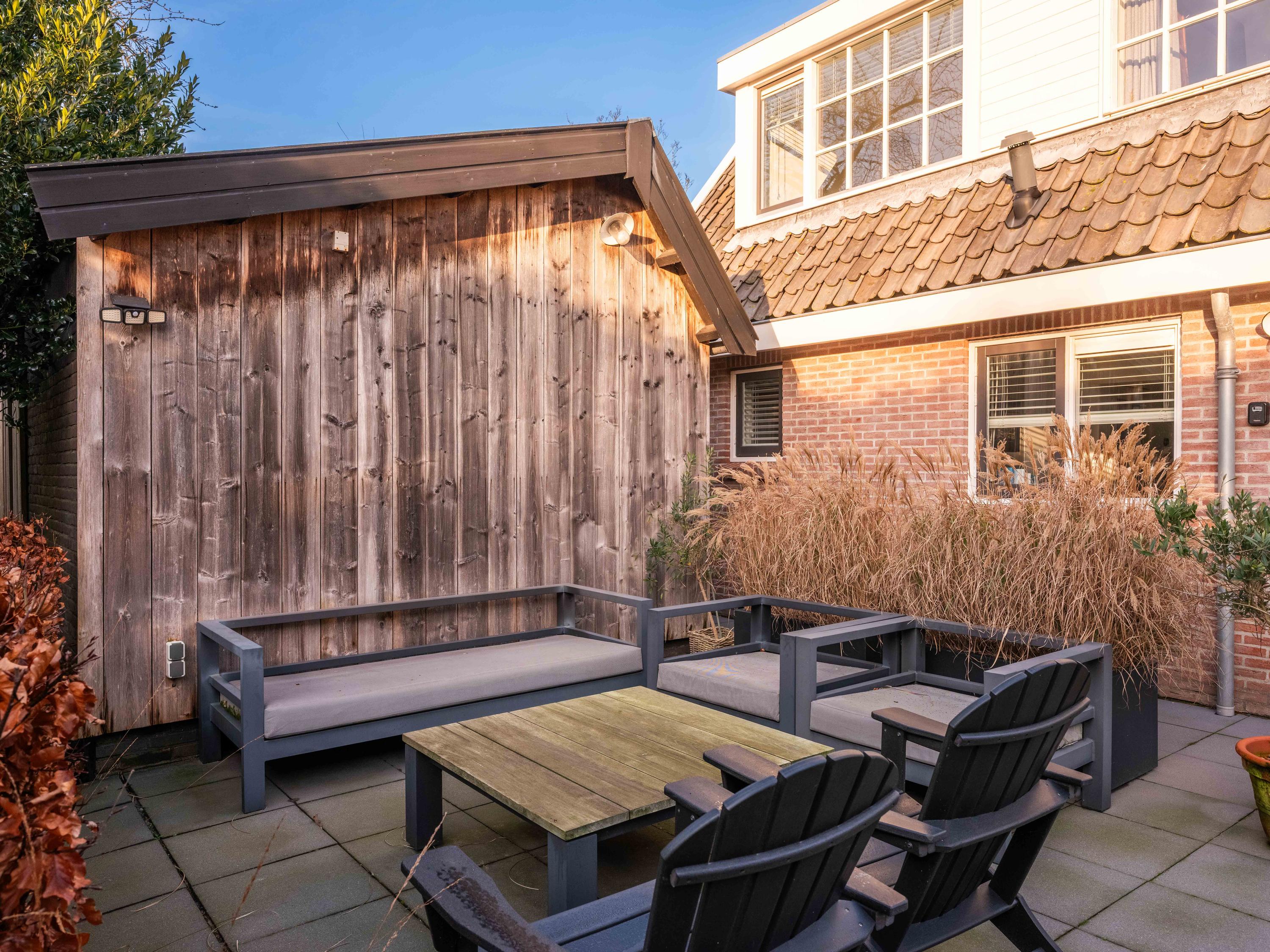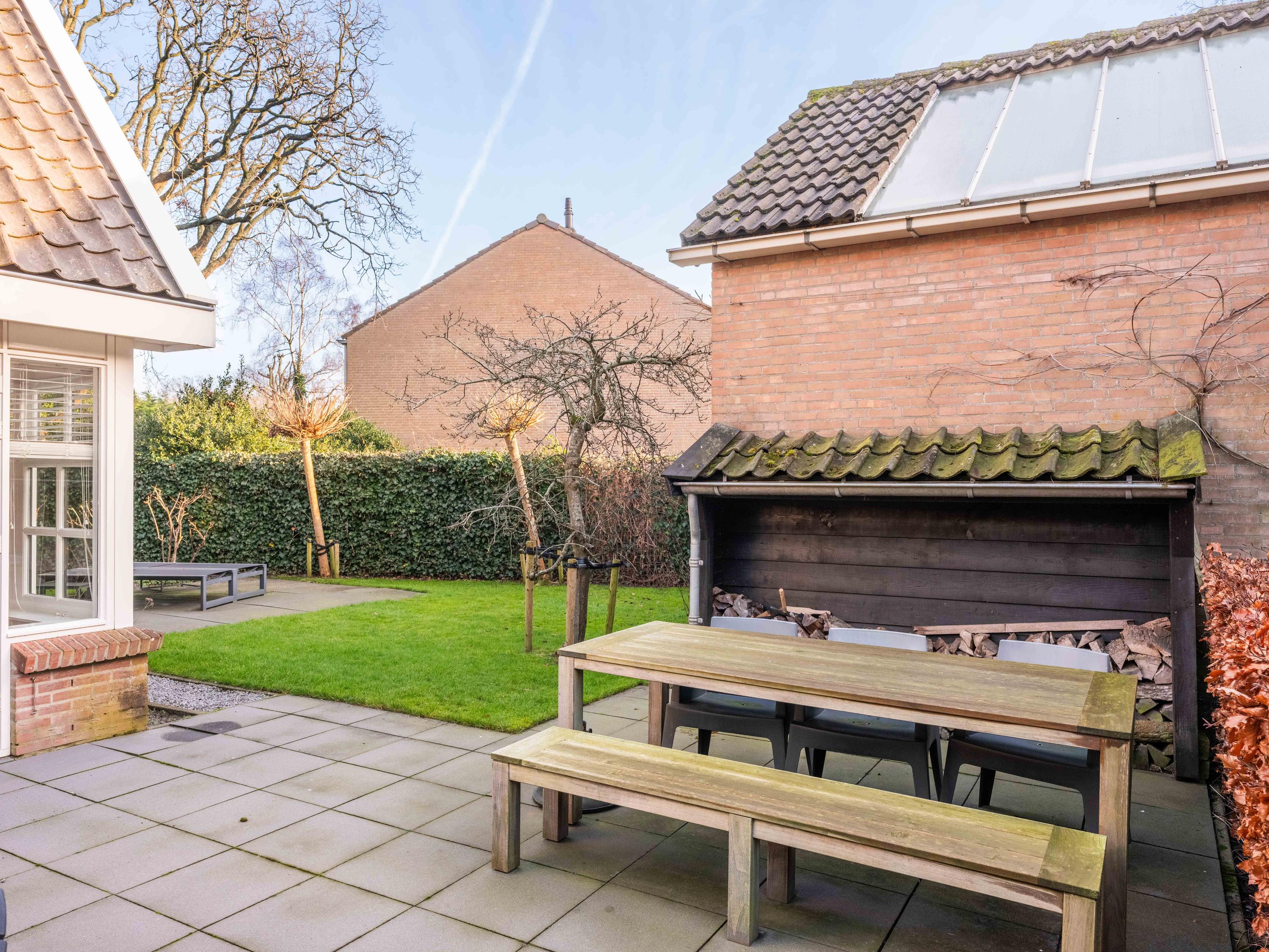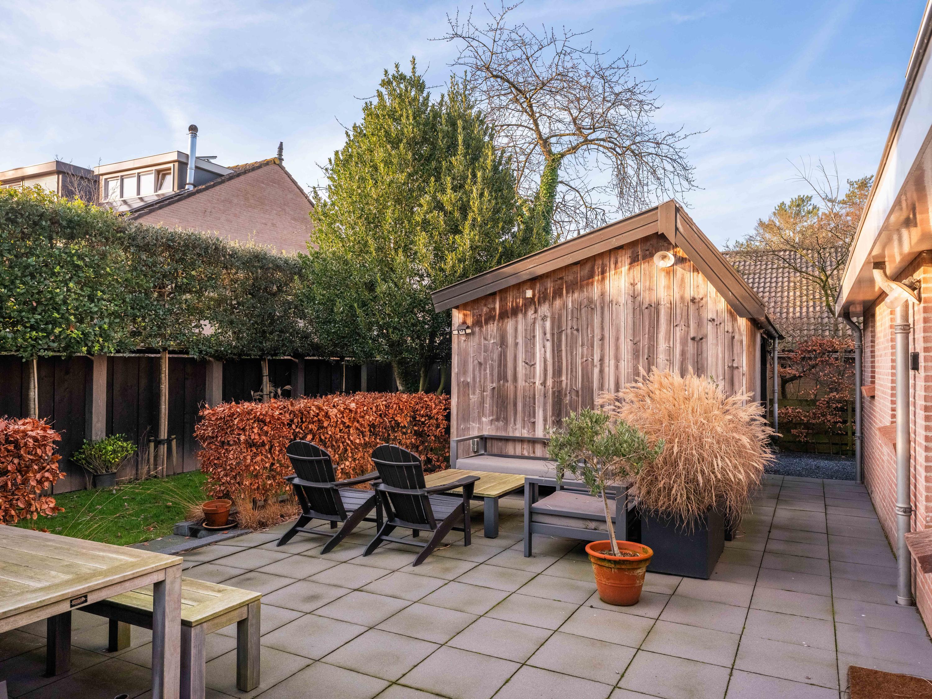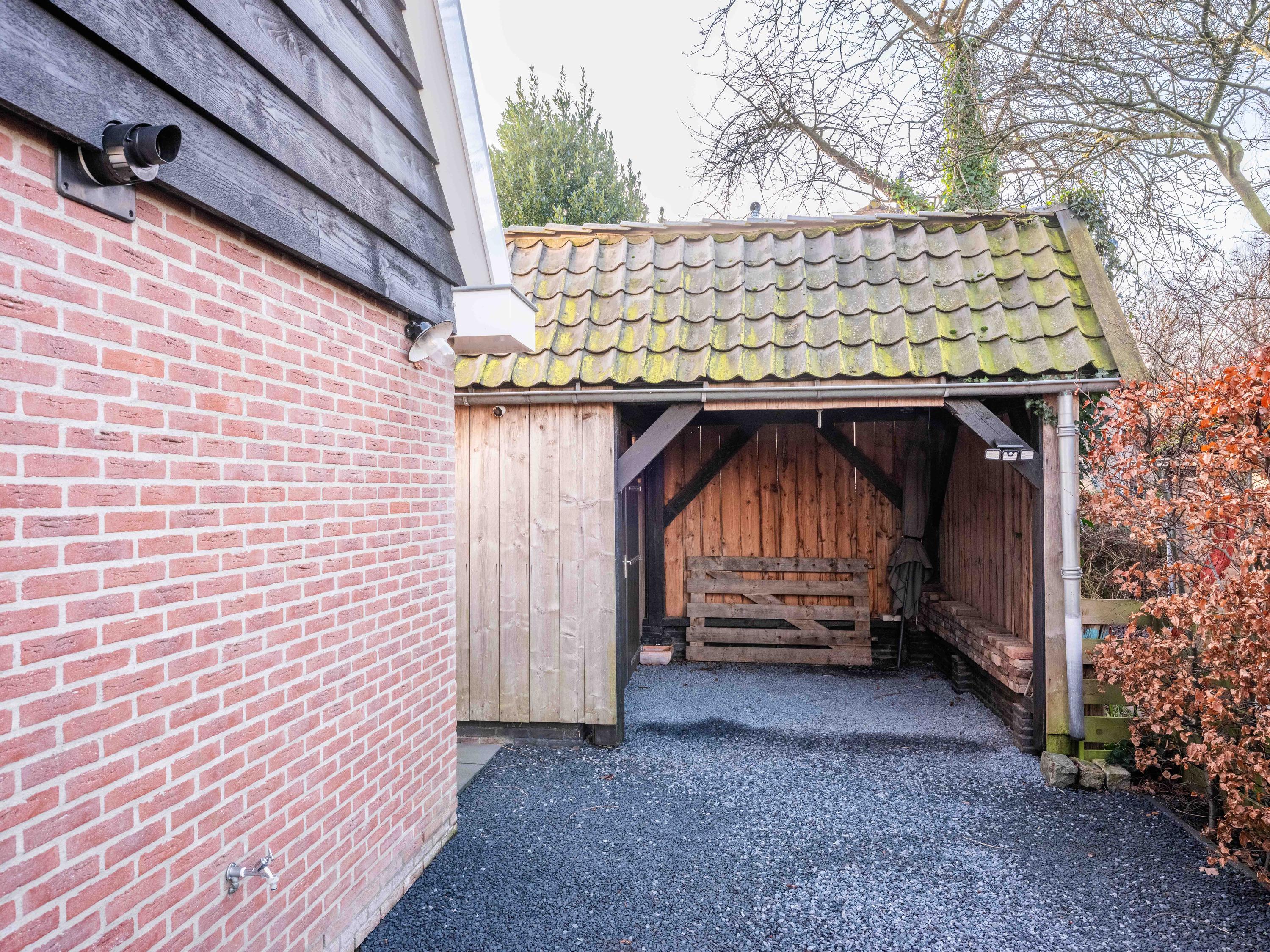 The house is surrounded by a beautifully landscaped garden with natural fencing, offering plenty of privacy. The total plot officially measures 537 m2. At the front is a spacious driveway with parking for several cars. A detached storage shed has a covered carport. The garden borders a municipal park – a location that gives a unique feeling of space and freedom, while the center of Bergen is only a few minutes away.