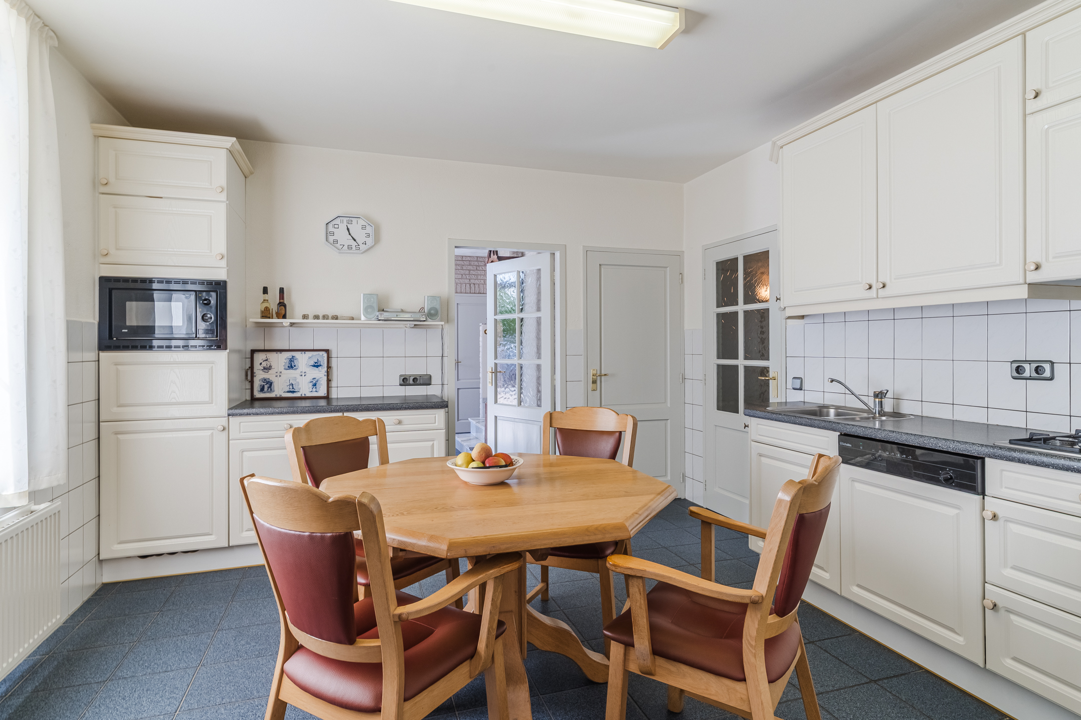 Approx. 15.5 m², tiled flooring with underfloor heating, partly tiled walls, plastered ceiling, and two parallel kitchen units equipped with a 4-burner gas hob, extractor hood, 1.5 sink, refrigerator, combination microwave, dishwasher, and deep pantry under the stairs.