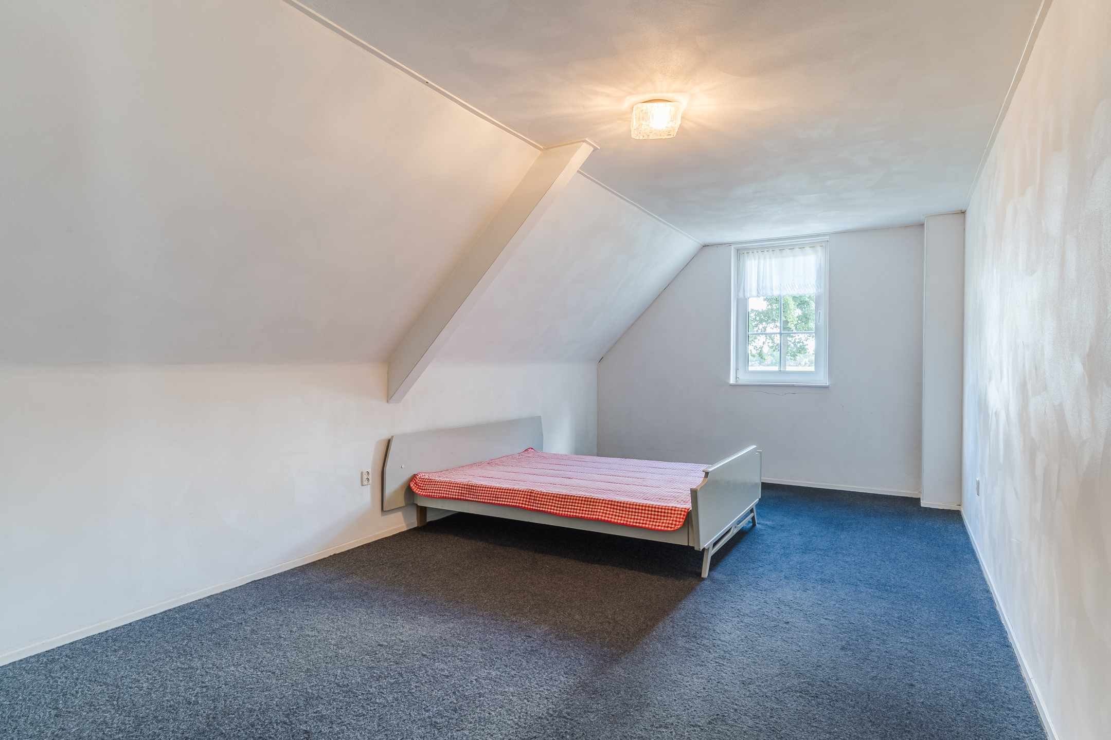 Approx. 19.5 m², carpet flooring, plastered walls and ceiling, dormer window, knee wall storage, and access to attic via retractable stairs.
