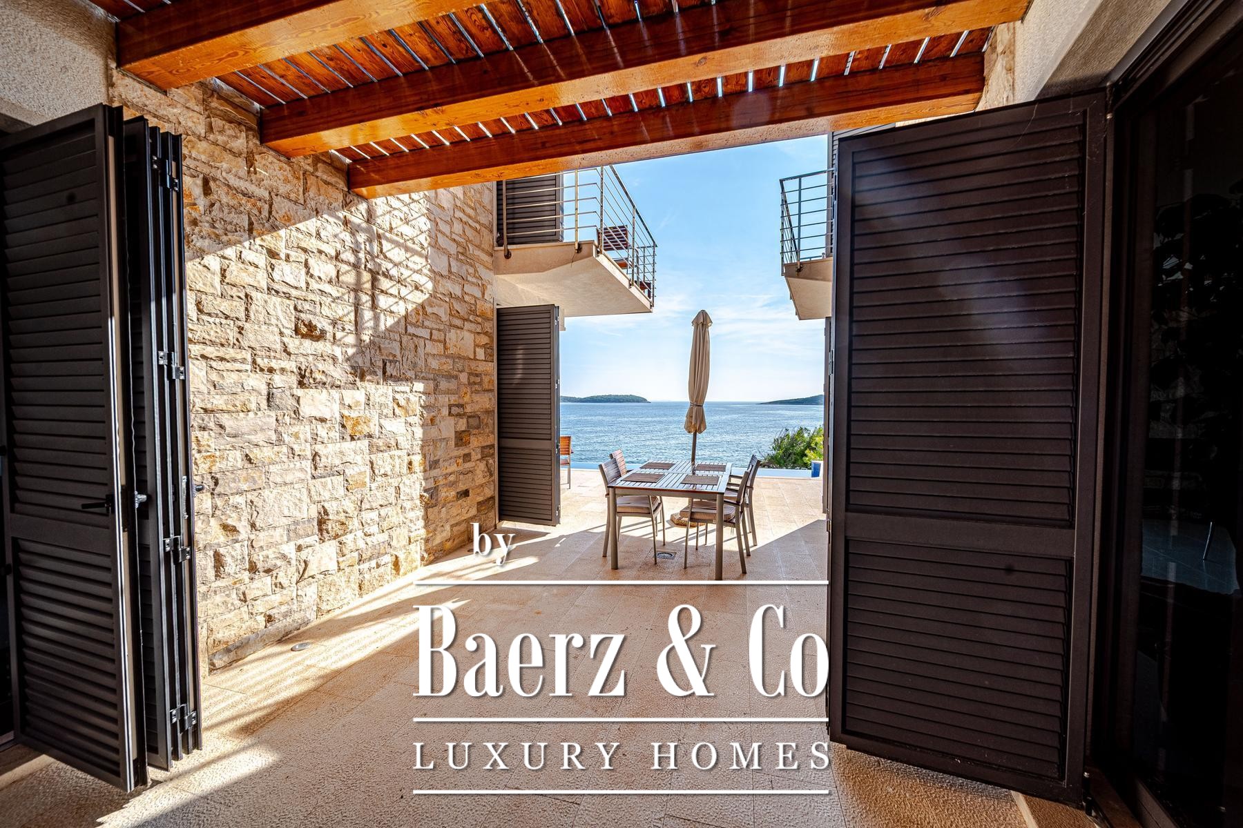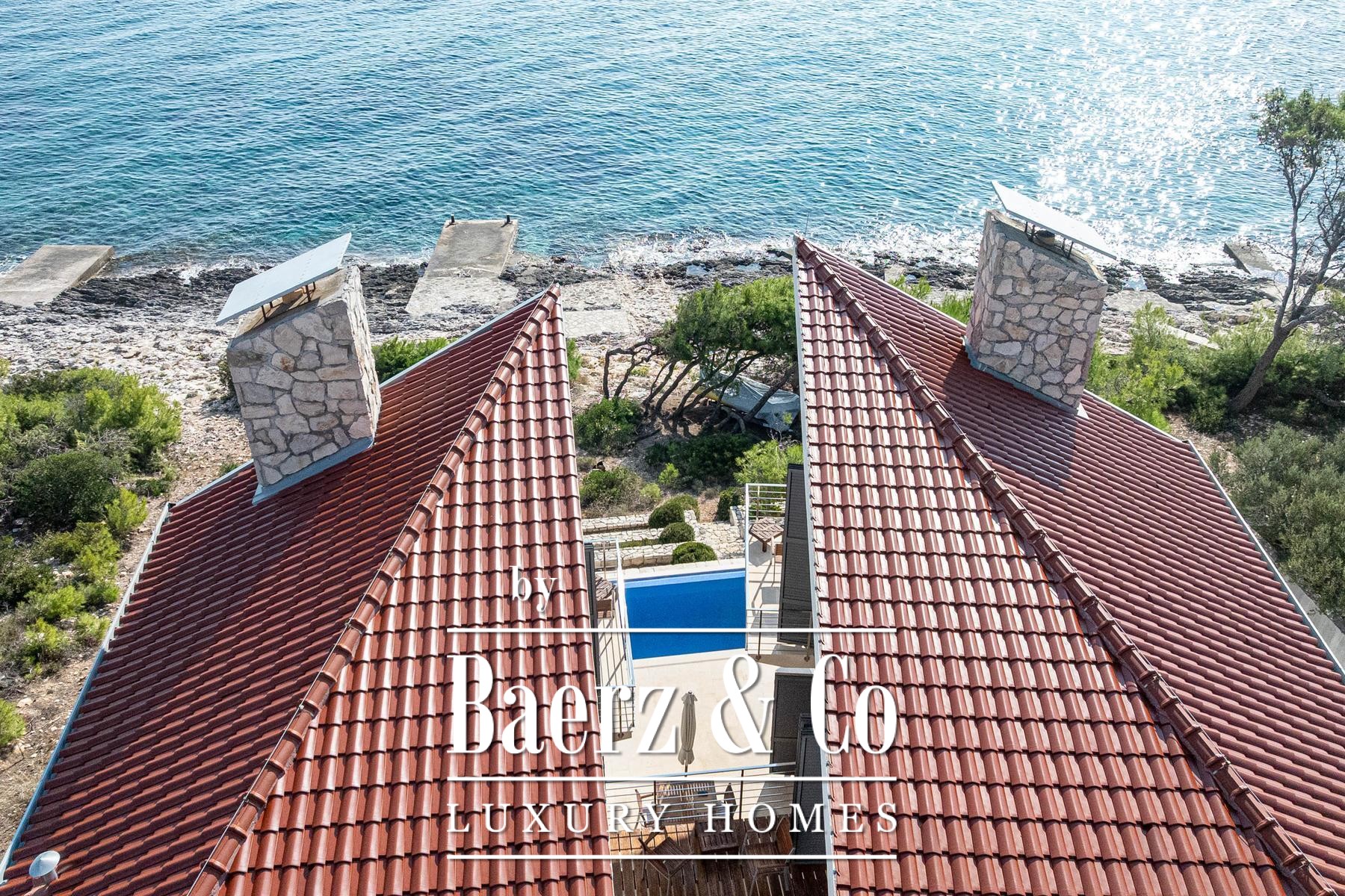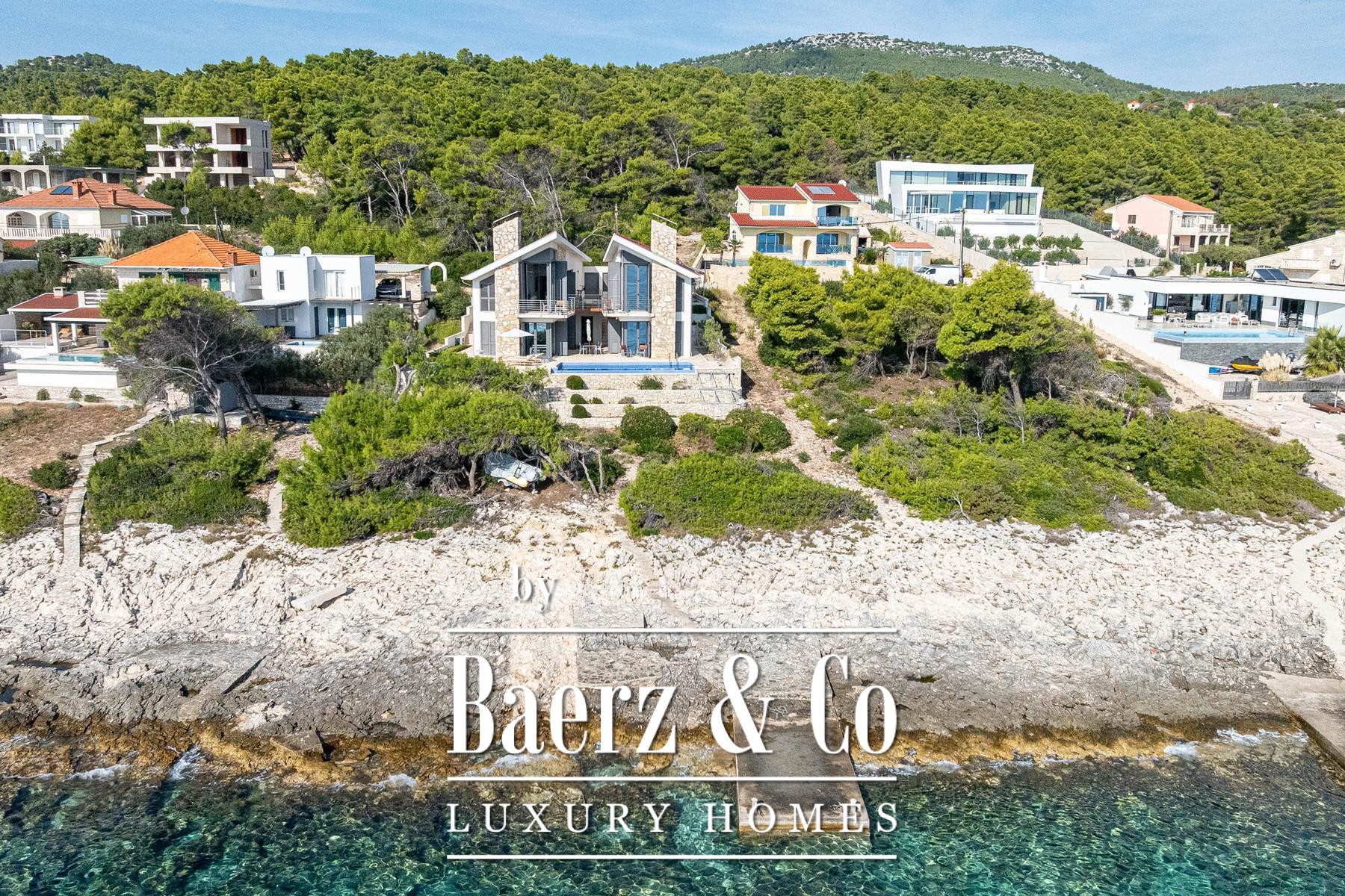This villa Blato is set directly on the seashore in Croatia, presenting 260 m² of interior living across a 500 m² plot. Architectural clarity defines the residence, composed of two independent units linked by broad terraces, each functioning as a self-contained home. The main floor of both units offers combined living, dining, and kitchen spaces, while upstairs, each provides two bedrooms, all with en suite bathrooms and private terraces.