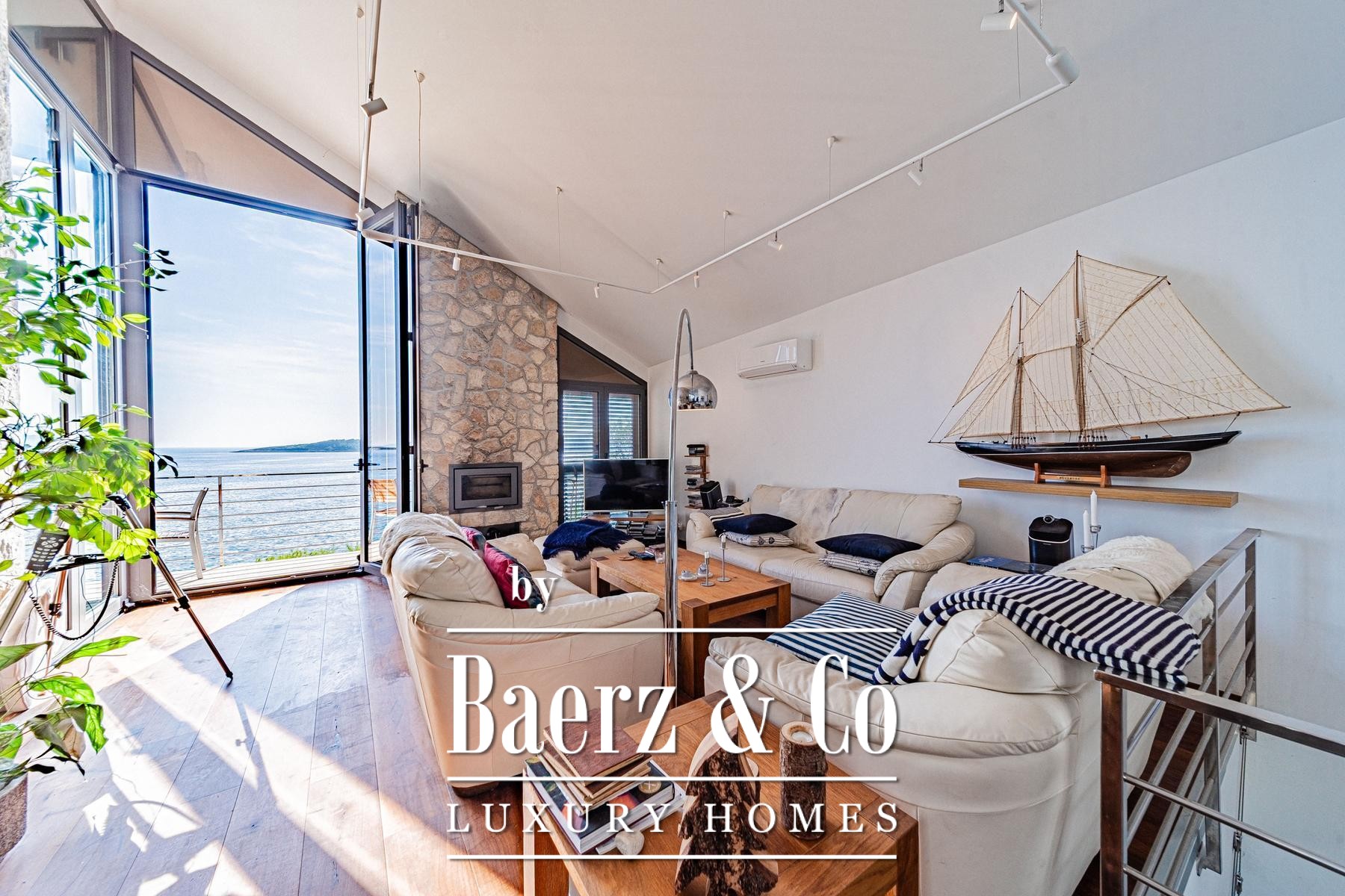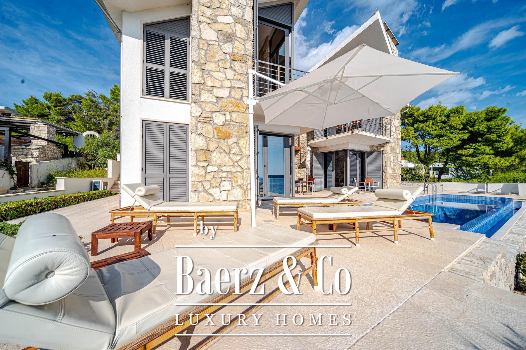 The landscape in front of the villa features pale stone paving, a swimming pool and dedicated areas for sunbathing, all designed to encourage easeful living by the sea. A pedestrian path brings you just 15 metres to the water, where a small pier allows for boat mooring and private retreat. Throughout, the materials and interior finishes display thoughtful attention to detail, imparting a sense of understated exclusivity.