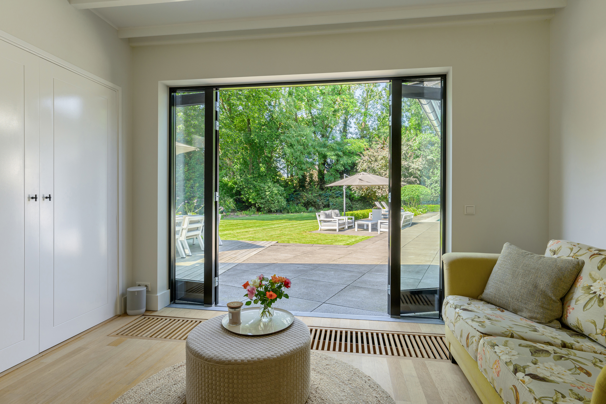 The beautifully landscaped garden offers optimal privacy and sun and shade spots throughout the day. The landscaping includes a large lawn, various terraces (made of large tiles and decking), beautiful trees, shrubs, and borders with very diverse planting.