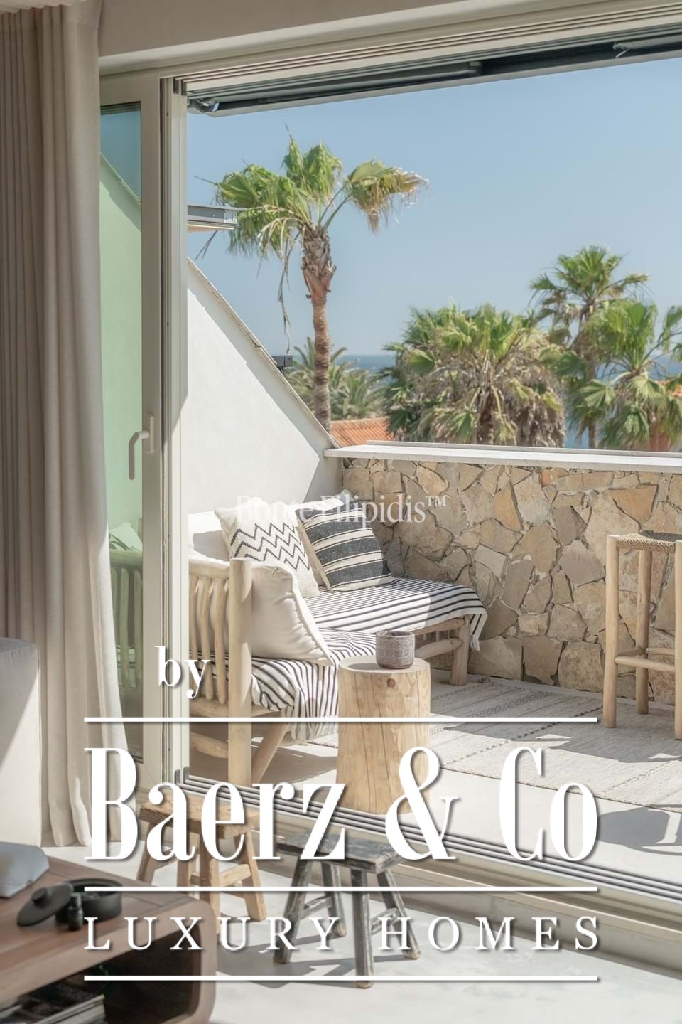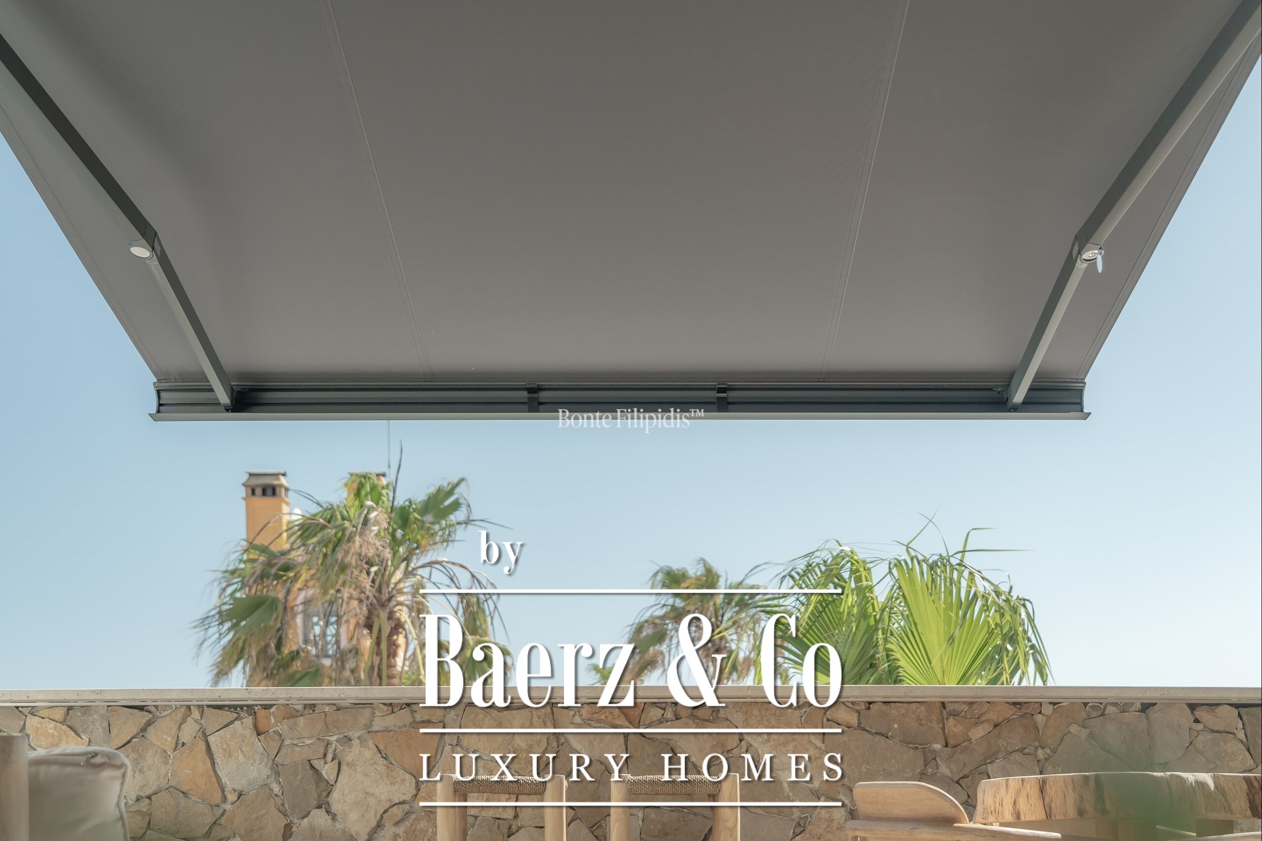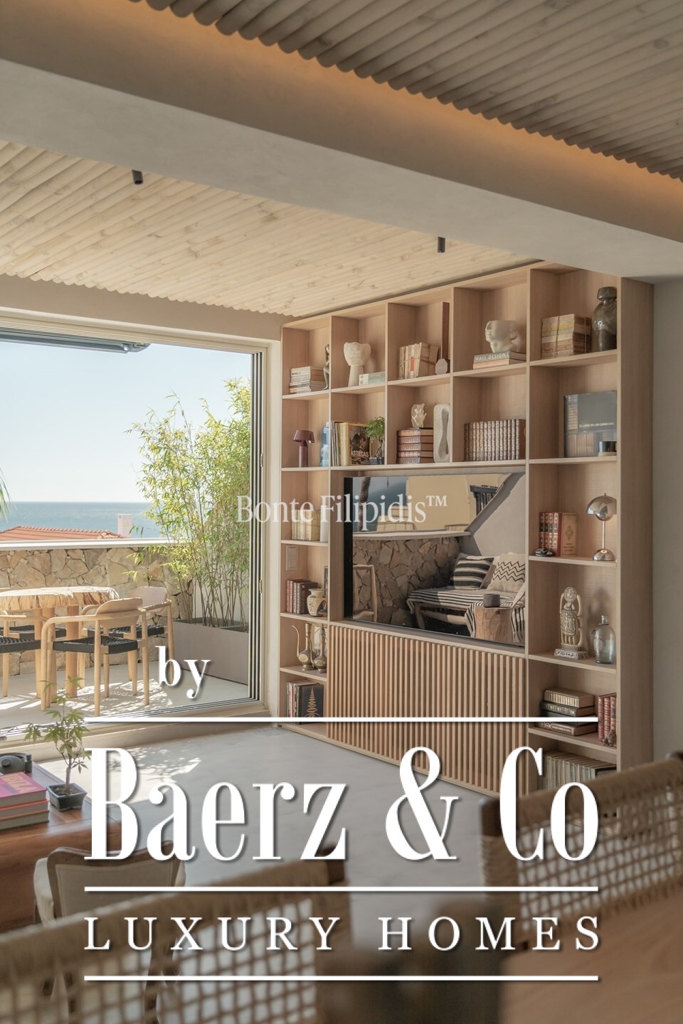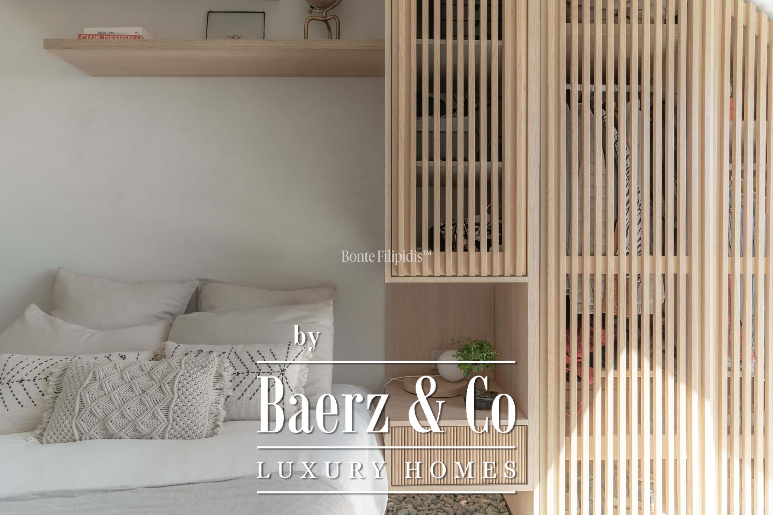 The 88 m² layout offers a seamless flow between the open-plan living room, dining area, and kitchen, all with high-quality finishes and fully integrated appliances. The living room leads to a 19 m² terrace featuring a bar as well as an outdoor shower for cooling off under the sky, offering a calm vantage over the bay. In the private area, the en-suite bedroom ensures privacy, while the second bedroom features sea views, its own balcony, and an independent, full bathroom.