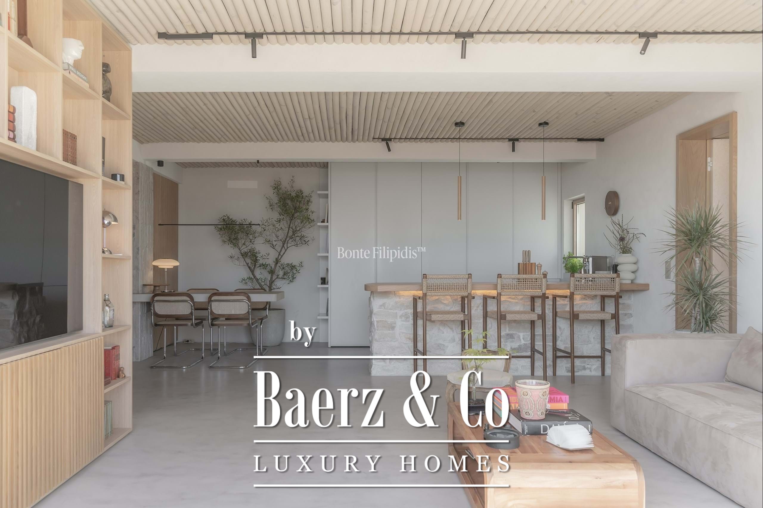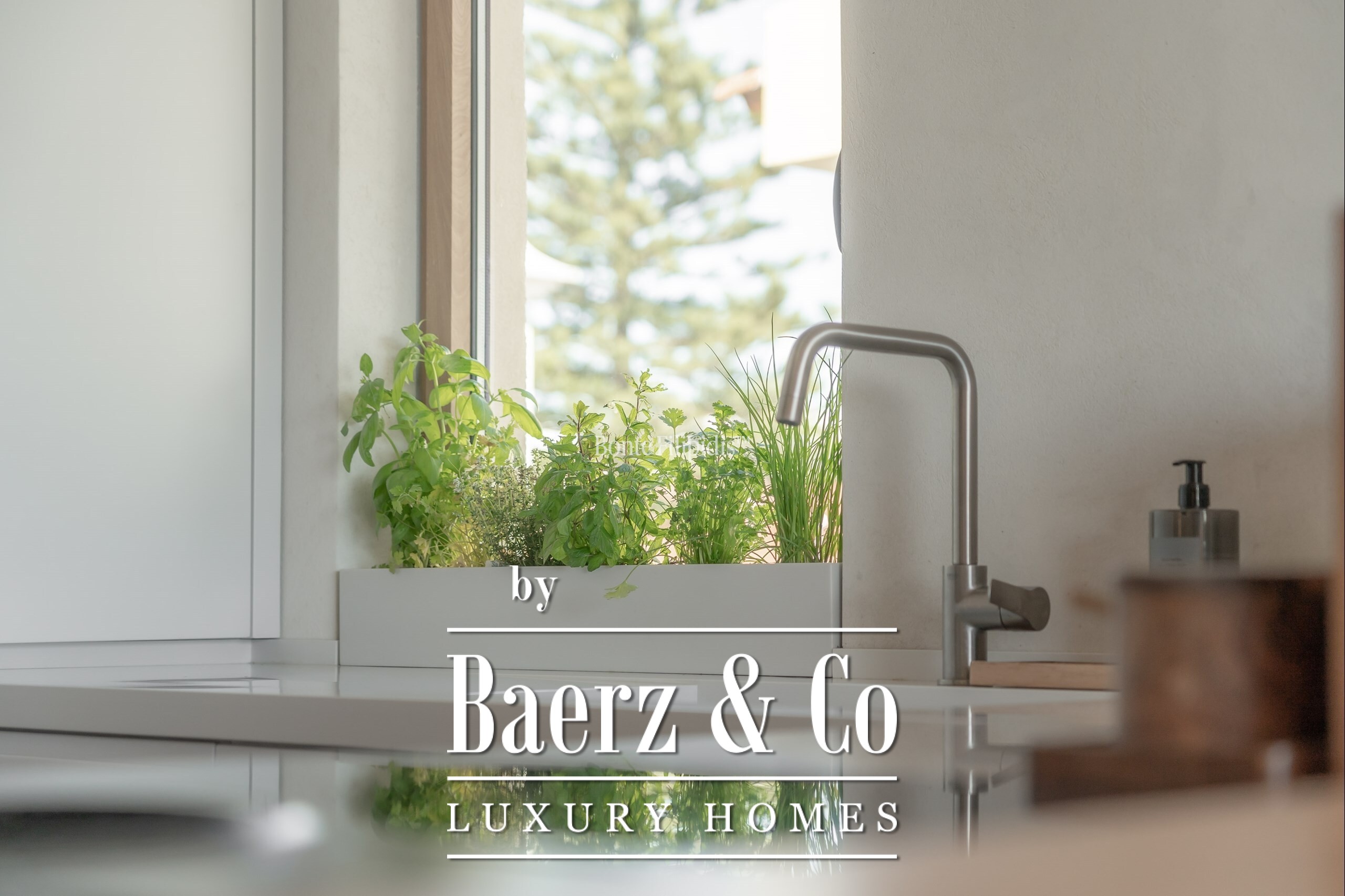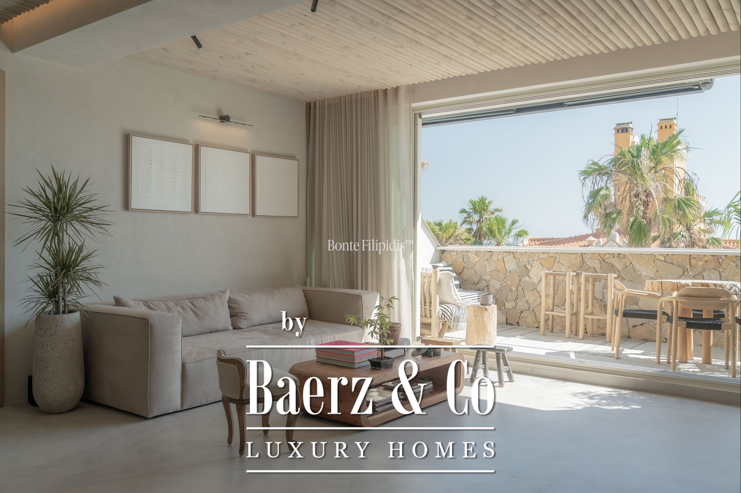 The 88 m² layout offers a seamless flow between the open-plan living room, dining area, and kitchen, all with high-quality finishes and fully integrated appliances. The living room leads to a 19 m² terrace featuring a bar as well as an outdoor shower for cooling off under the sky, offering a calm vantage over the bay. In the private area, the en-suite bedroom ensures privacy, while the second bedroom features sea views, its own balcony, and an independent, full bathroom.