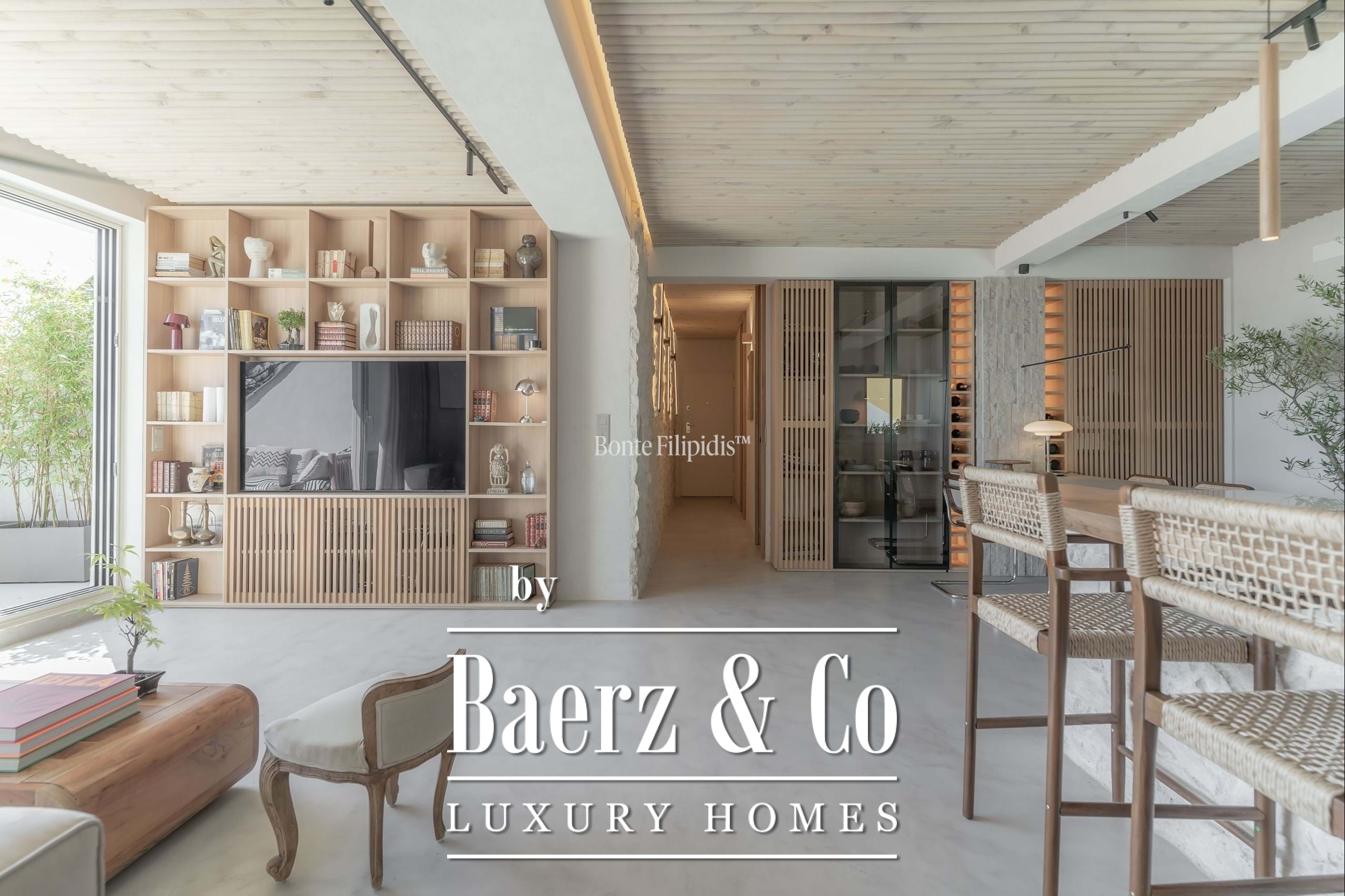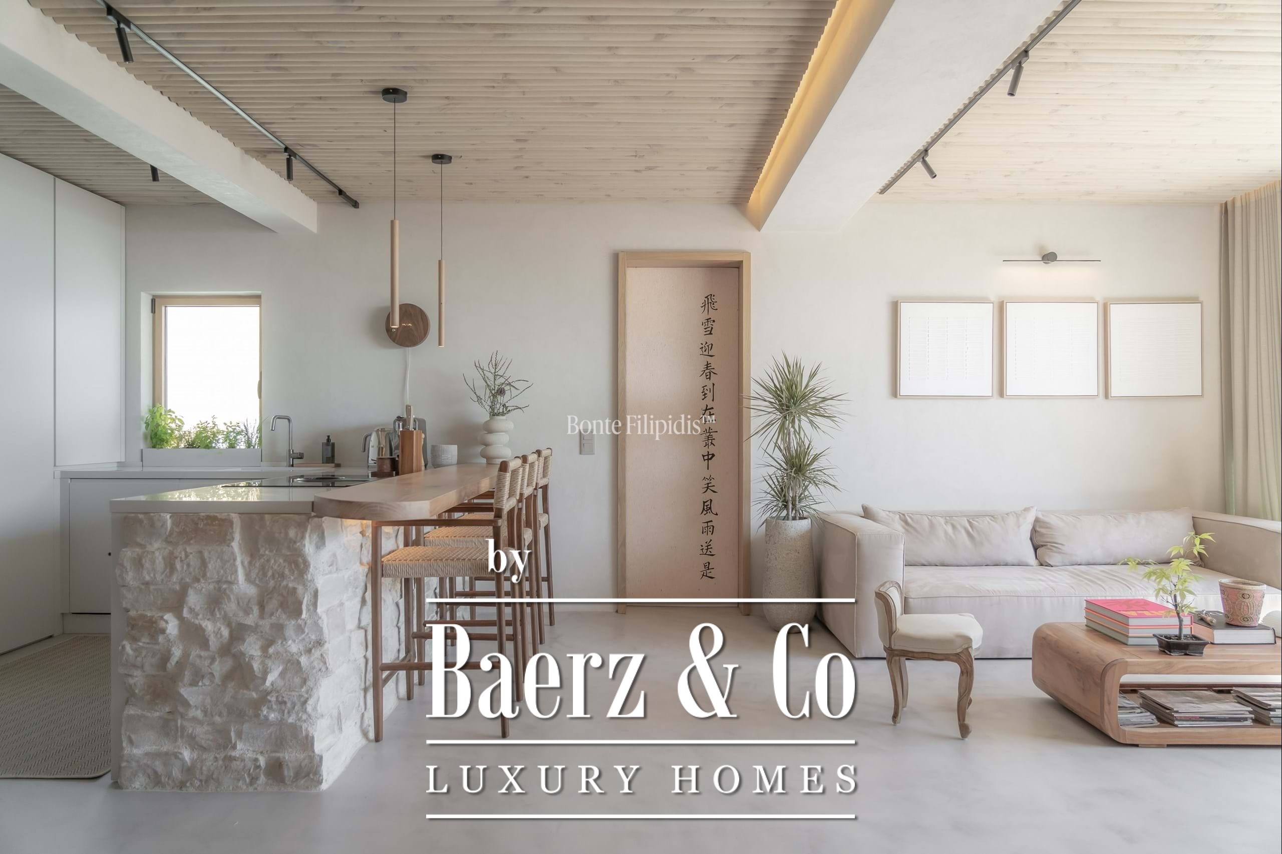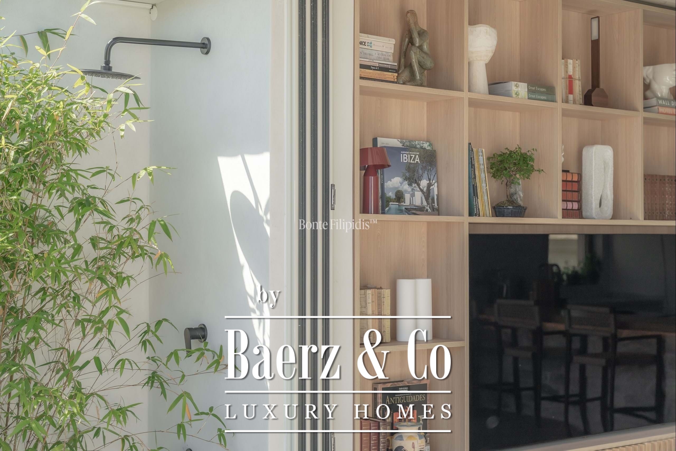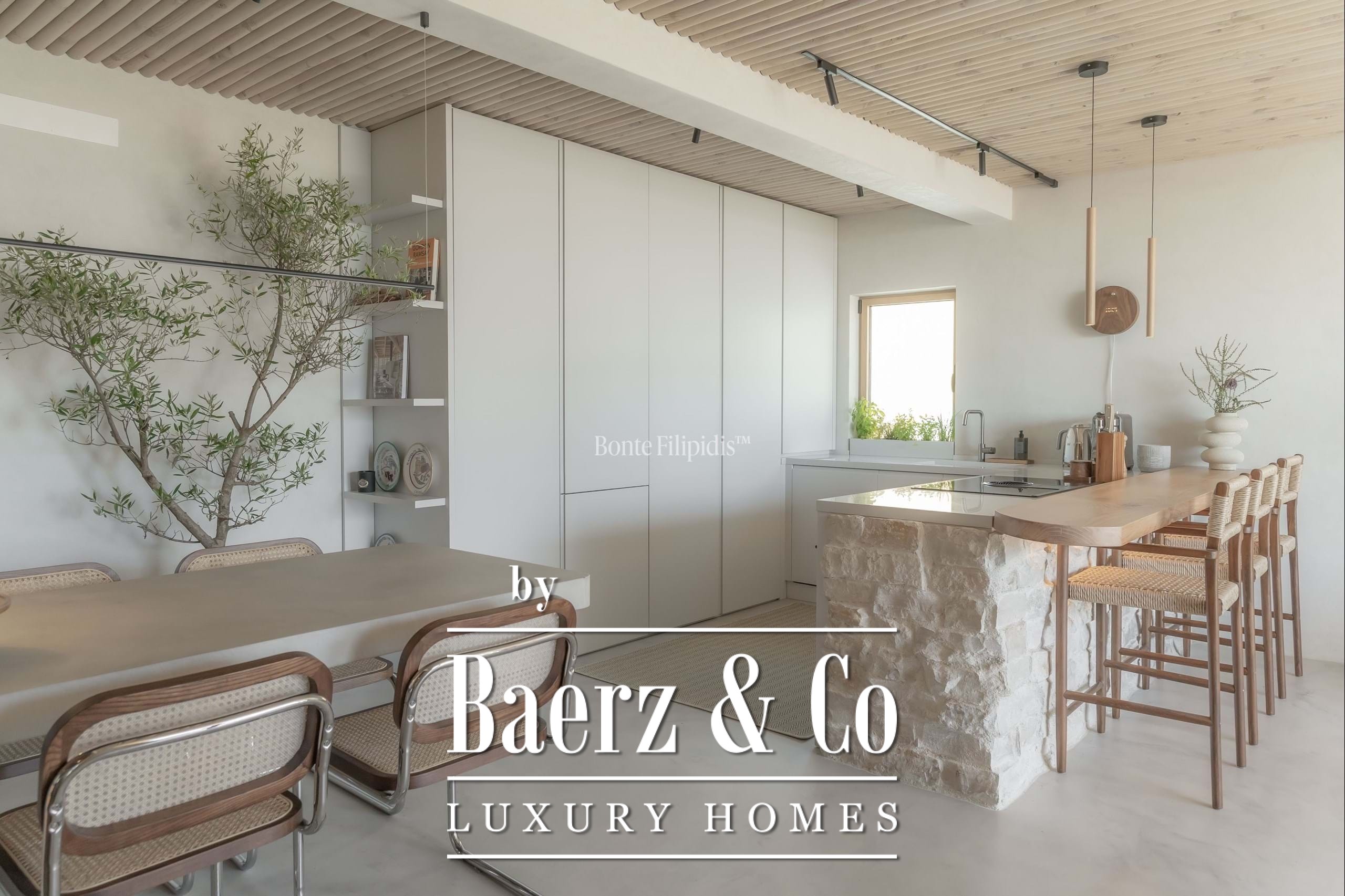 The 88 m² layout offers a seamless flow between the open-plan living room, dining area, and kitchen, all with high-quality finishes and fully integrated appliances. The living room leads to a 19 m² terrace featuring a bar as well as an outdoor shower for cooling off under the sky, offering a calm vantage over the bay. In the private area, the en-suite bedroom ensures privacy, while the second bedroom features sea views, its own balcony, and an independent, full bathroom.