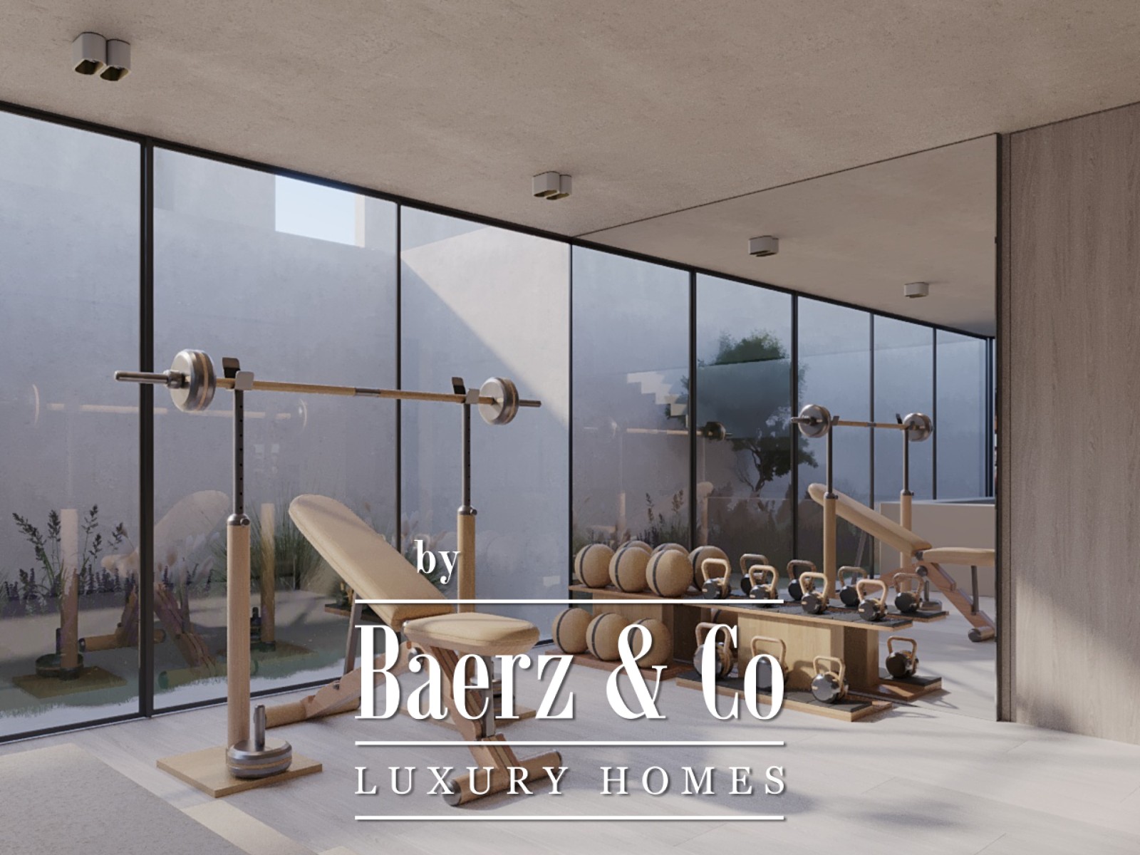The lower level balances utility and leisure, featuring a spacious garage, a fully equipped gym, an indoor pool, a sauna, technical rooms and storage, as well as an informal living room and two bathrooms. The ground floor unfolds into an elegant living and dining area, a modern kitchen, home office, interior garden, and seamless access to an outdoor deck with a striking infinity pool—spaces that invite both relaxation and refined entertaining.