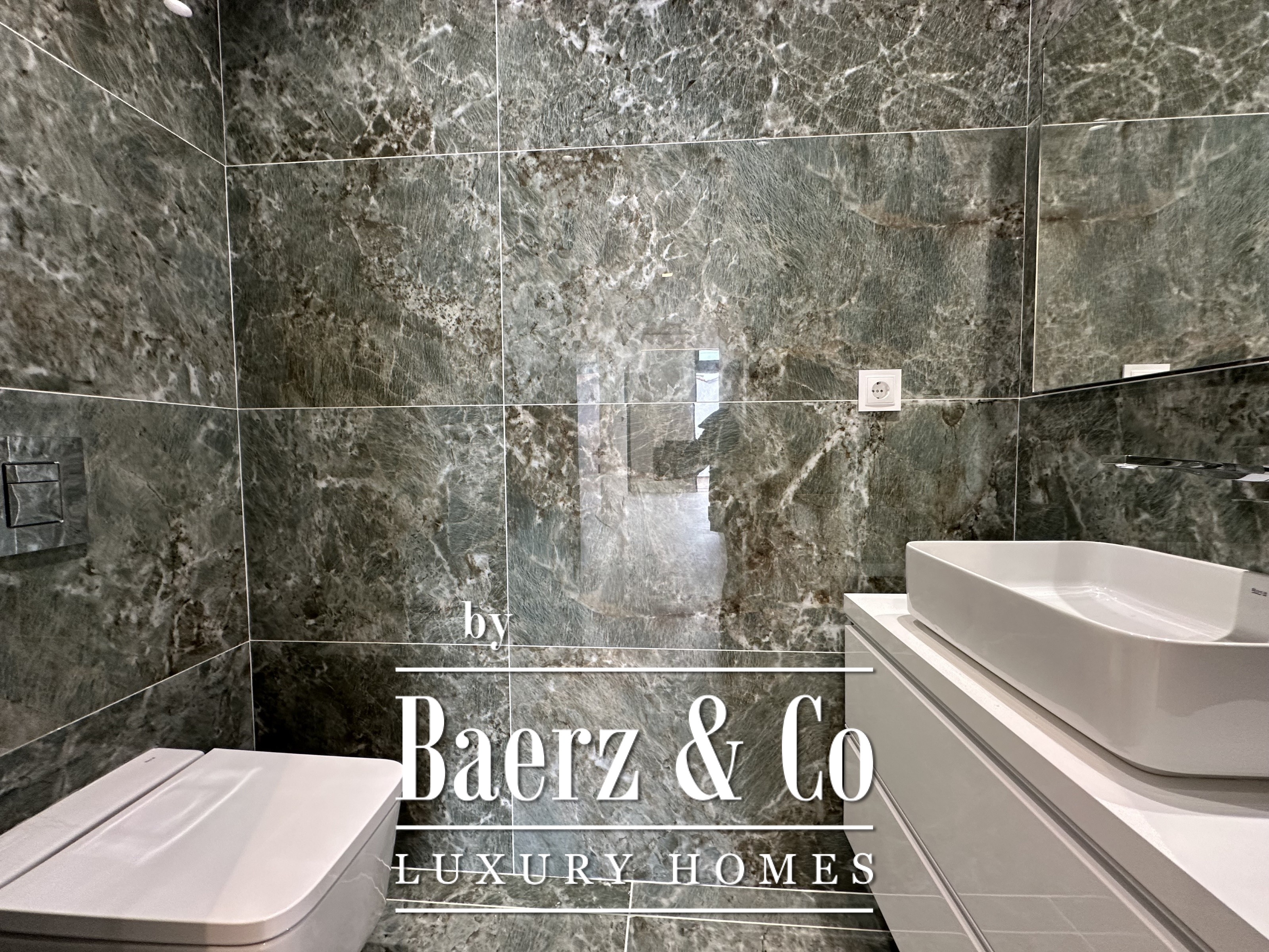 Outdoors, lush gardens with fruit trees envelop a 124 m² private terrace and a dedicated swimming pool, establishing a tranquil green haven. The home integrates advanced smart technology throughout, including garden and house solutions for efficiency and ease. The villa also features a 72 m² garage, laundry, and additional technical areas for total convenience.