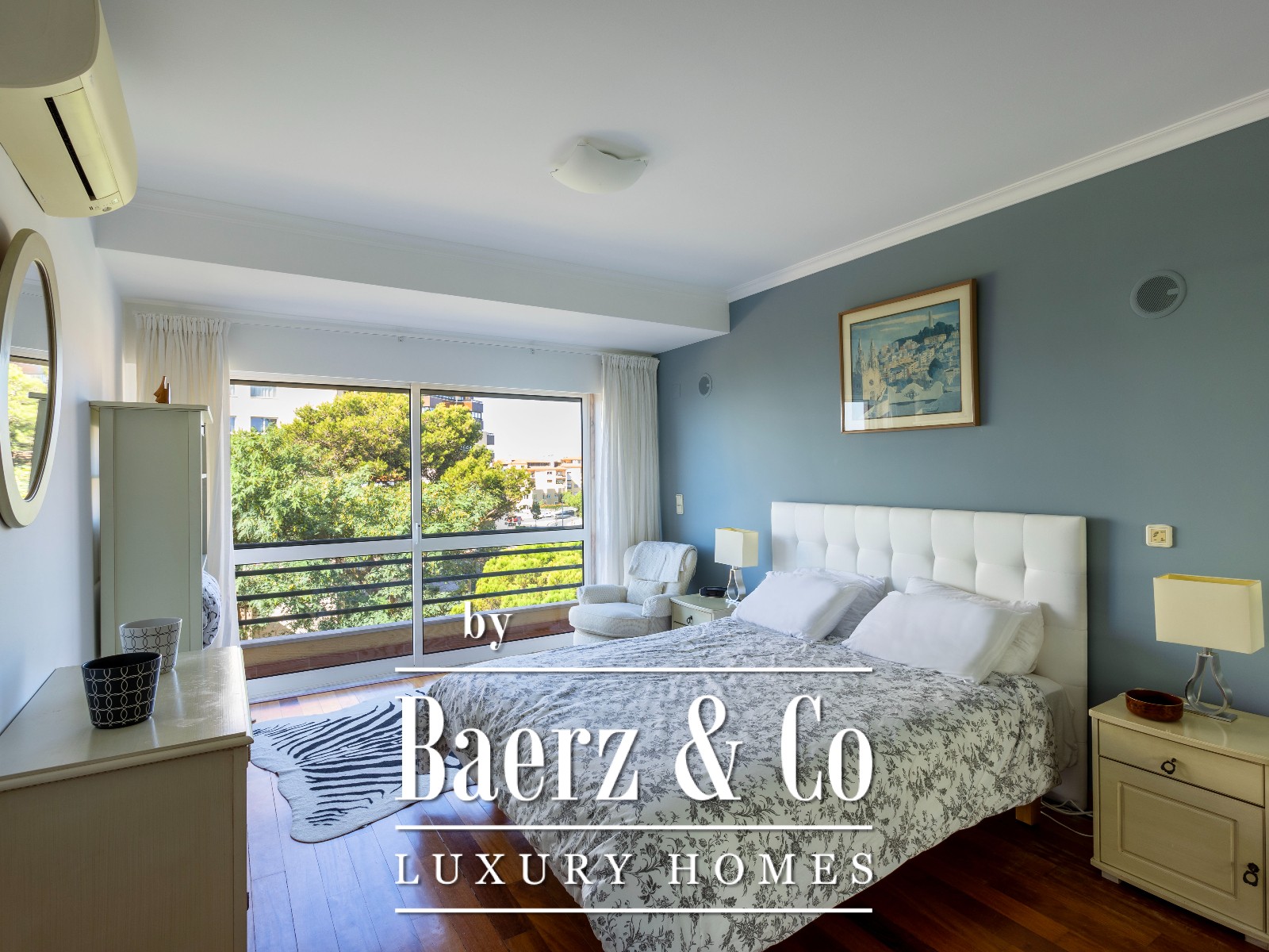 A modern, fully equipped kitchen extends onto a balcony. The home benefits from air conditioning, double glazing, and electric shutters, and is offered fully furnished and equipped. Amenities include a private pool, mature garden, outdoor parking, 24-hour security, lift, garage, and a dedicated storage room. The location brings immediate access to Casa da Guia, Cascais Marina, key cycle routes, and renowned schools such as Salesianos do Estoril and Saint Julian's.