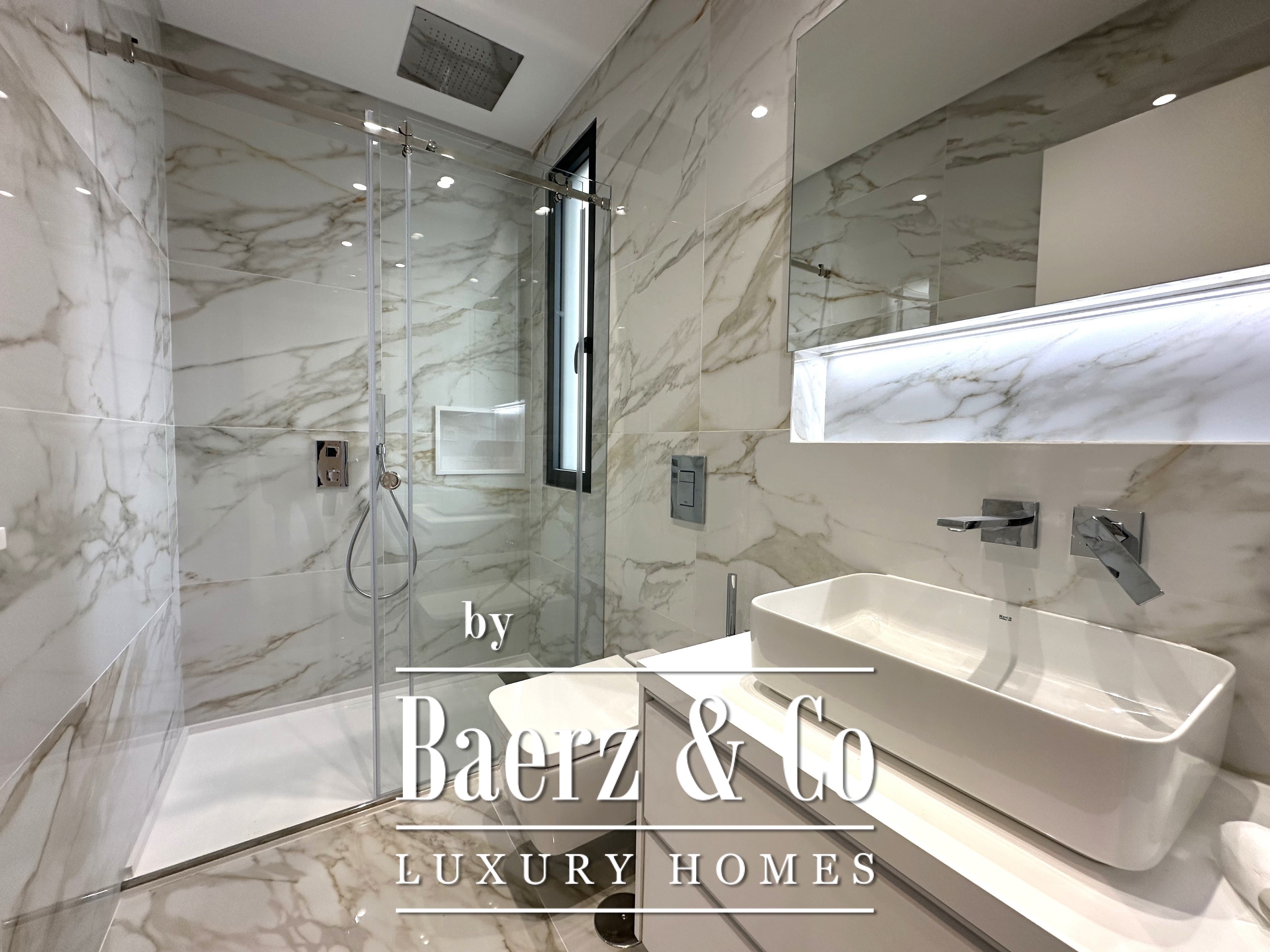 The lower level features three further suites, sized at 27 m², 13.43 m², and 12 m², each finished to a high standard. The absence of built-in wardrobes opens possibilities for fully custom interiors. An expansive terrace of 106 m² crowns the residence, offering views and space for outdoor leisure, supported by a 27 m² technical area. Additional amenities include a private garage of 72 m², an 8 m² laundry room, and further technical storage.