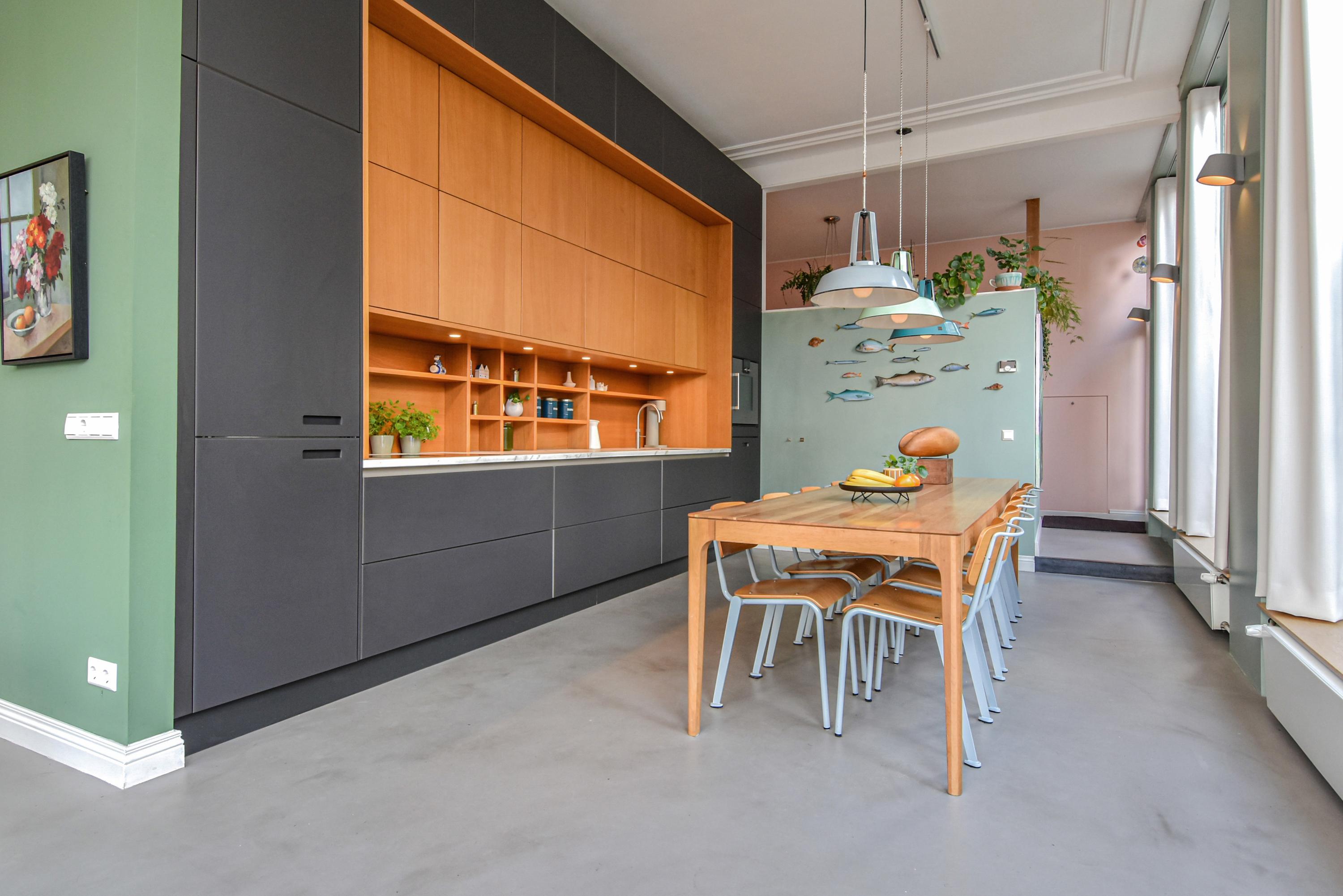 Upon entering, you are immediately impressed by the beautiful living kitchen with its strikingly high glass façades and an impressive ceiling height of no less than 3.55 meters. The original stucco decorative moulding has been preserved. The space is filled with light and offers ample room for a large dining table. The stylishly finished kitchen forms the heart of the home—a wonderful space equipped with luxury built-in appliances, perfect for cooking and entertaining guests.