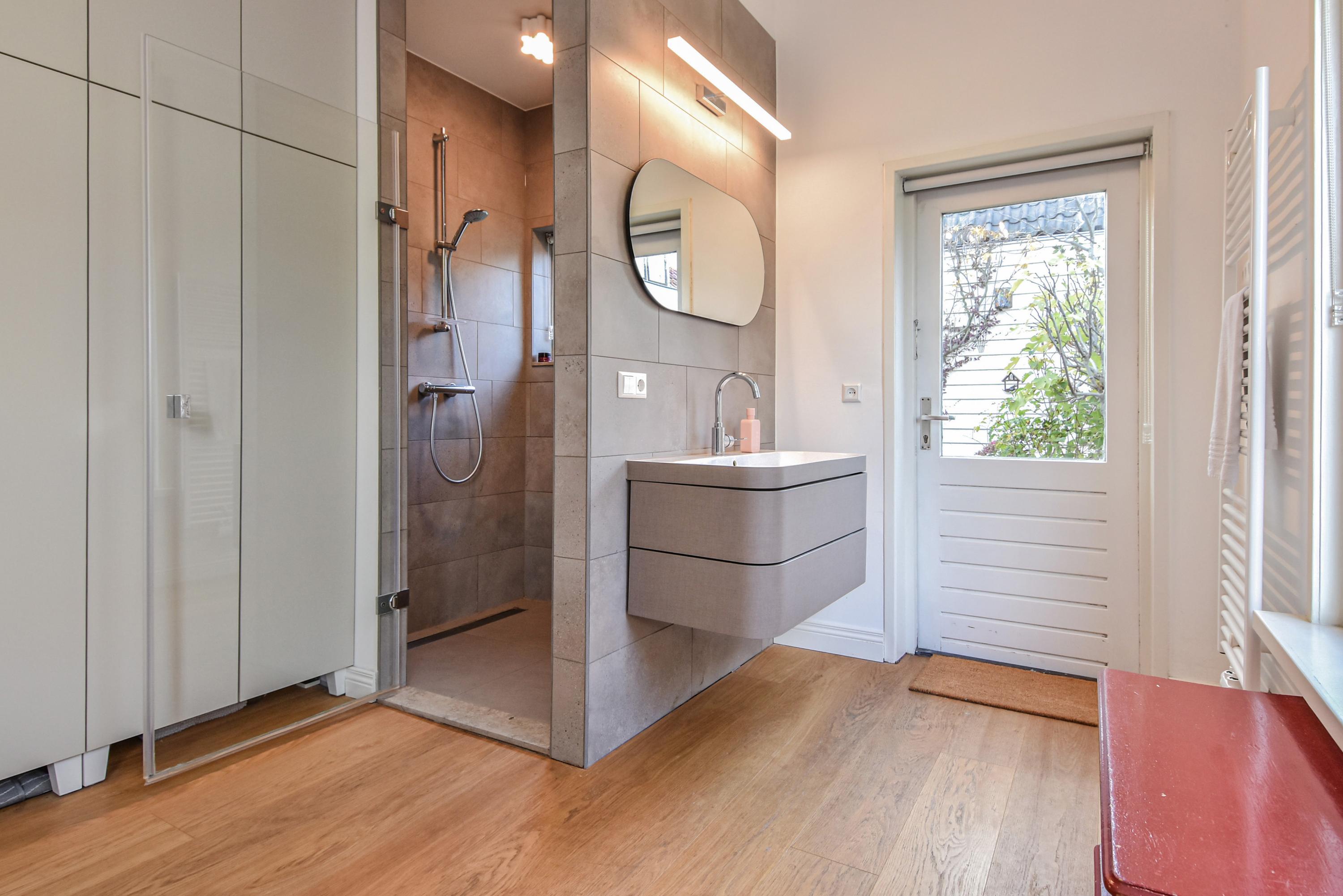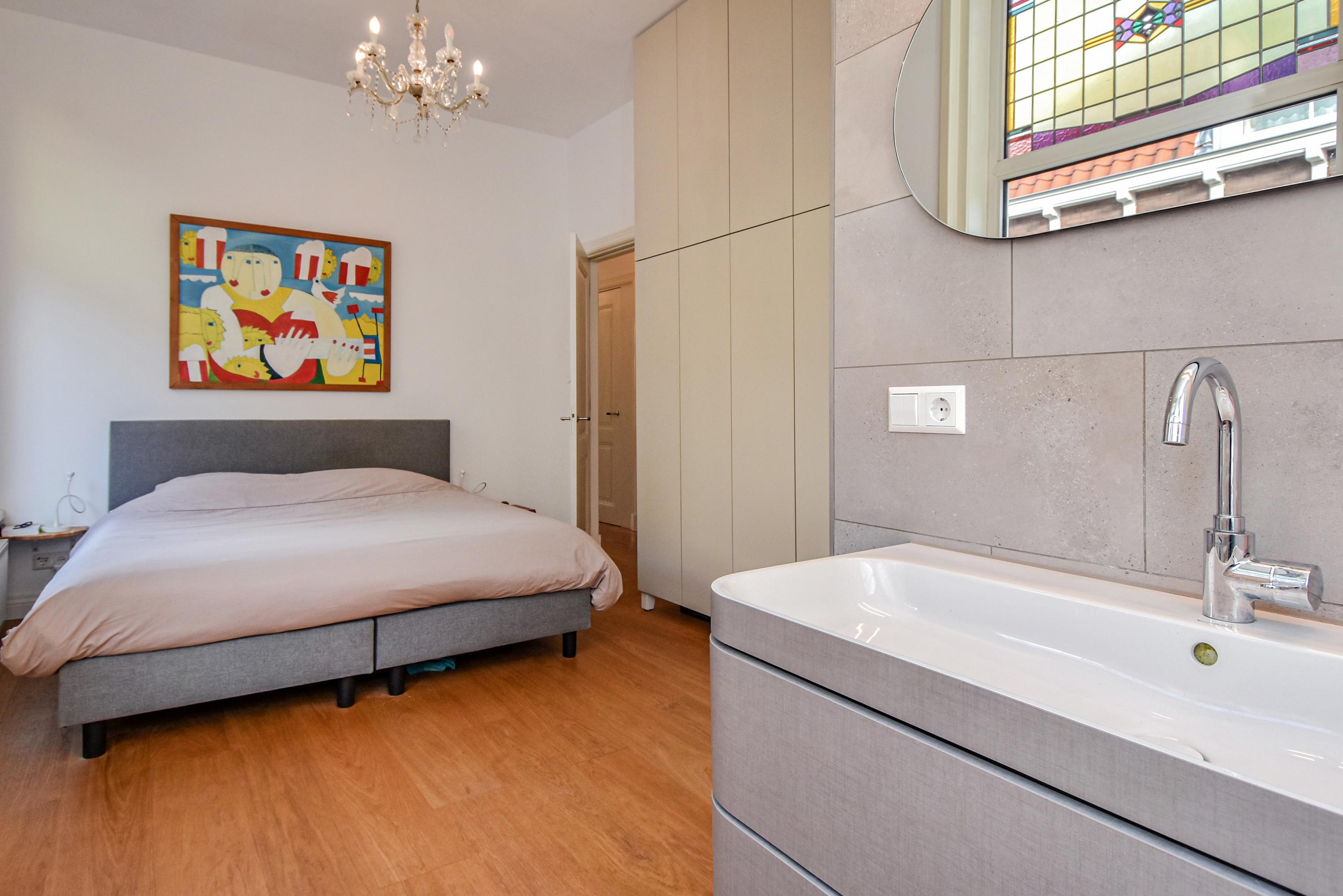 The landing provides access to a separate toilet with washbasin and additional storage space. The spacious and bright front bedroom features a high ceiling and a beautiful view over the canal. There are two additional large bedrooms, one with a walk-in shower and washbasin. All bedrooms are adorned with stained-glass windows. A separate laundry room gives access to the roof garden—a delightful, sheltered spot with optimal sunlight. From early morning until late evening, you can enjoy the sun, privacy, and a charming green setting. The terrace also includes a large wooden storage shed.