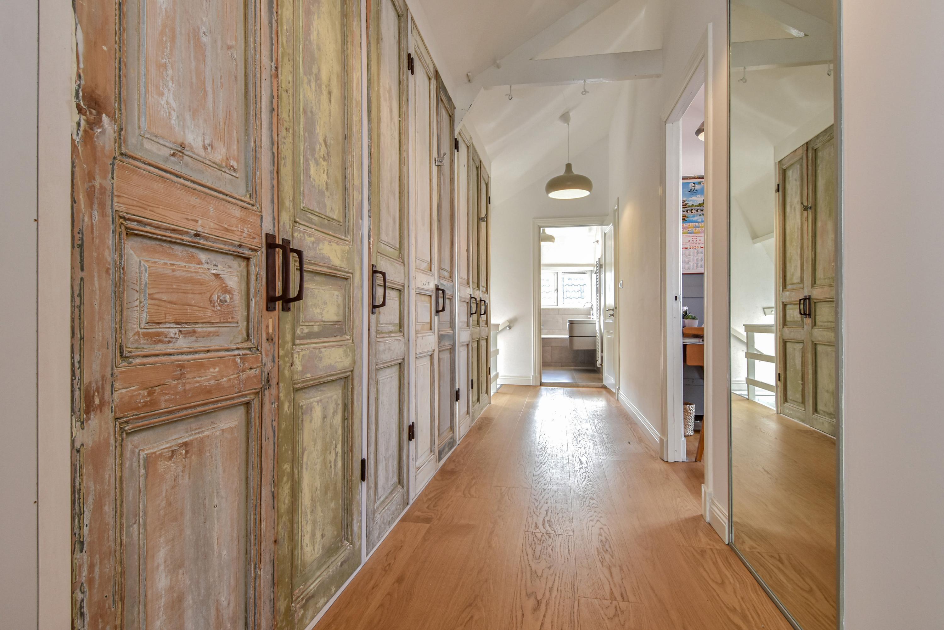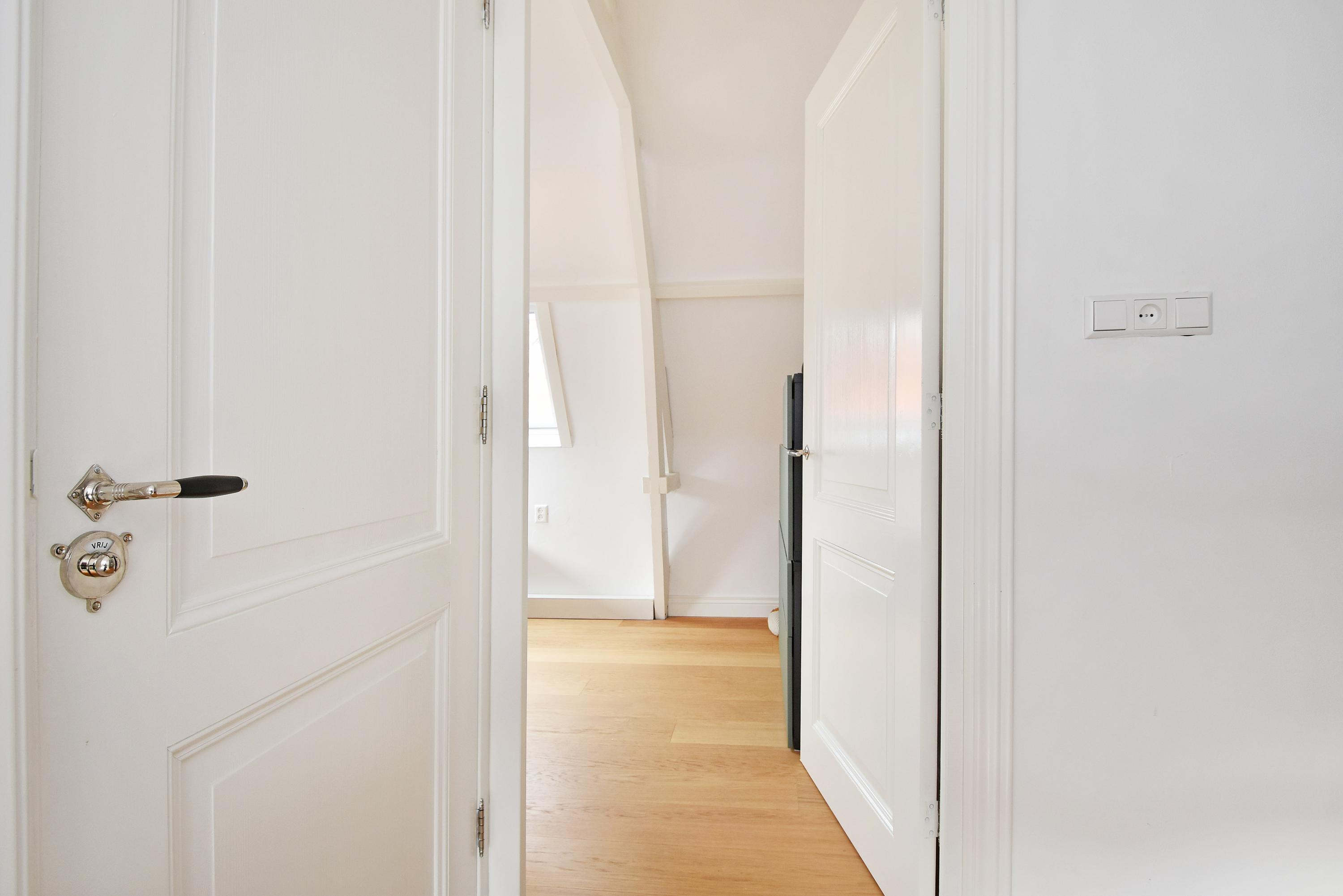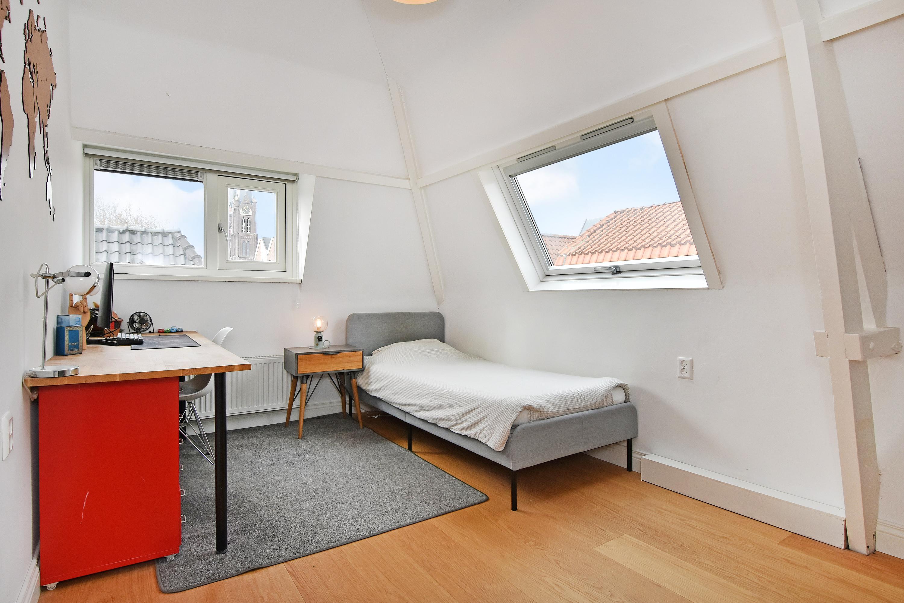 The second floor is surprisingly spacious. A long hallway with built-in cupboards and characteristic antique doors provides access to 3 more bedrooms. At the front, there is a large room with a skylight, dormer window, and open roof where the original beam structure is visible. The second bedroom features a tall dormer with an authentic hoisting beam, while at the rear there is another pleasant bedroom with dormer and skylight, offering views of Delft’s church towers. The luxurious bathroom is fully equipped with a bathtub, walk-in shower, fourth toilet, designer washbasin unit, and towel radiator.