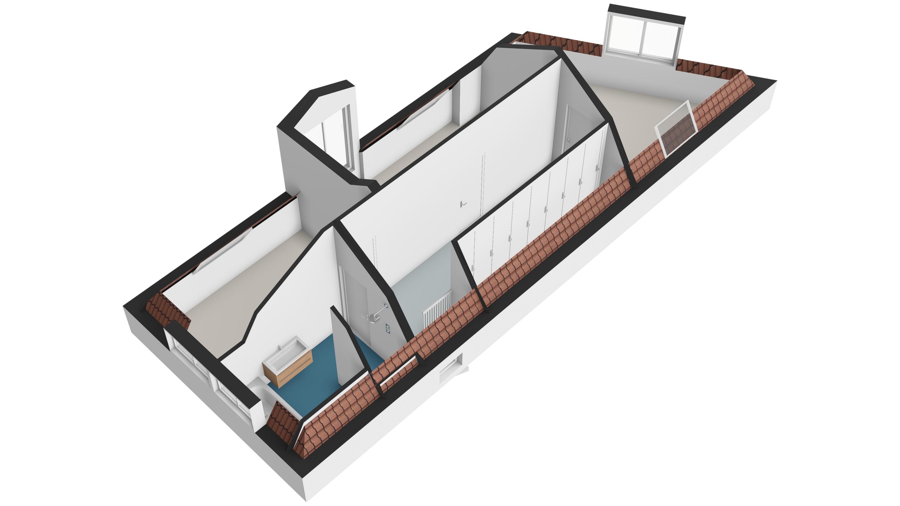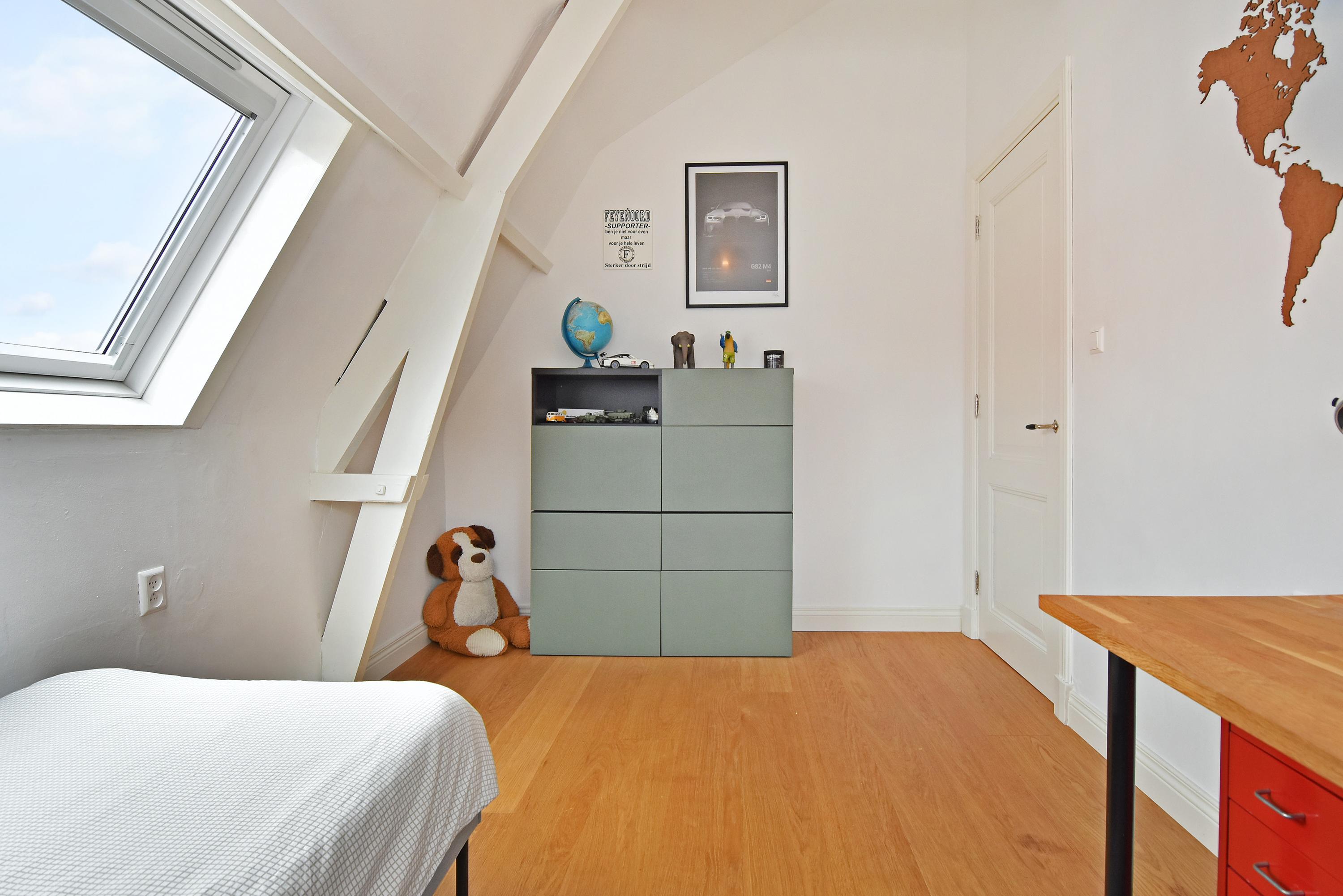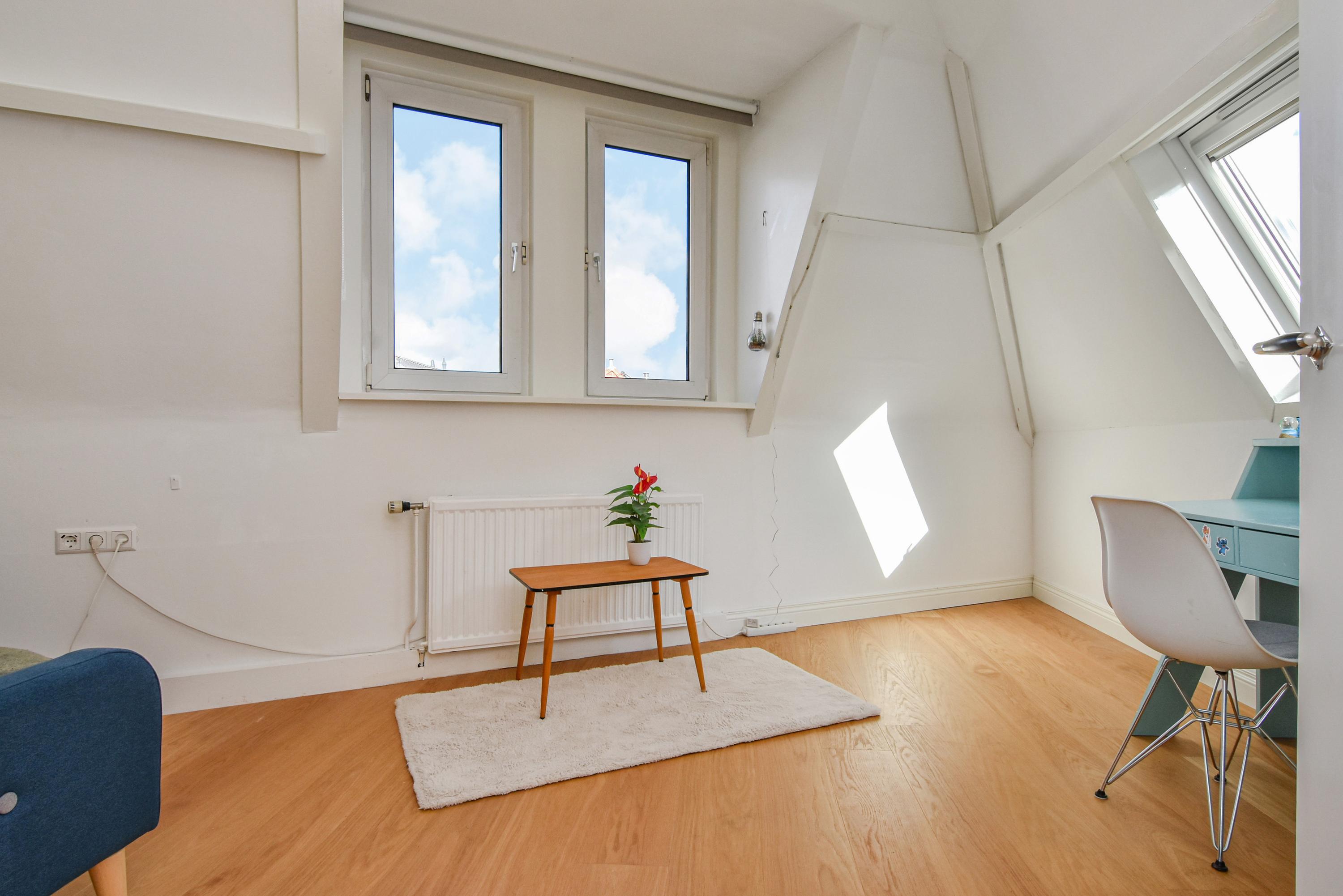 The second floor is surprisingly spacious. A long hallway with built-in cupboards and characteristic antique doors provides access to 3 more bedrooms. At the front, there is a large room with a skylight, dormer window, and open roof where the original beam structure is visible. The second bedroom features a tall dormer with an authentic hoisting beam, while at the rear there is another pleasant bedroom with dormer and skylight, offering views of Delft’s church towers. The luxurious bathroom is fully equipped with a bathtub, walk-in shower, fourth toilet, designer washbasin unit, and towel radiator.