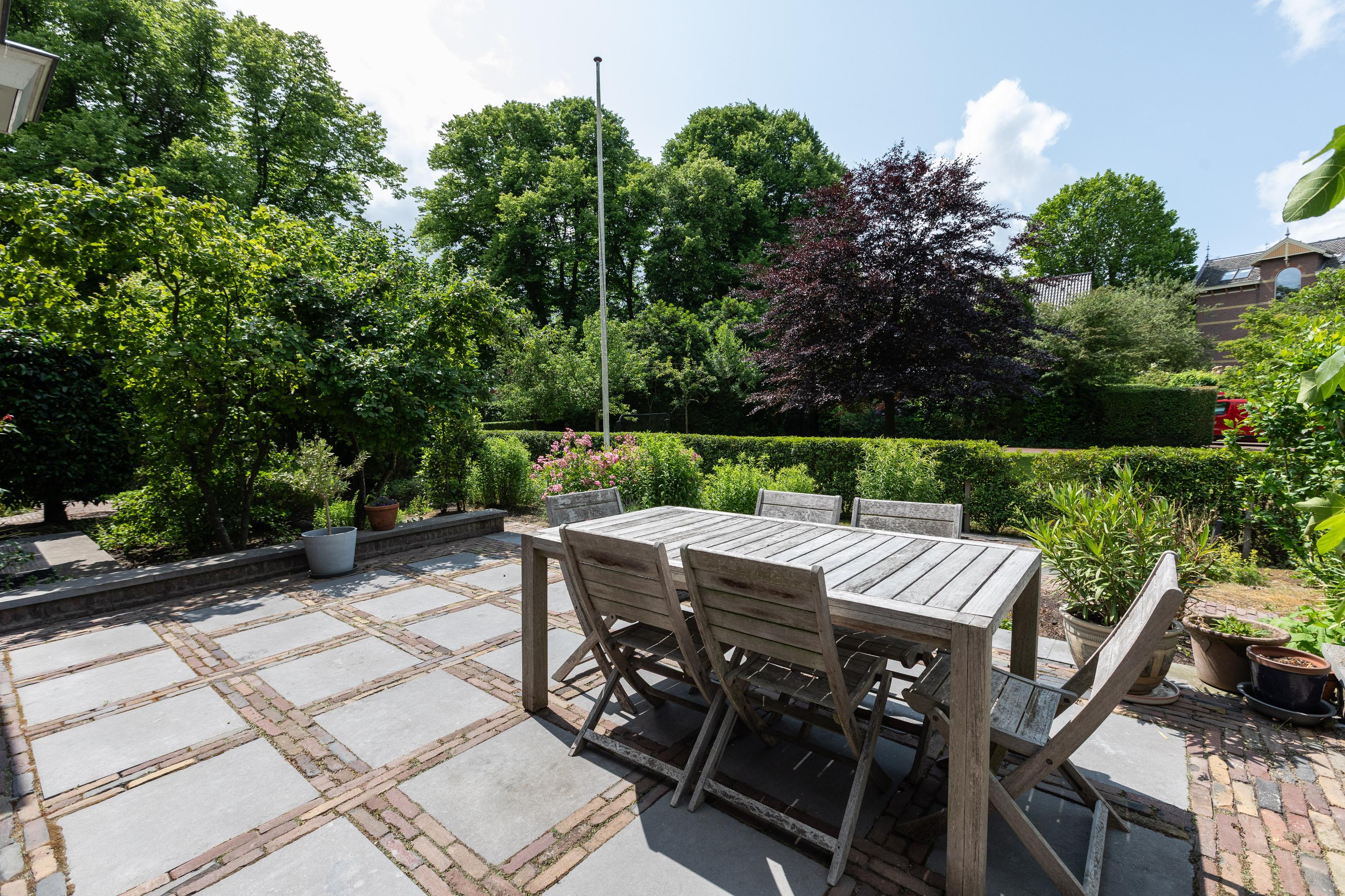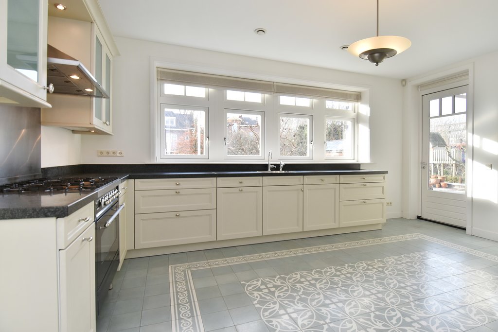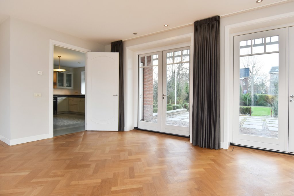 Entrance with wardrobe and meter cupboard. Spacious hallway with access to the study (3.80 x 3.40 m). Guest toilet. Living room with elegant herringbone parquet flooring and fireplace. Multiple French doors provide access to the surrounding garden. Large open-plan Siematic kitchen (4.18 x 5.30 m) equipped with an American-style fridge/freezer, 6-burner gas hob with oven, extractor hood, dishwasher, and a separate combi microwave/oven. Utility room with washing machine and dryer connections. Sunny, generous terrace (6.05 x 6.22 m).