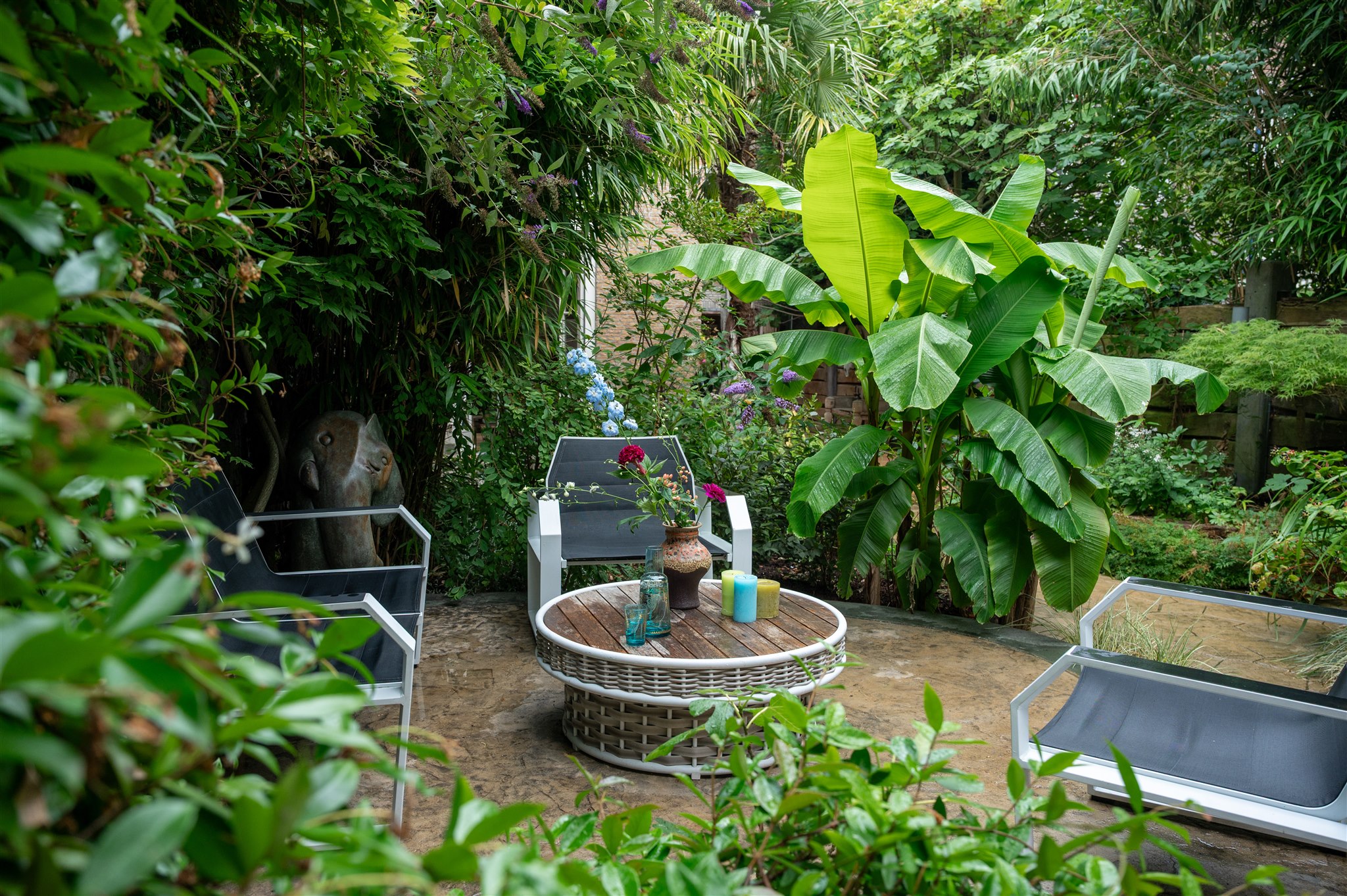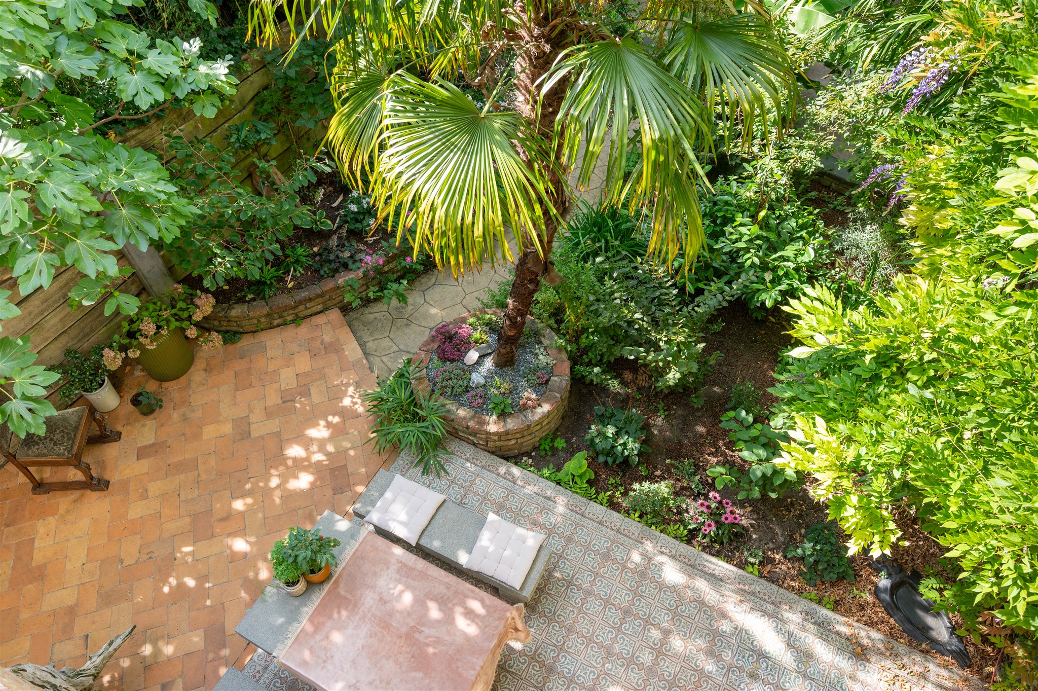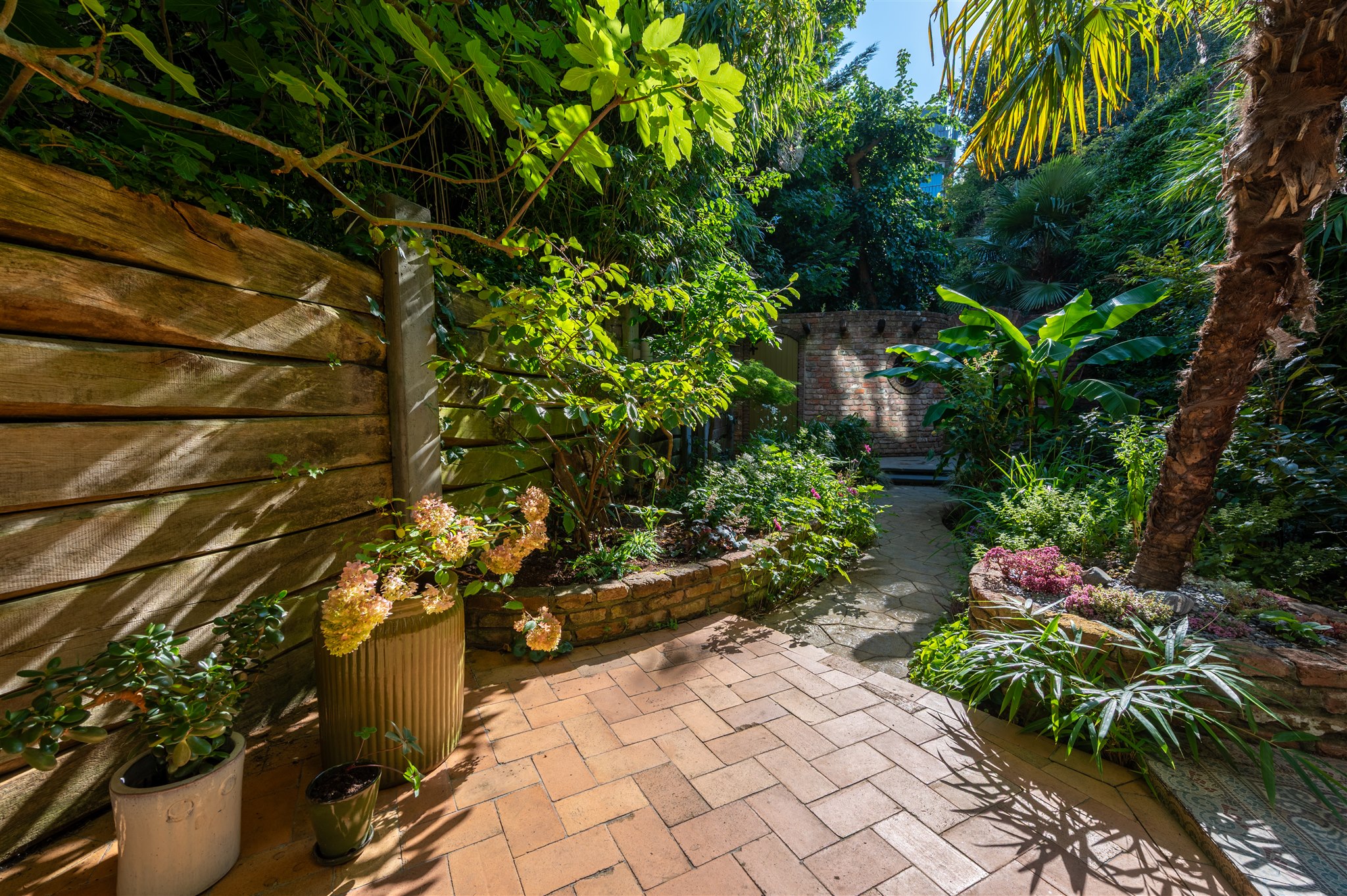 From the hallway, access is provided to the 27 m² vaulted cellar and further on to the garden room, complete with underfloor heating and painterly wall coverings. Adjacent is a small pantry/summer kitchen leading to a covered patio and the tropically landscaped rear garden of approx. 100 m². The garden includes a stone shed and rear access to the courtyard of the neighbouring complex, where three parking spaces are available by right of way.
