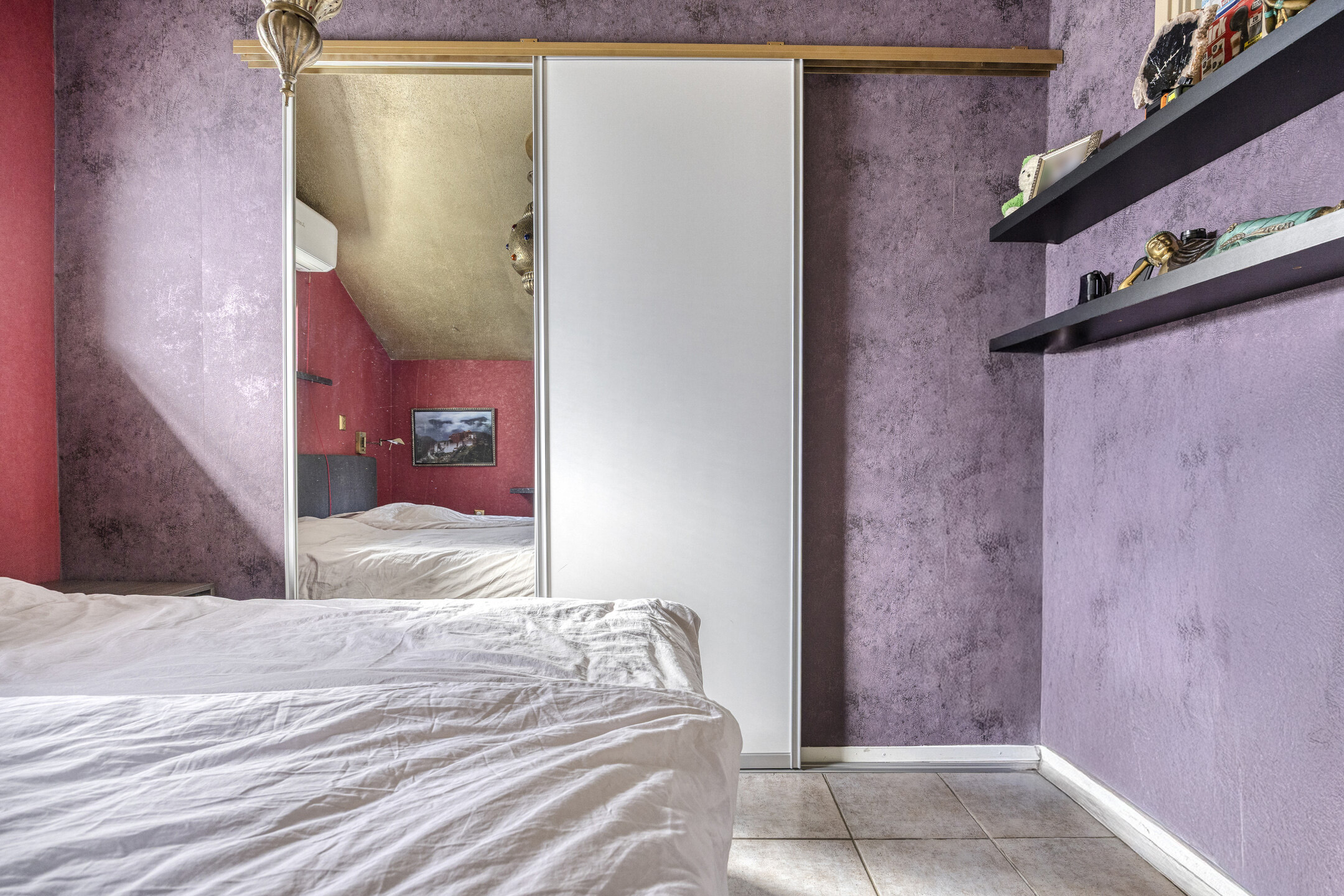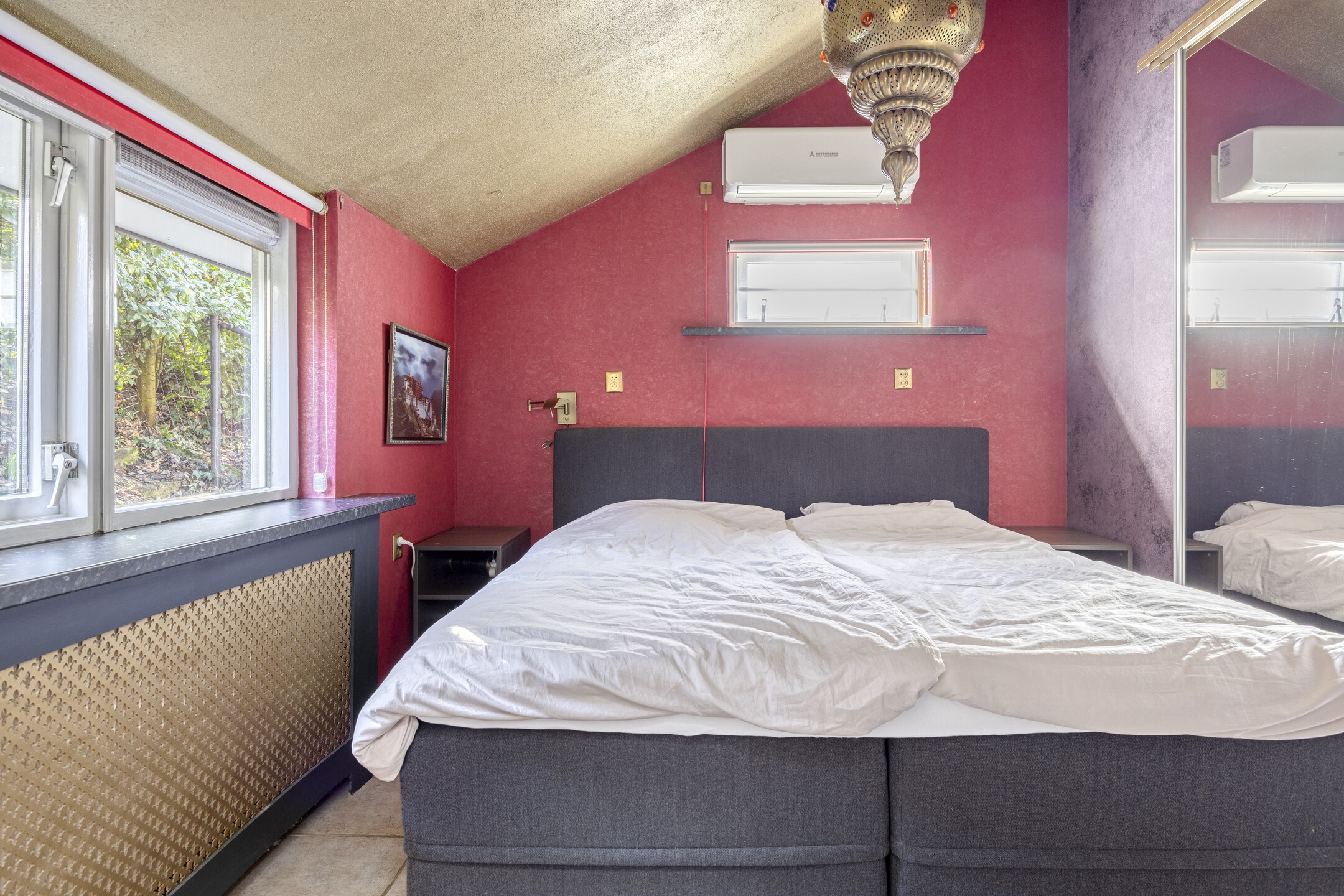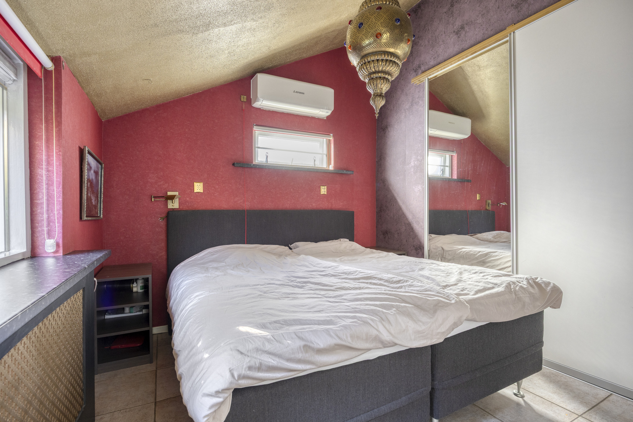 master bedroom with air conditioning and wardrobe wall, tiled floor, insulated stud walls for extra comfort, sprayed ceiling.
