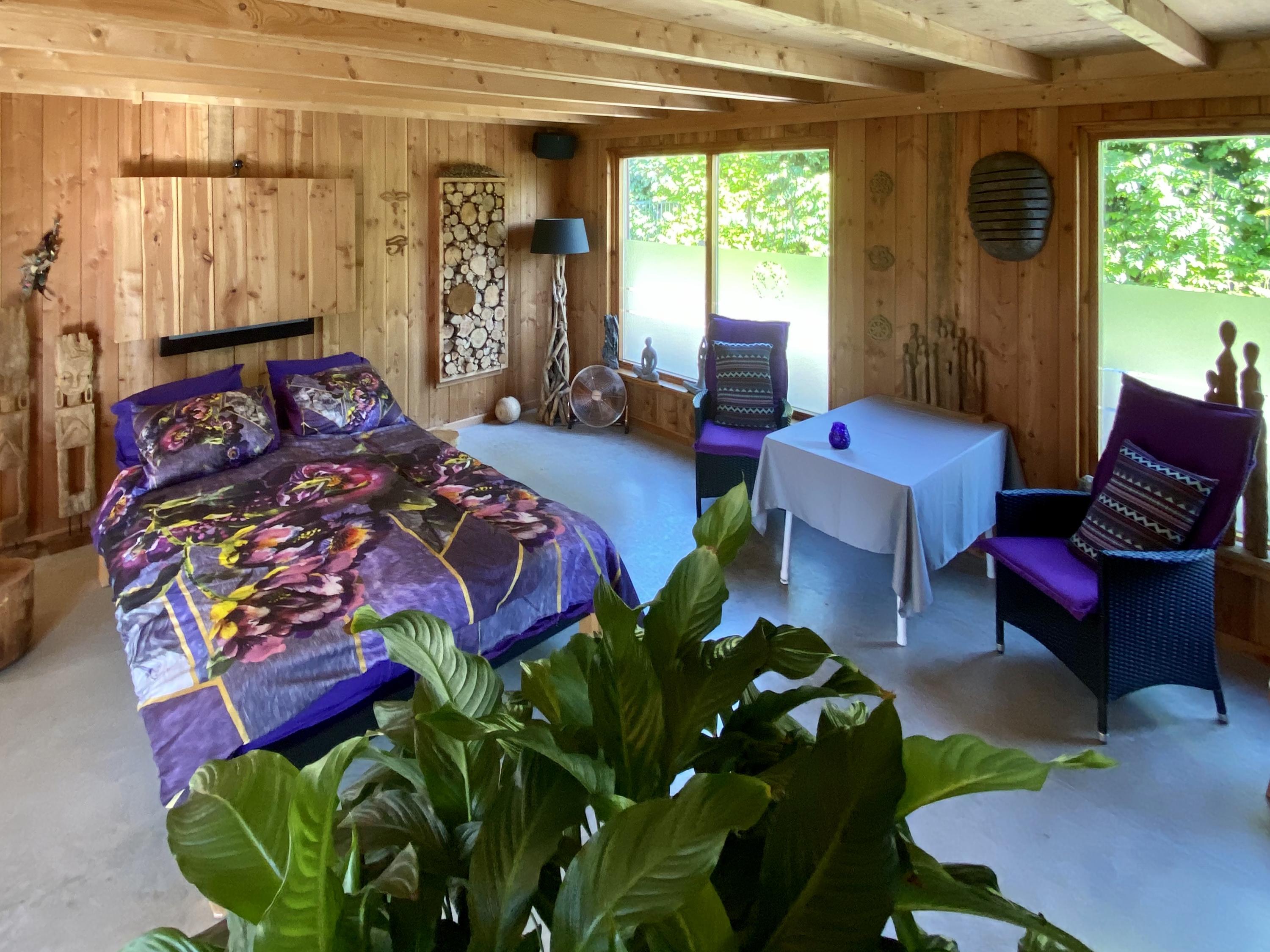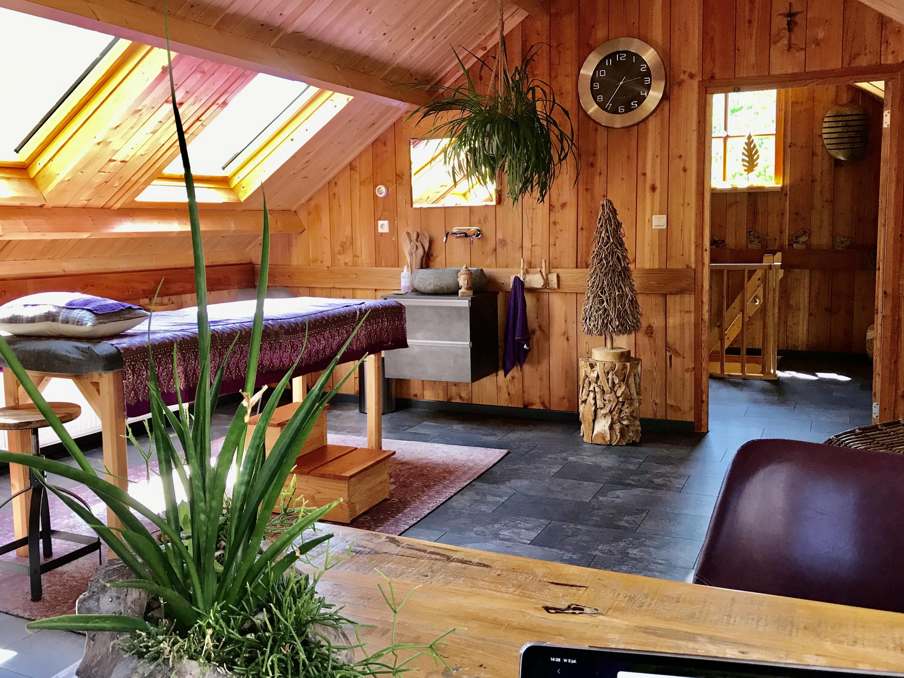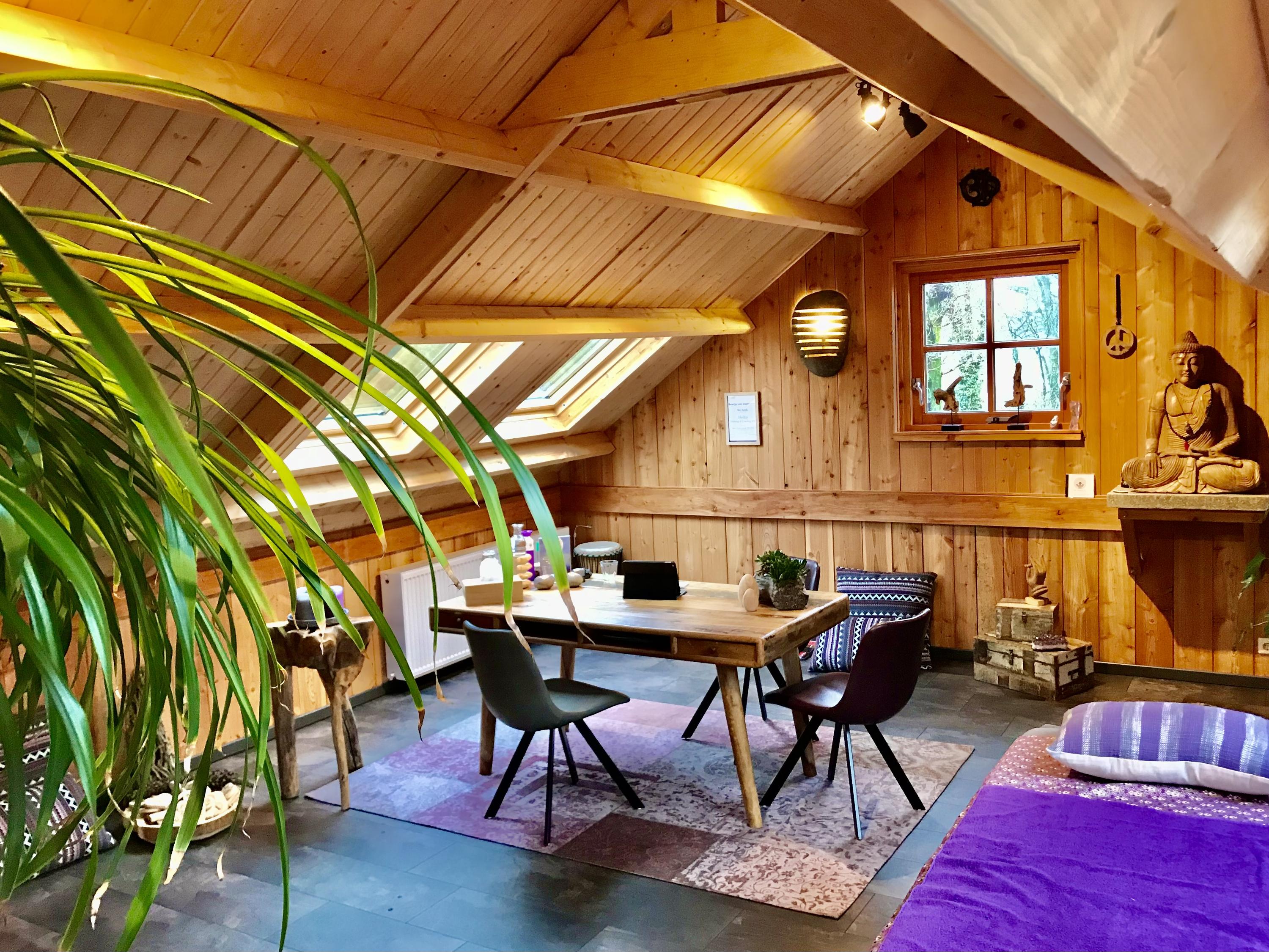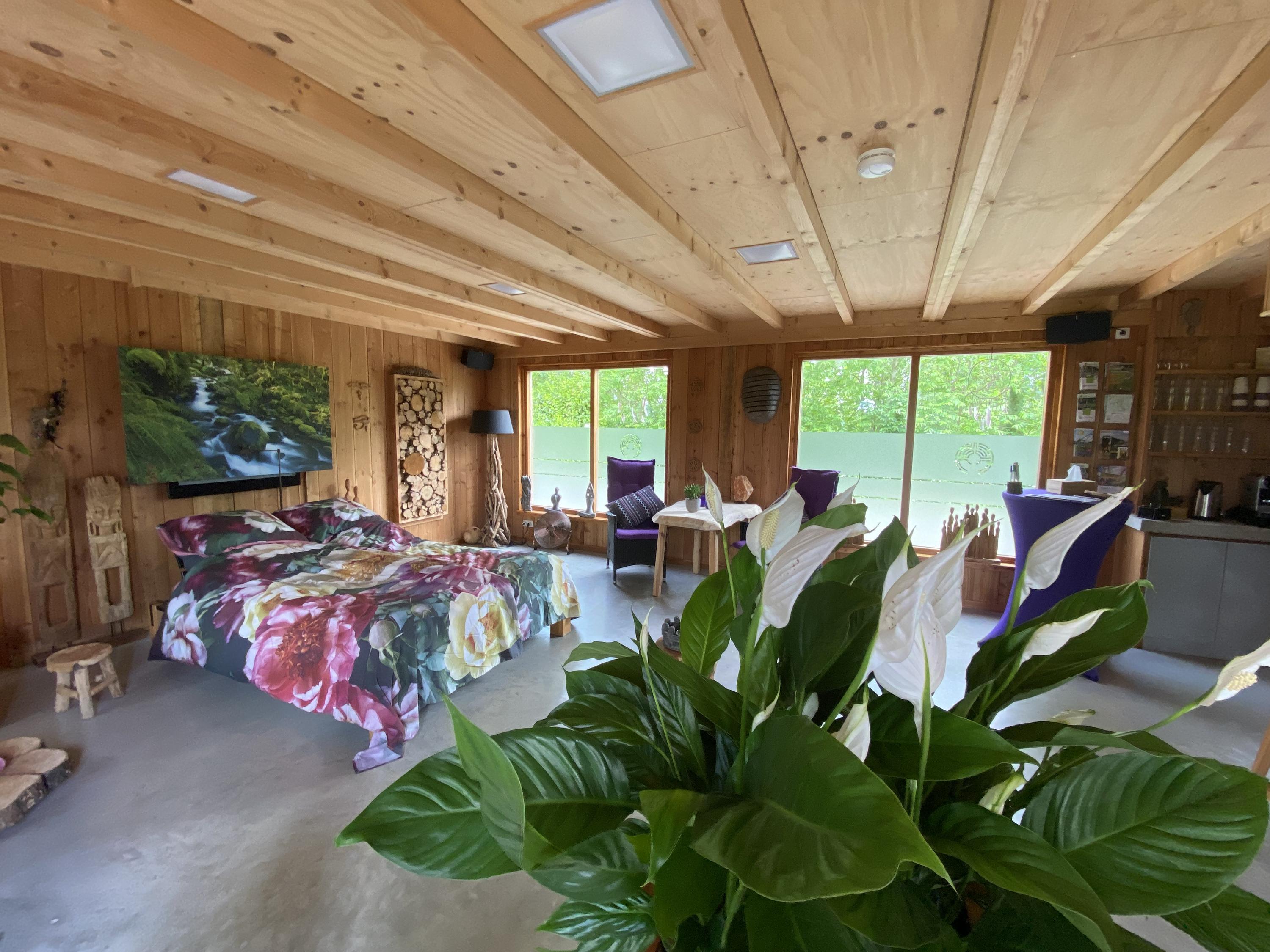 The outbuilding has recently been used for group sessions and has also been rented out via natuurhuisje.nl. The layout is practical and complete with on the ground floor a spacious living room/group area, a full kitchen and bathroom. On the first floor there is a landing with washing machine and dryer connections, its own central heating system and a second (bed)room equipped with air conditioning.