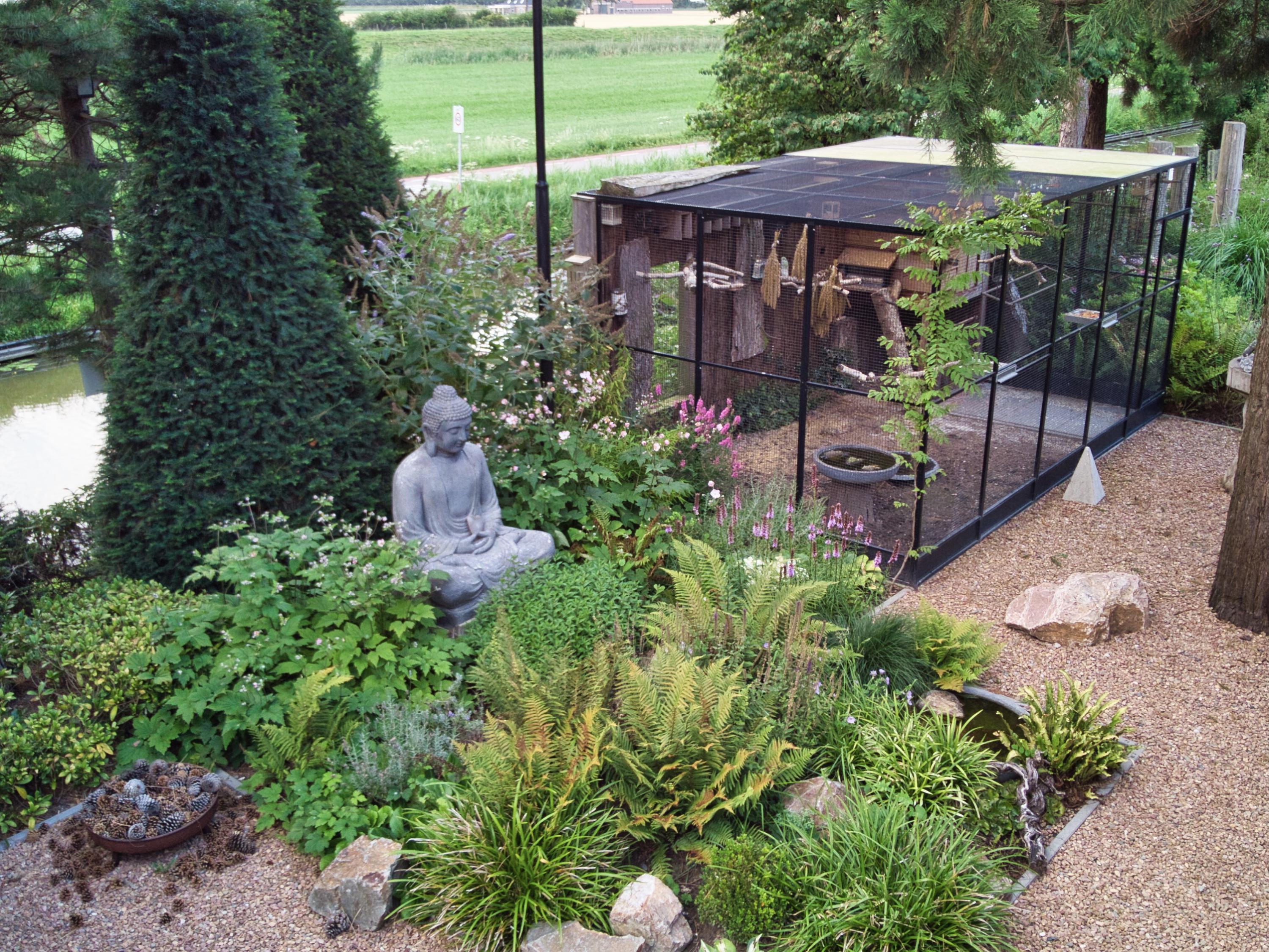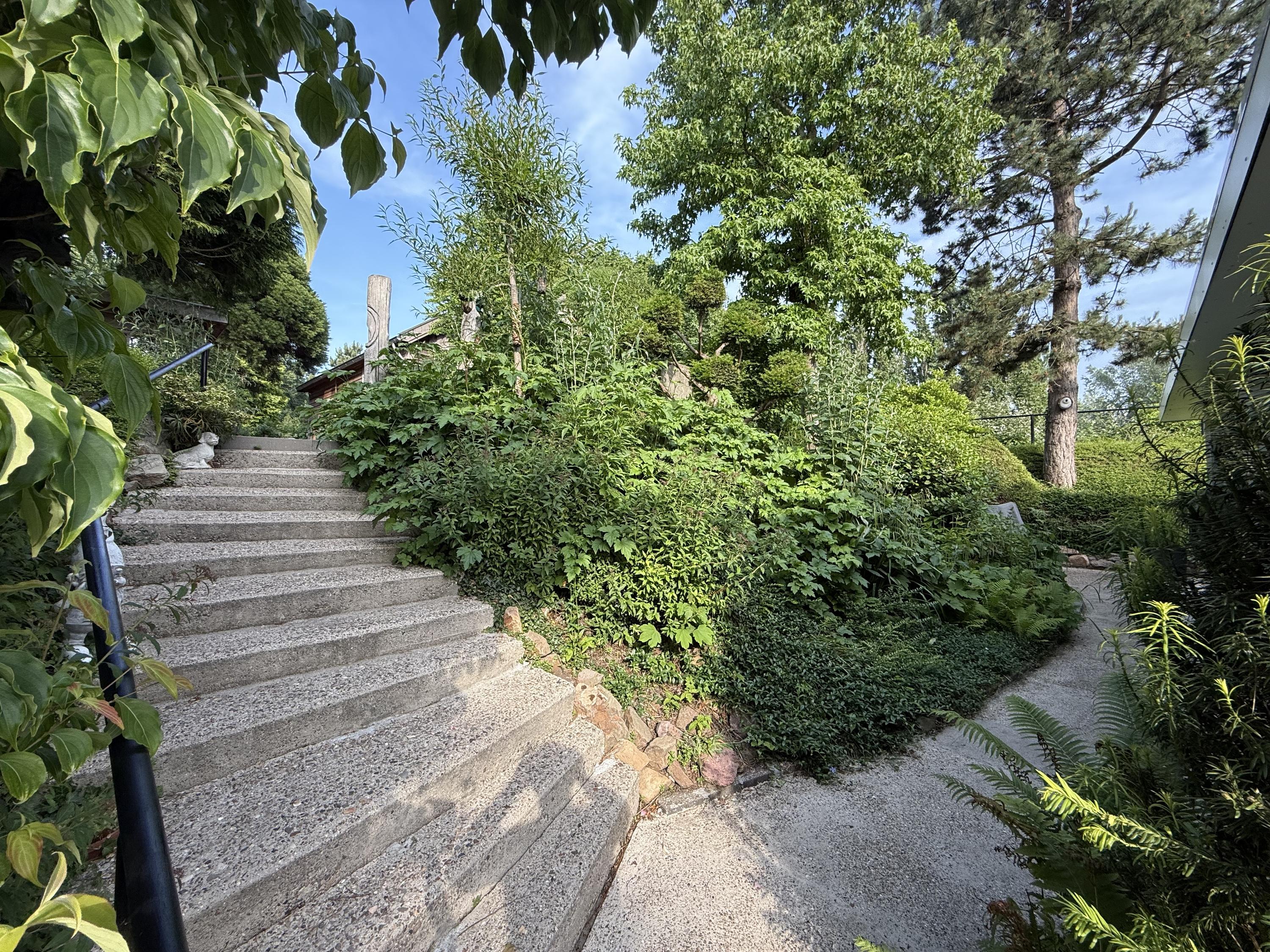 Stylishly landscaped and inspiring surrounding garden with Greenlabel A certification, designed in Japanese style with abundant greenery and multiple terraces, poured concrete paths (with steel mesh), borders, gravel paths, level differences, water bowls, wooden veranda, bird enclosure;