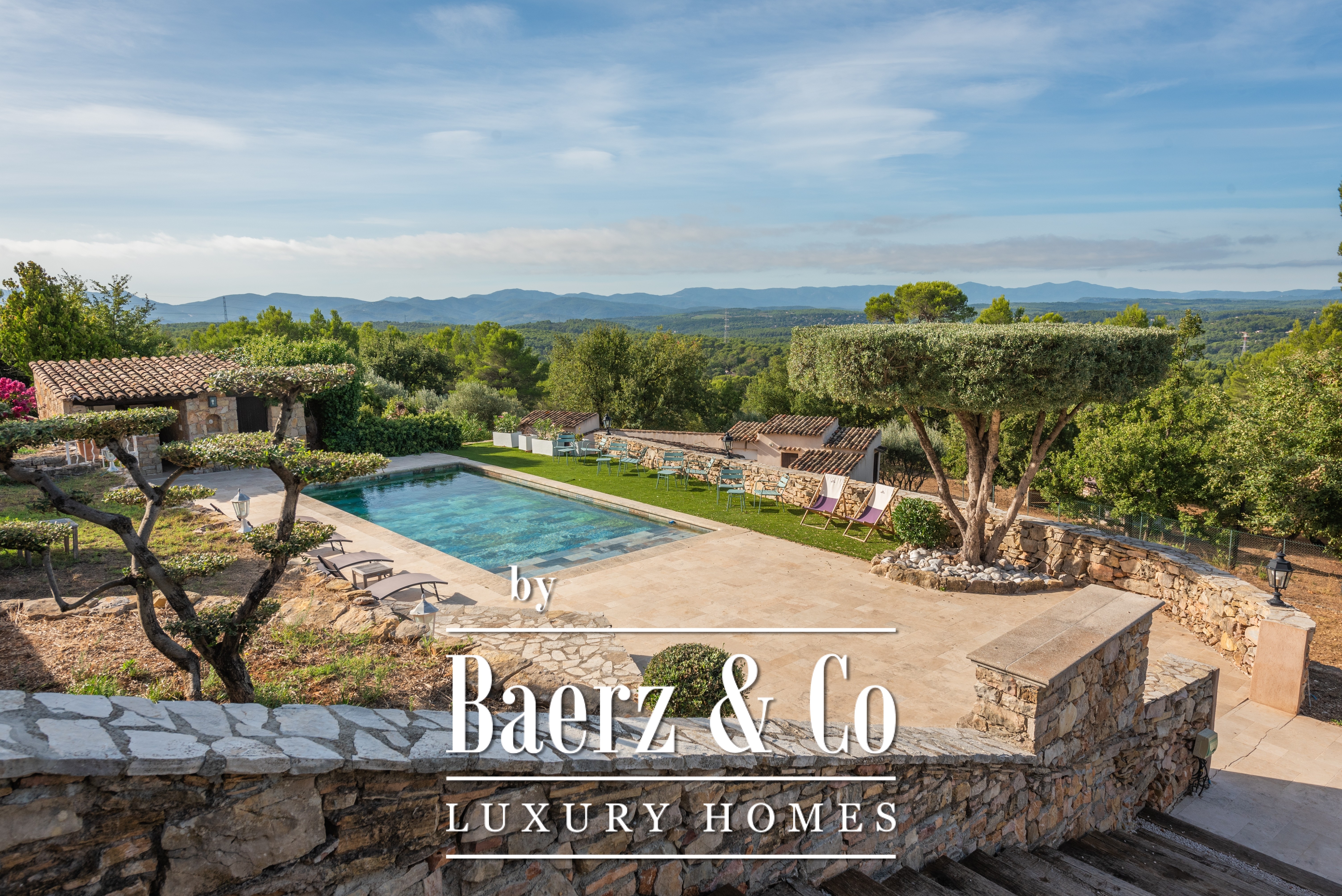 Villa Draguignan with panoramic mountain views rests above the town in a serene hillside setting, where nature and privacy define the experience. The estate unfolds across nearly 12,000 m² of quiet land, with sweeping 180° vistas framing the horizon. The villa’s architecture is measured and generous, offering a 222 m² main residence infused with natural light, and an independent 41 m² guesthouse situated below with its own private access.